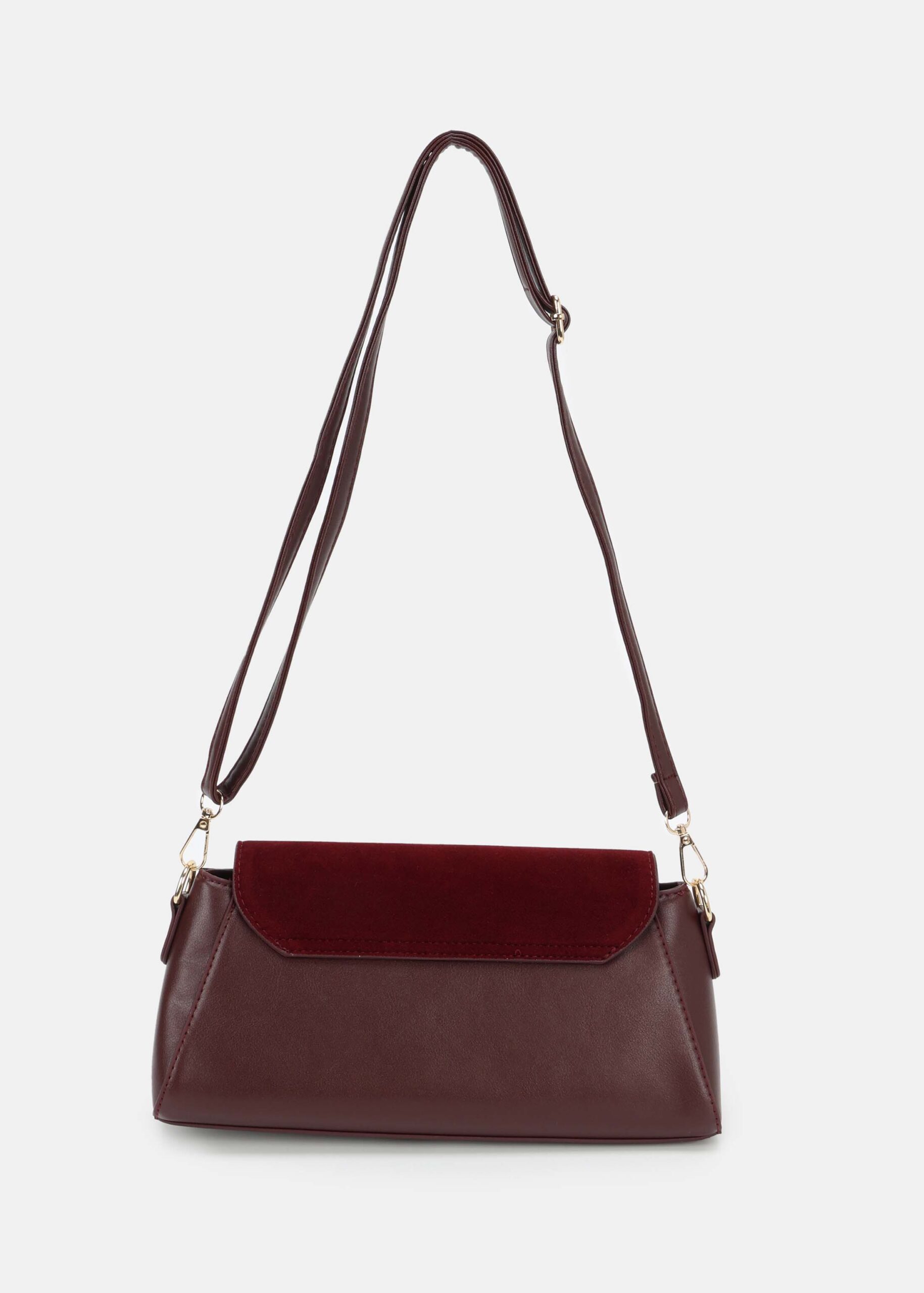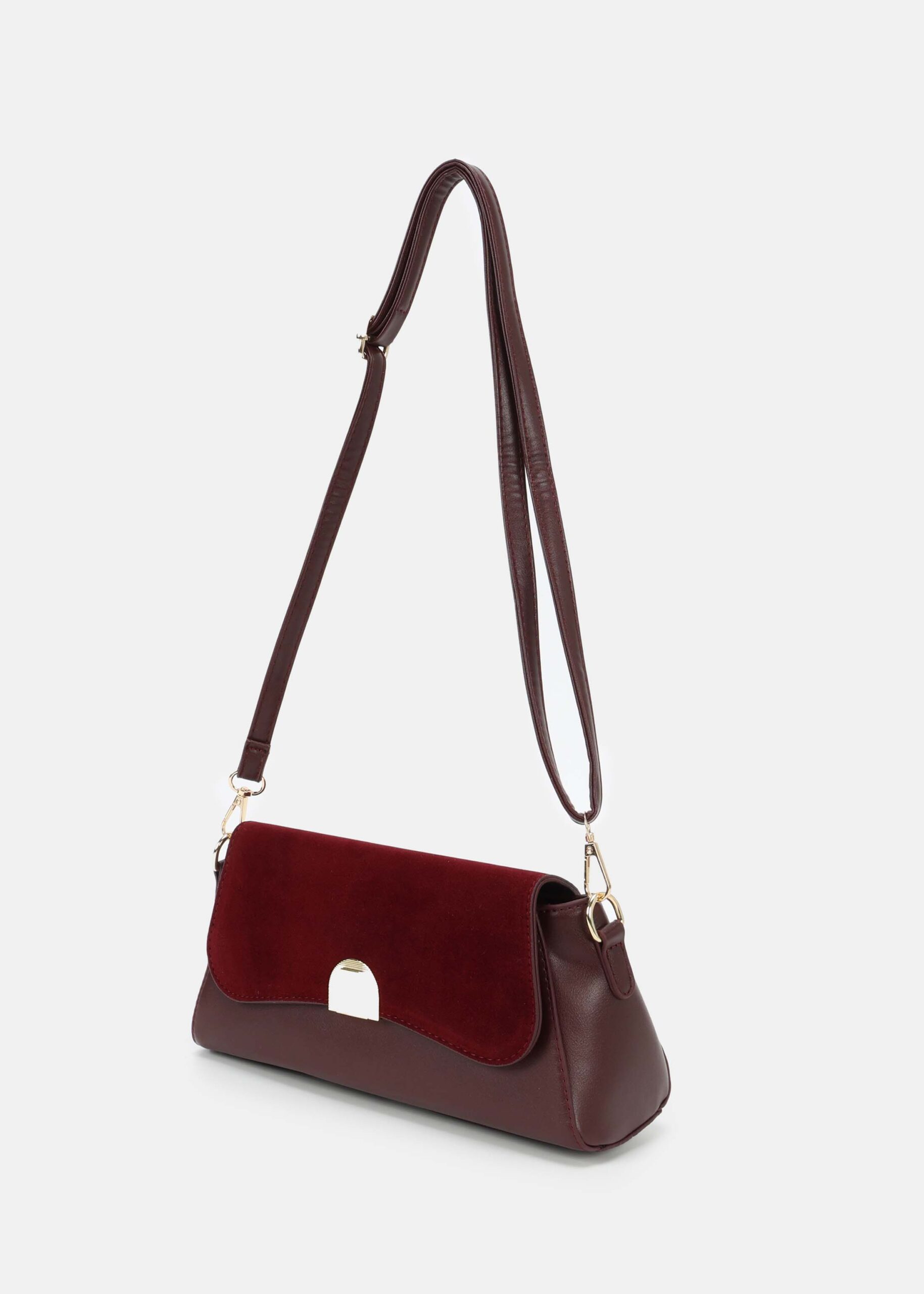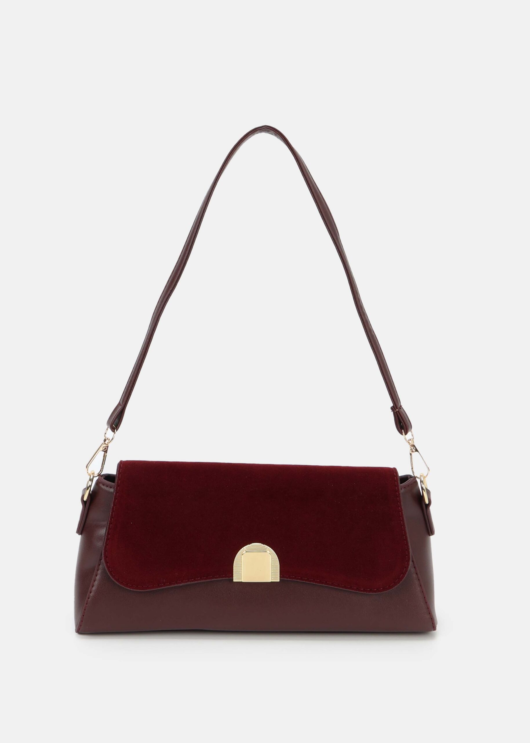 Women bag, leather and suede, front flap with snap button, adjustable and detachable shoulder strap, upper zip closure, unique and modern