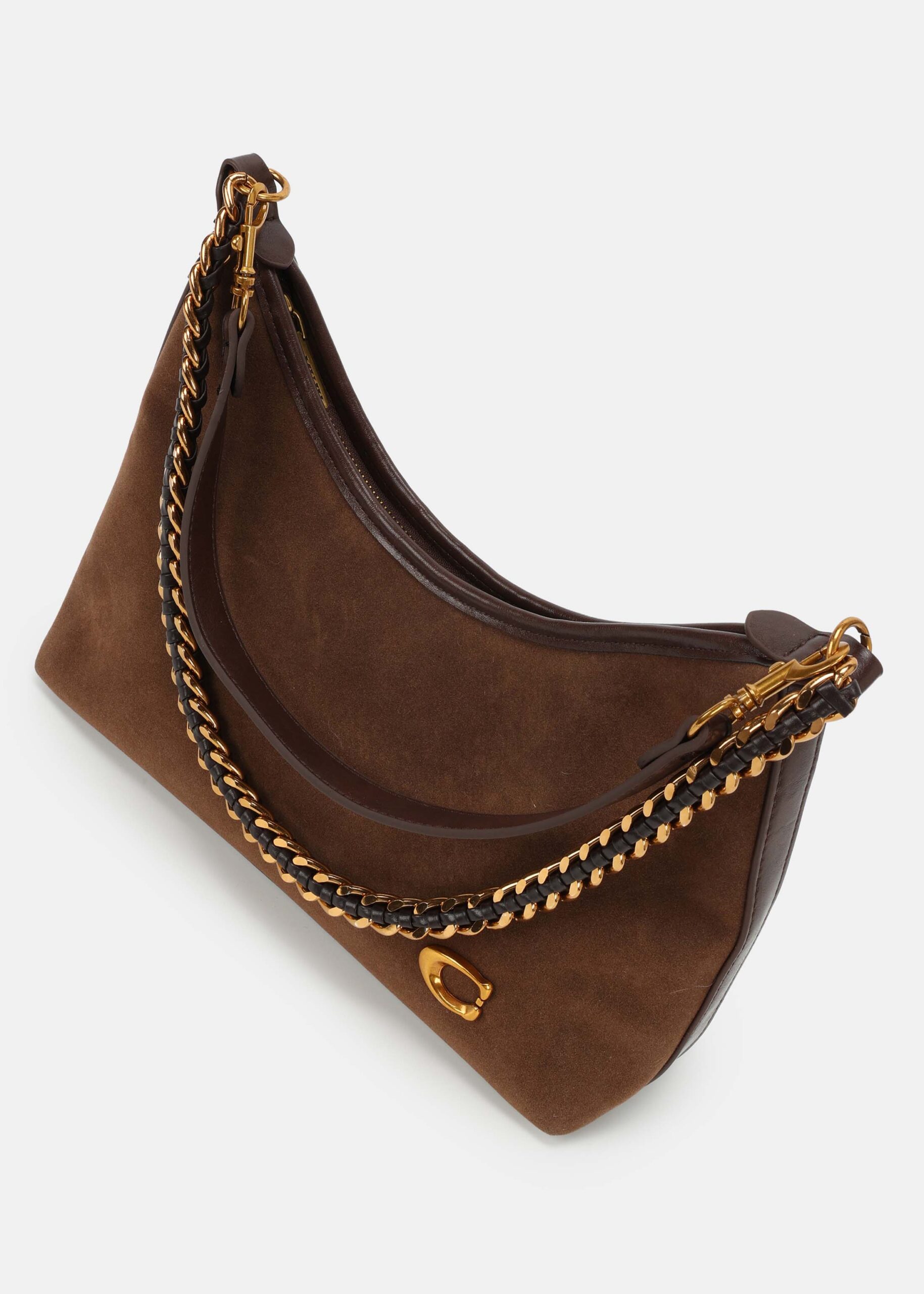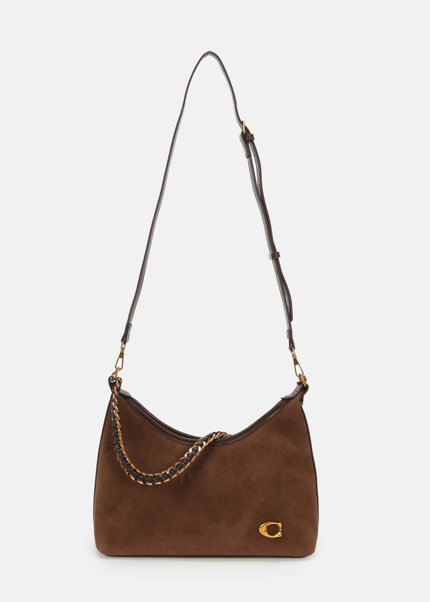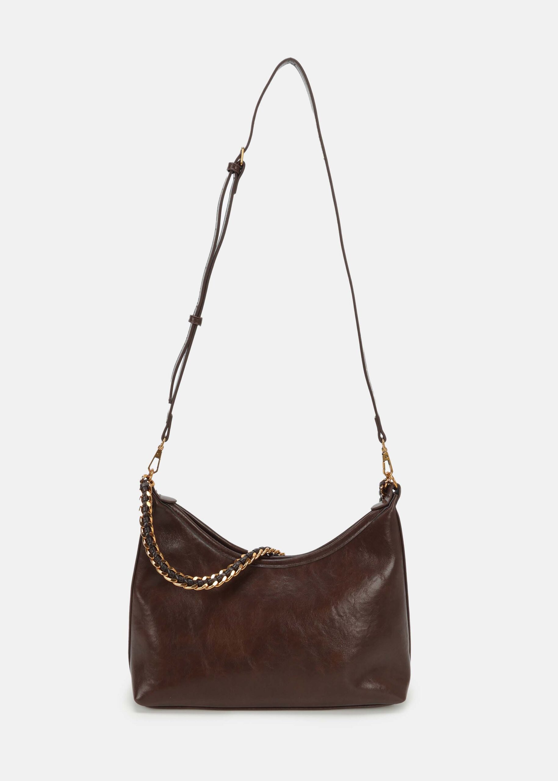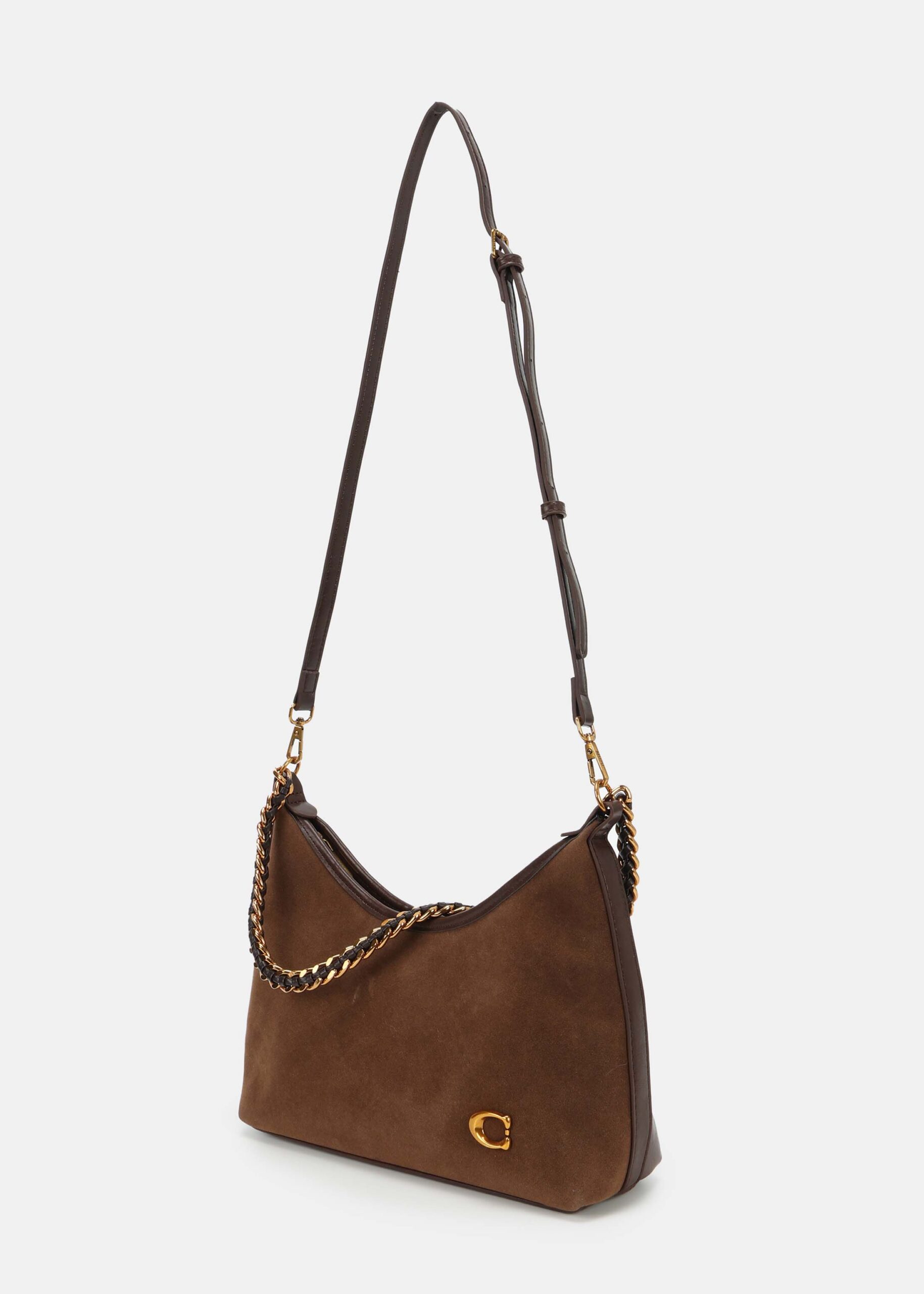 Women bag, leather and suede, upper zip closure, detachable hand strap with chain strap decor, adjustable and detachable shoulder strap, unique and modern