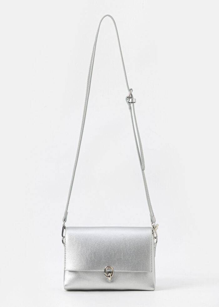 Women bag, leather, front metal buckle, upper zipper closure, shoulder adjustable straps, unique and modern