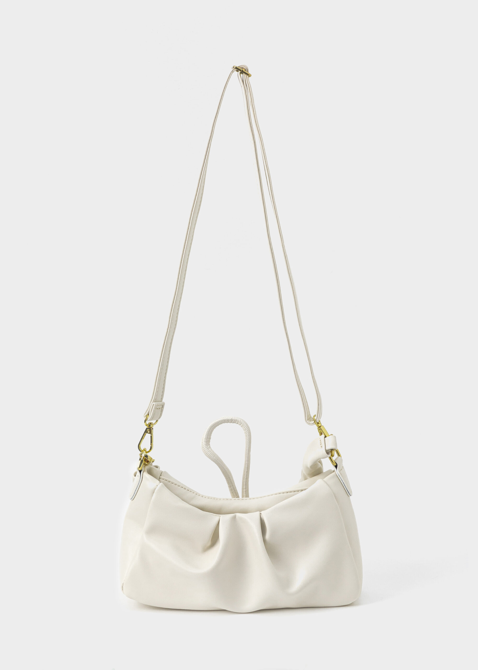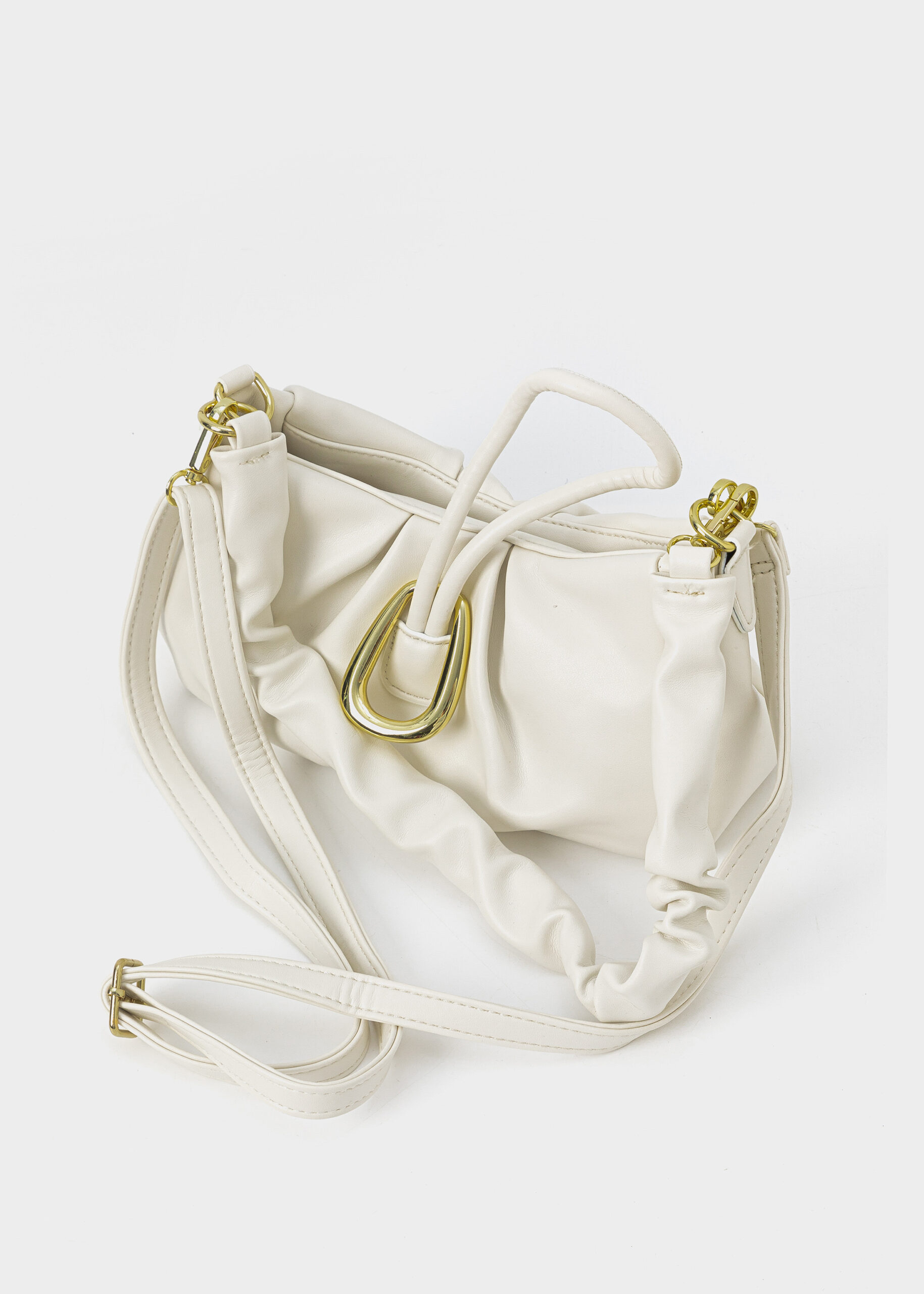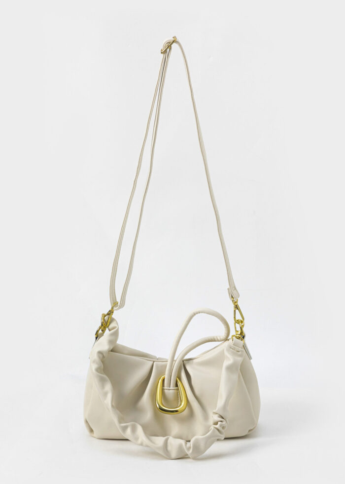 Women bag, leather, pleated design, upper zipper closure, front elastic design with metal piece decor, hand strap, adjustable shoulder strap, unique and modern