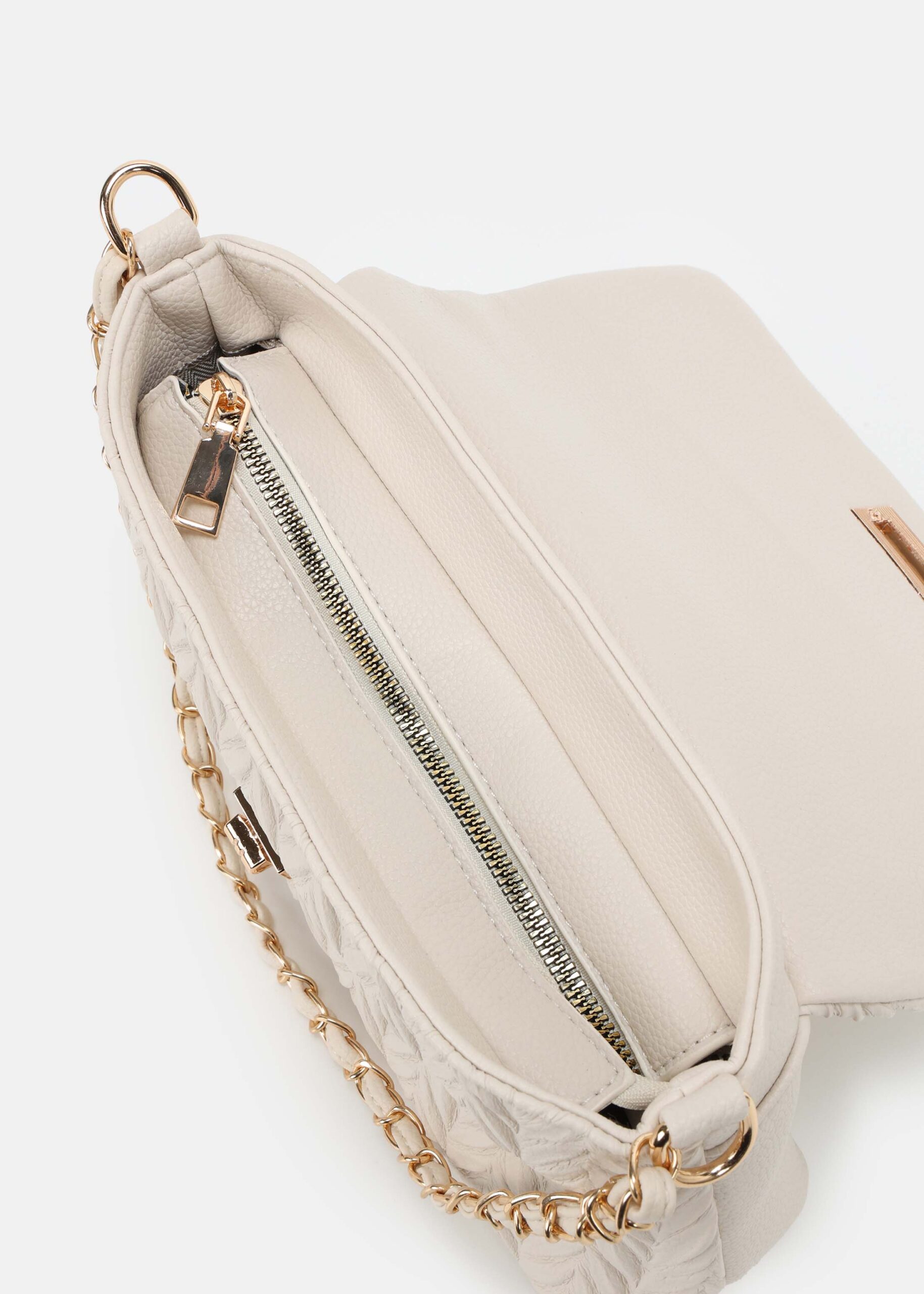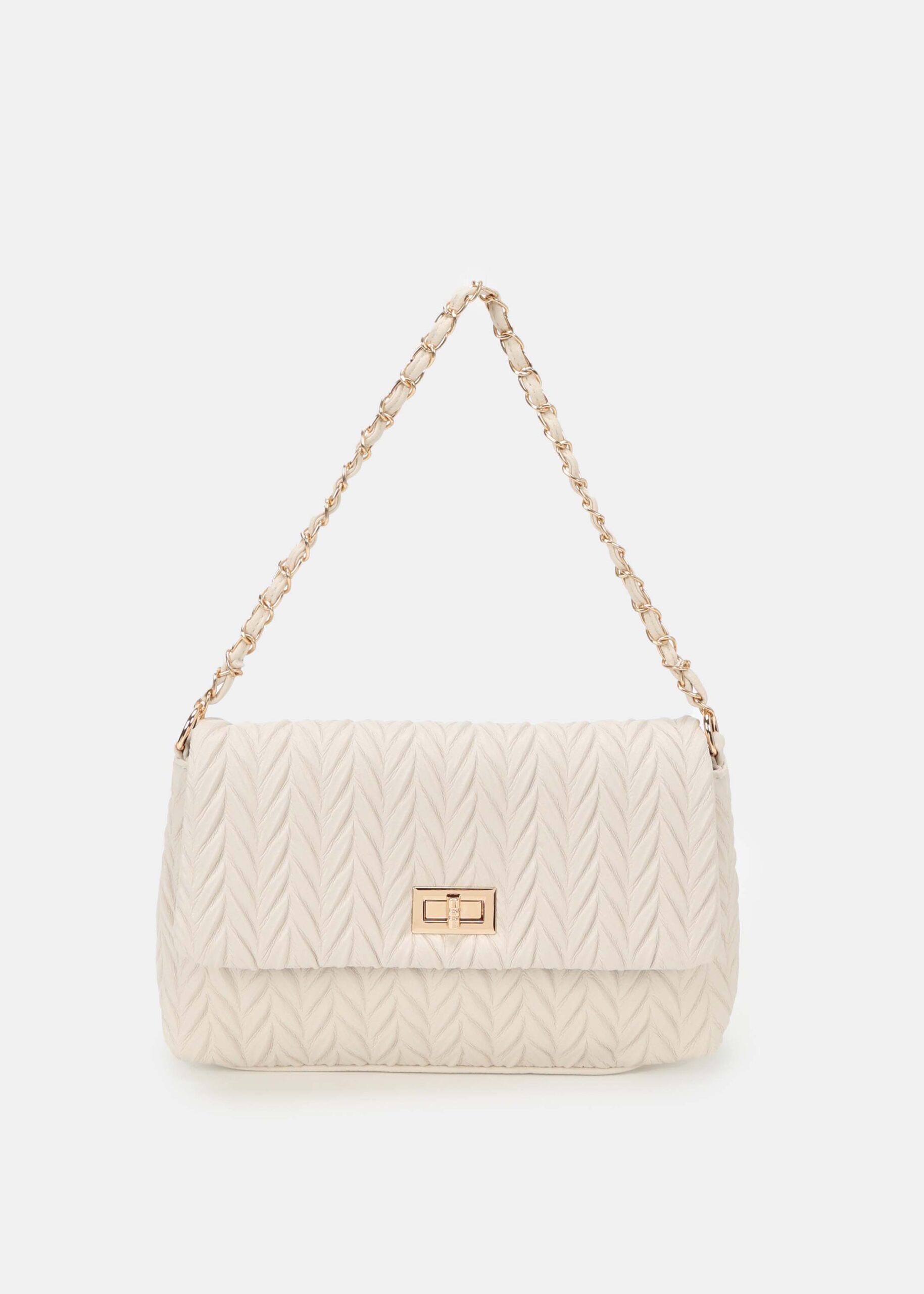 Women bag, leather, quilted with textured pattern, front flap closure with metal buckle, top zip closure, detachable and adjustable long shoulder strap, fixes shoulder strap with chain decor, elegance and unique