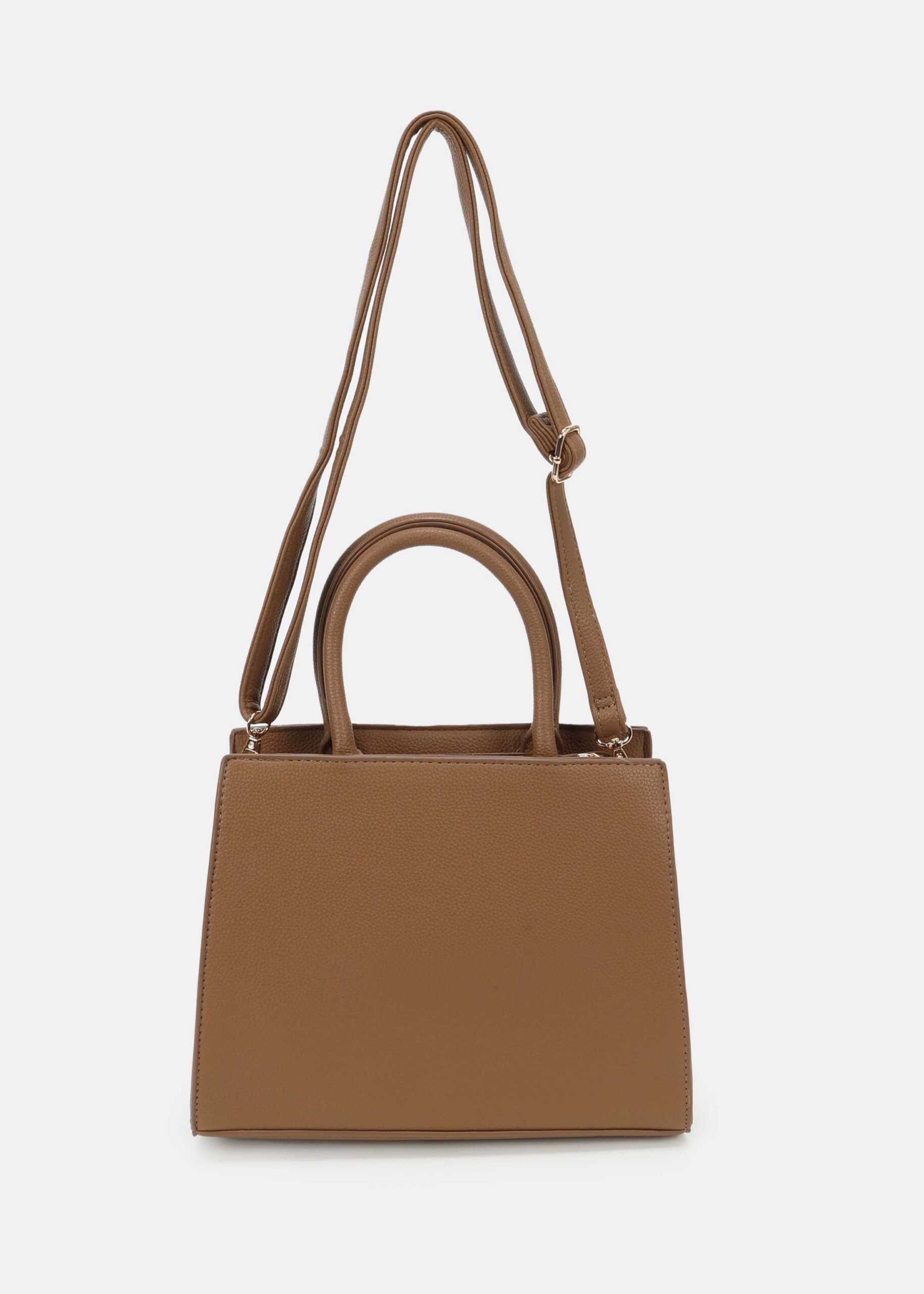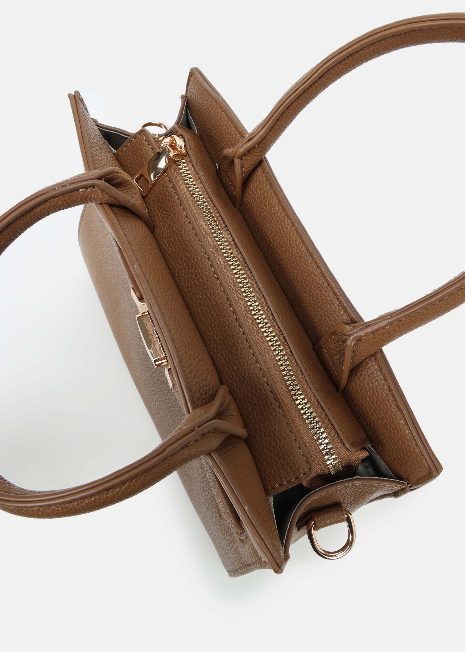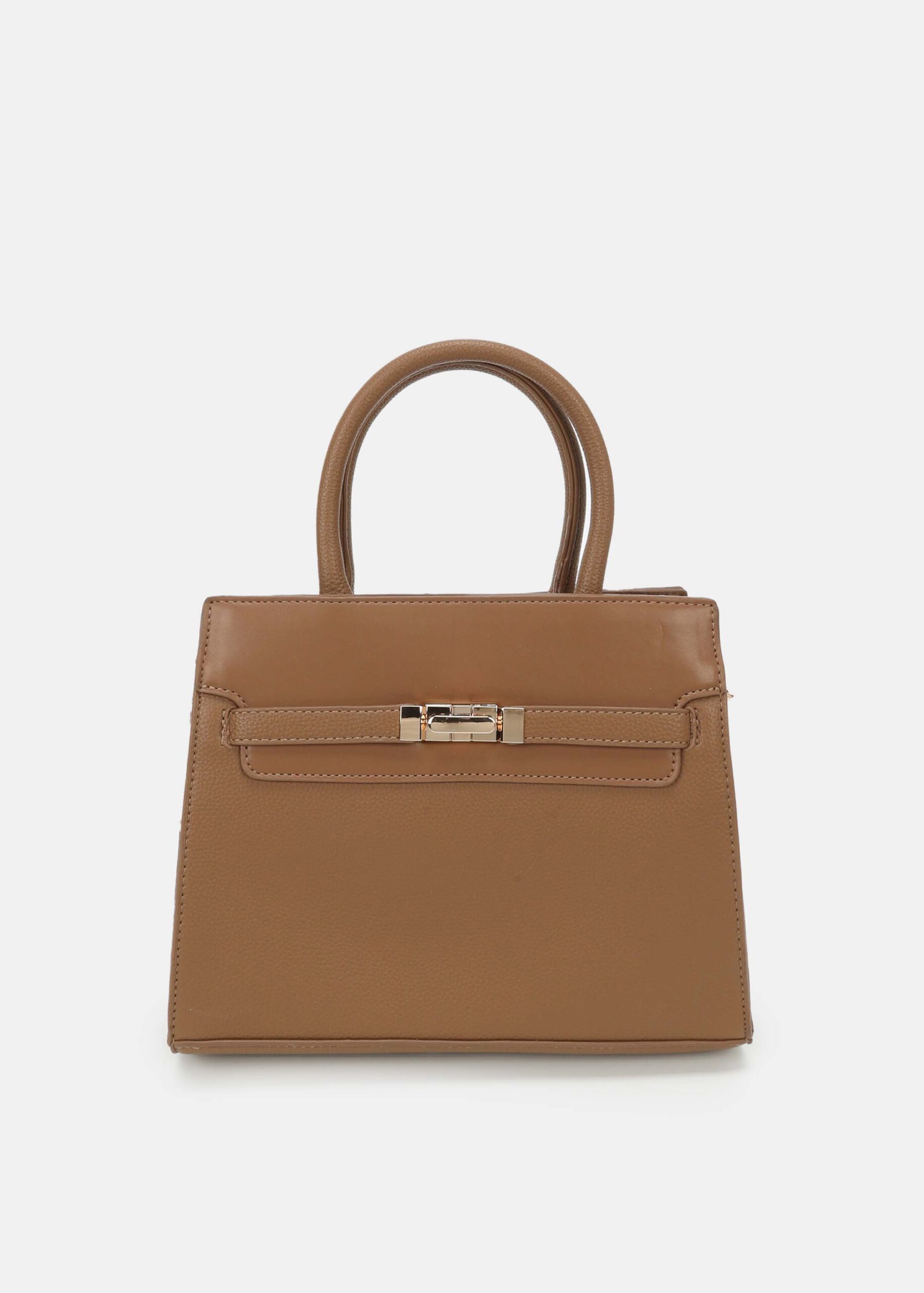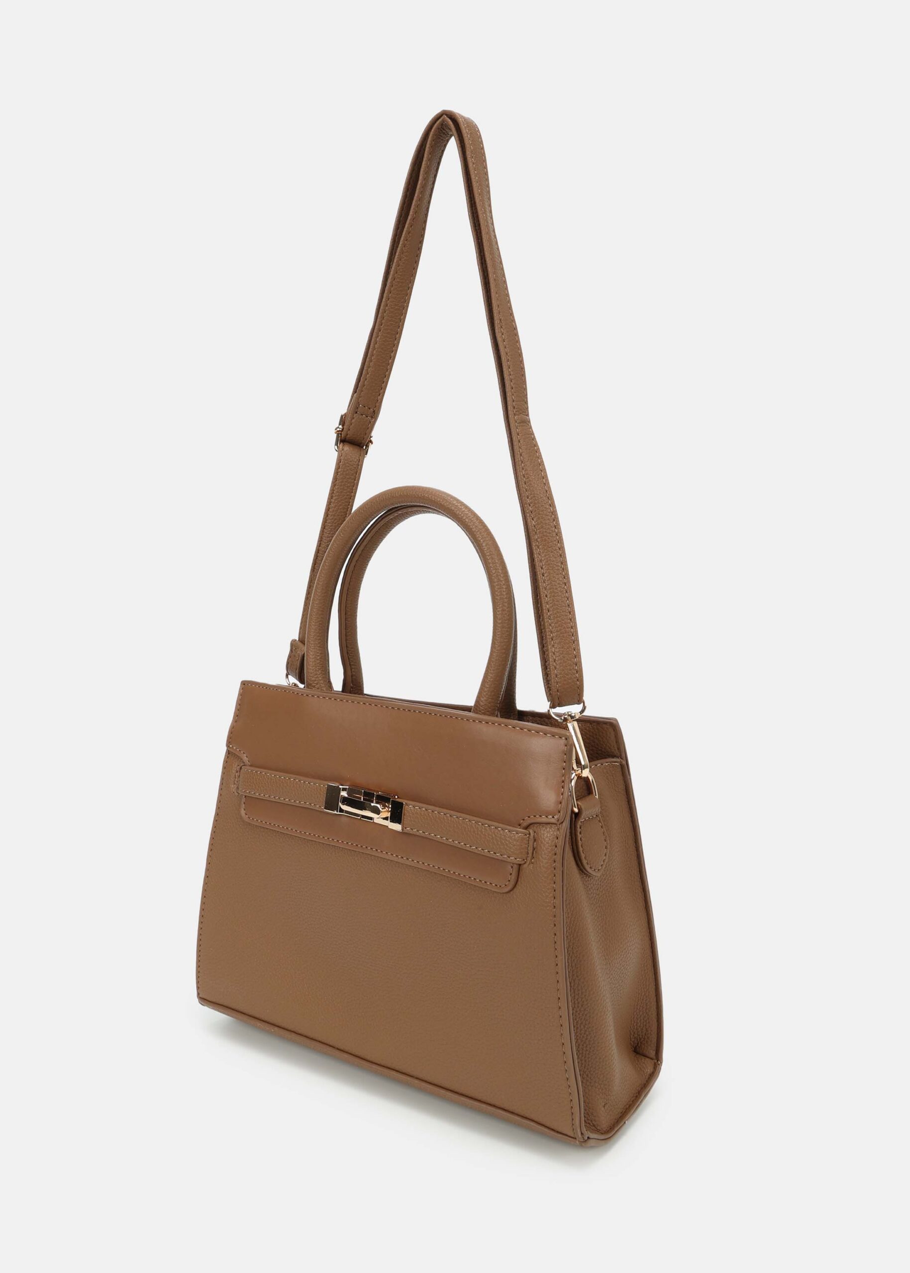 Women bag, leather, hand strap, adjustable and detachable shoulder strap, front strap with metallic buckle decor, top zip closure, unique and modern
