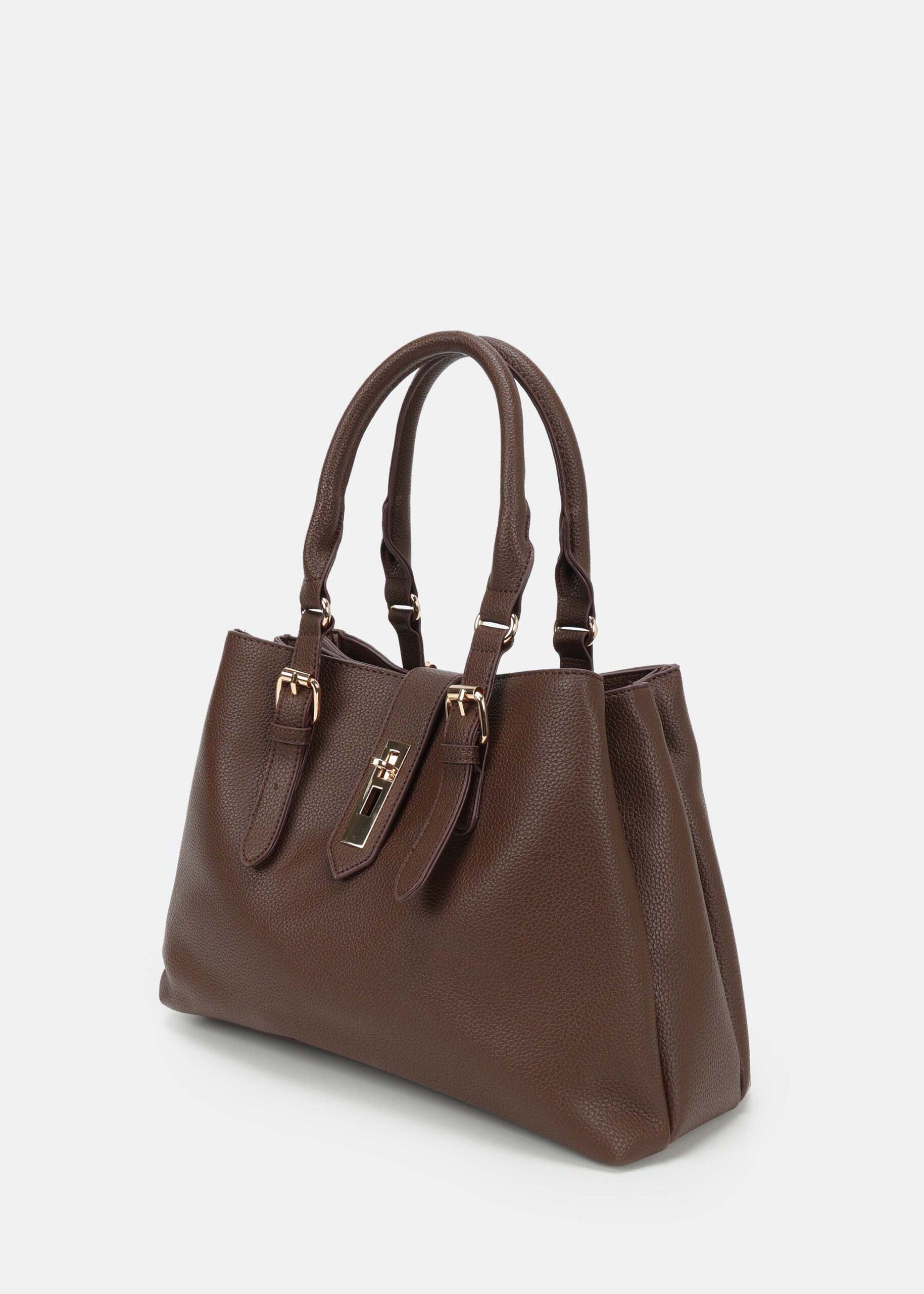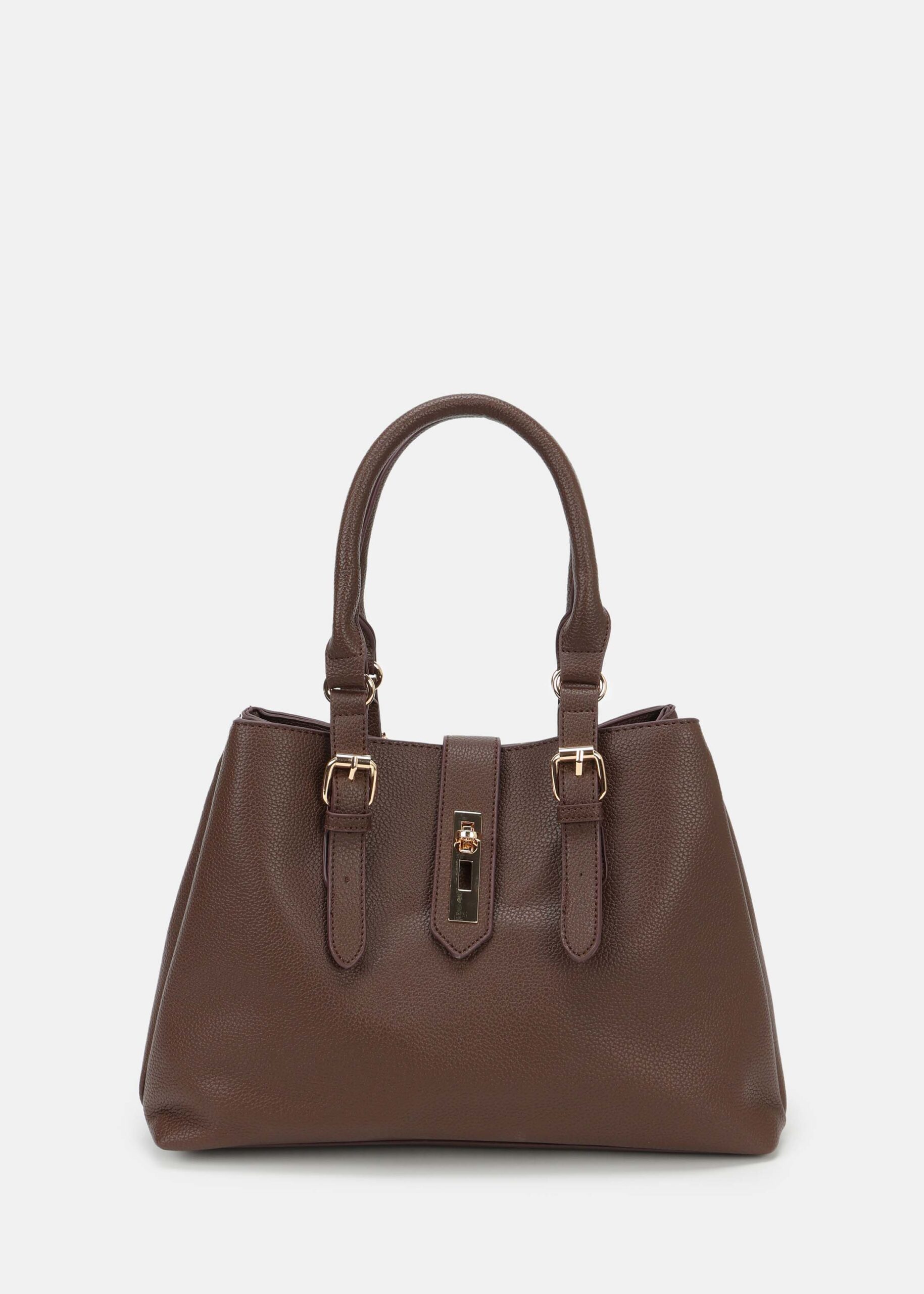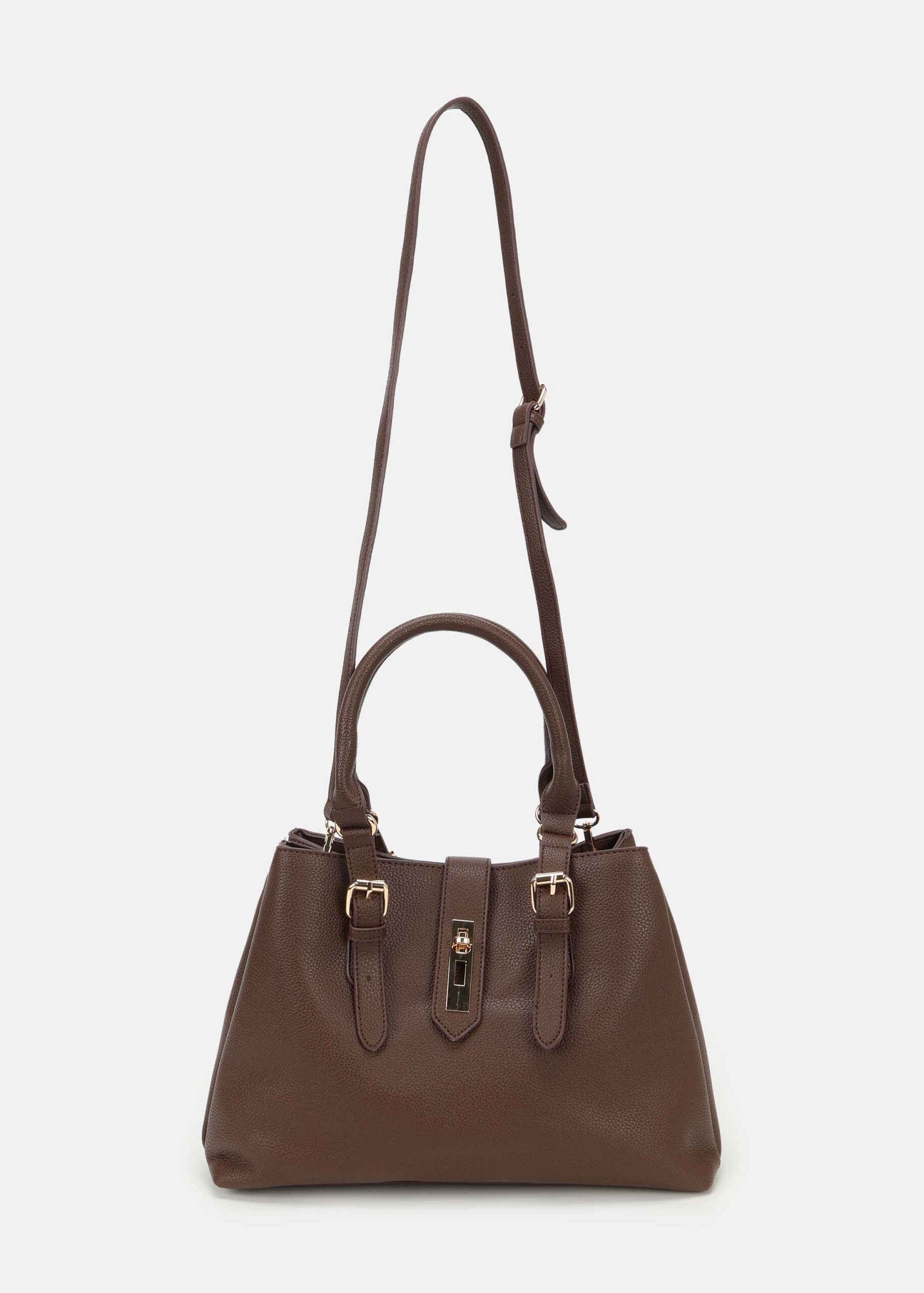 Women bag, leather, hand strap, adjustable and detachable shoulder strap, central strap with metal buckle to close, upper zip closure and snap buttons, unique and modern