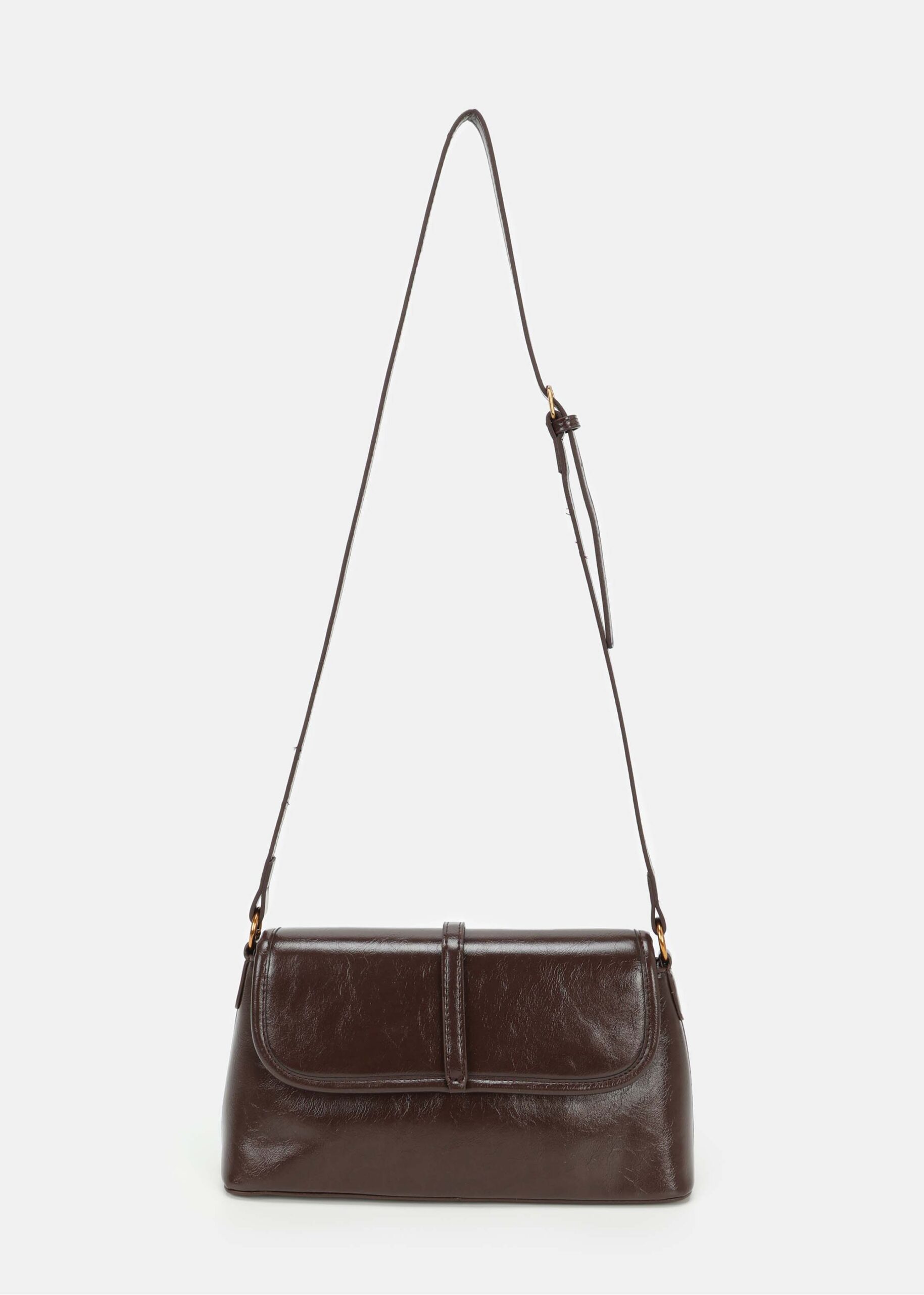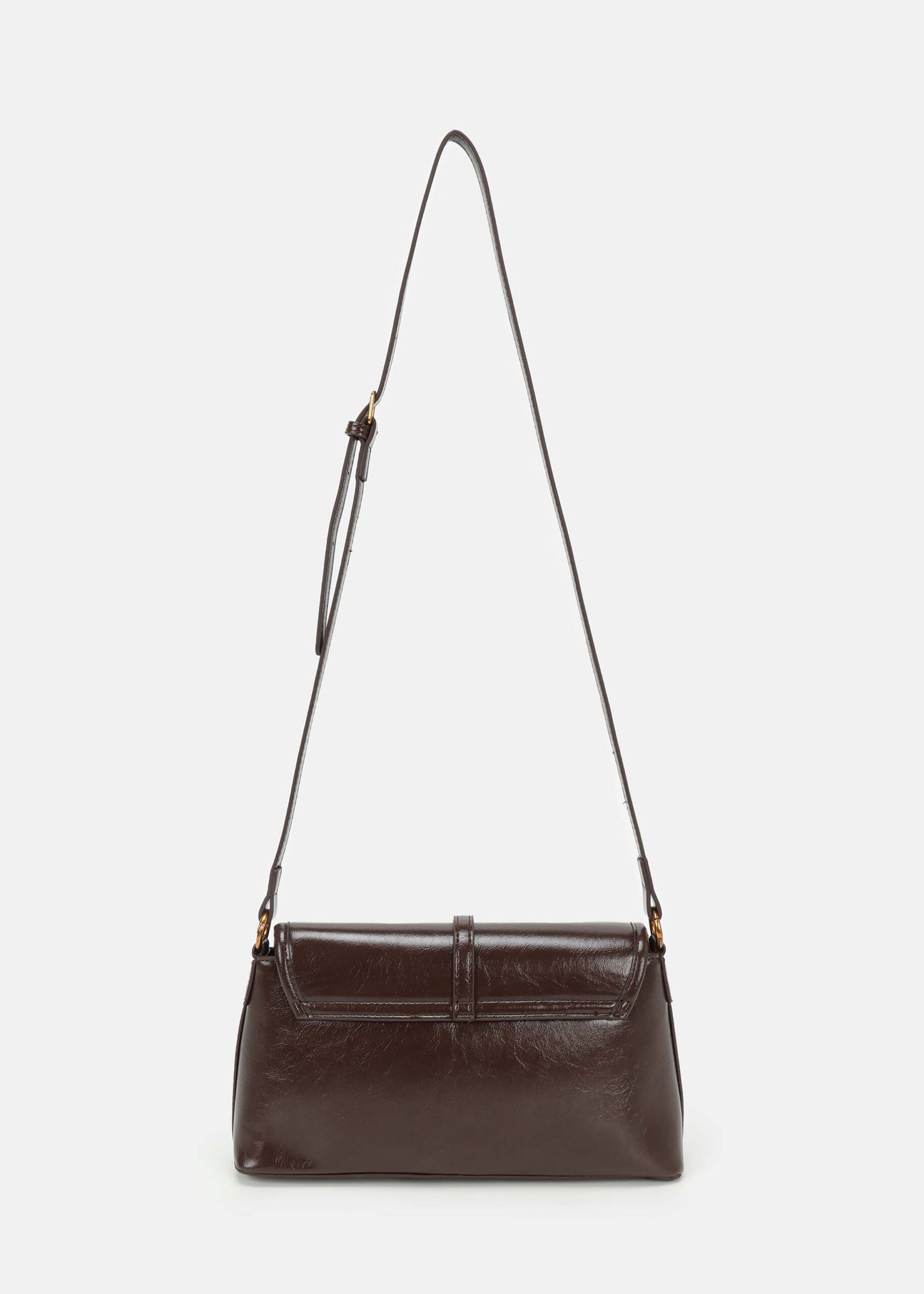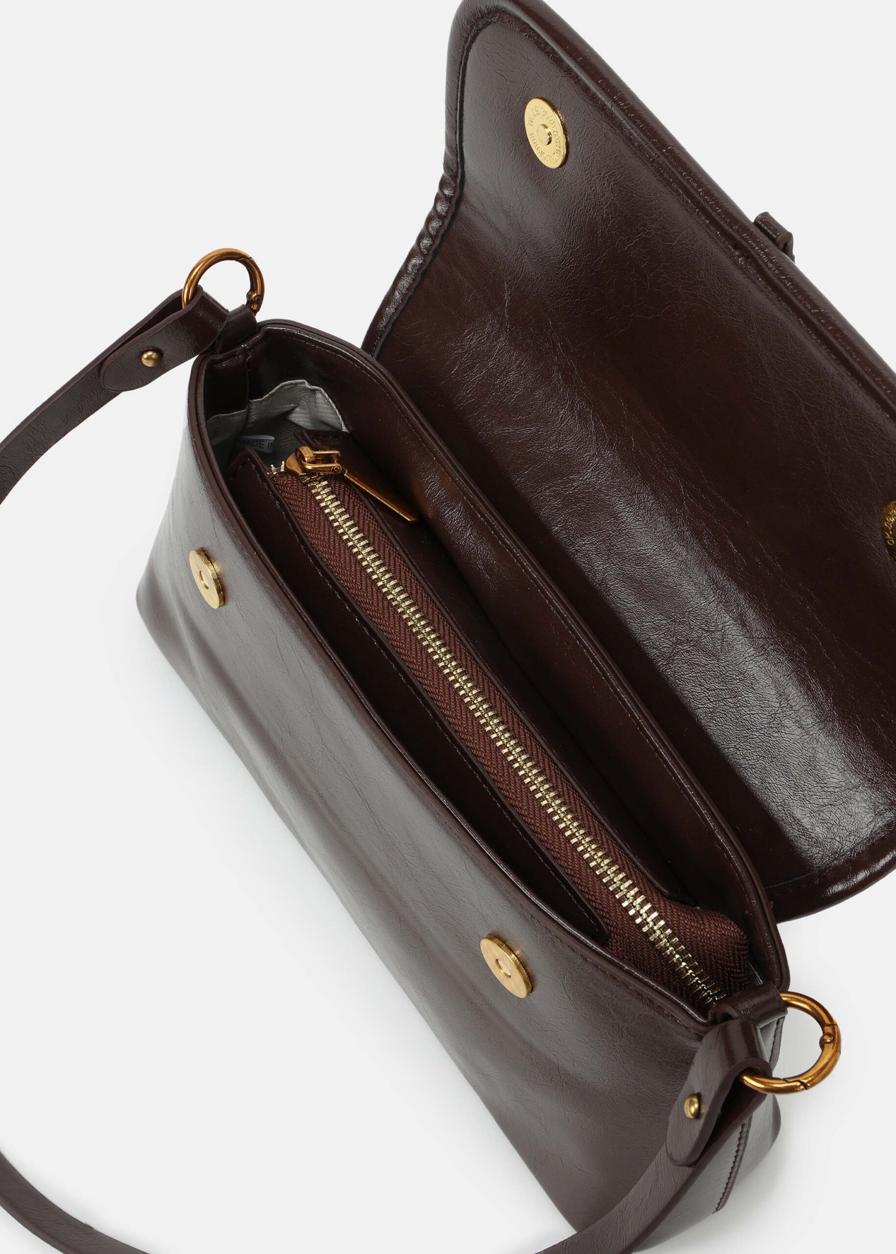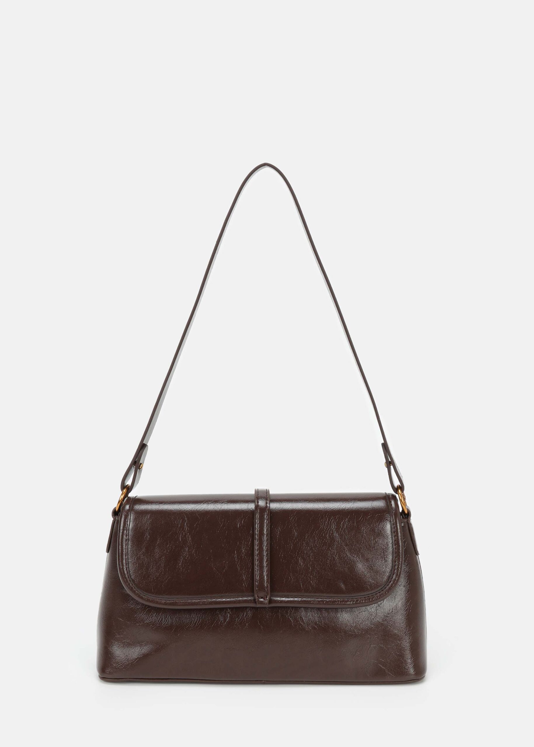 Women bag, leather, front flap with snap button to close, fixed hand strap, adjustable and detachable shoulder strap, upper zip closure, unique and modern