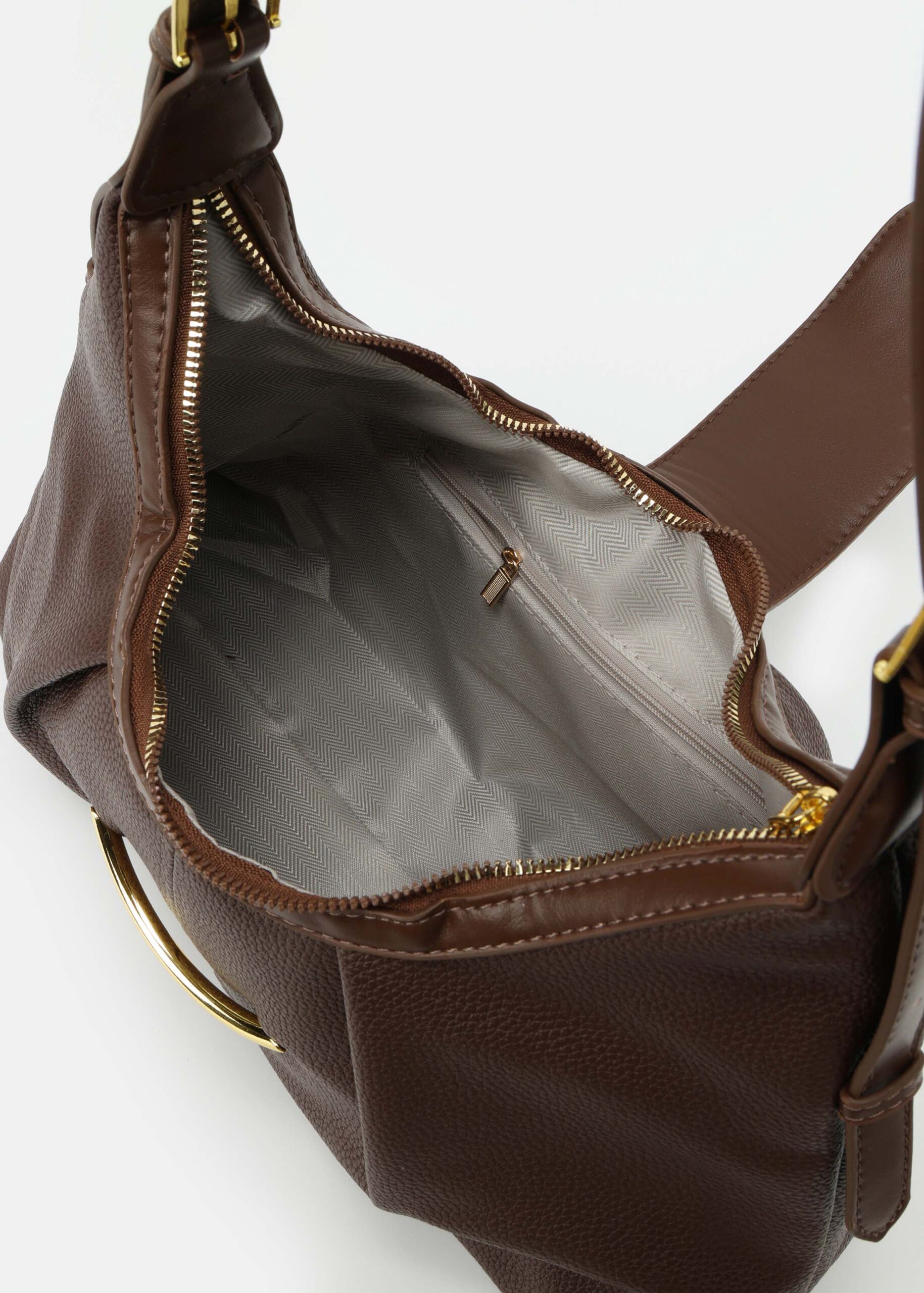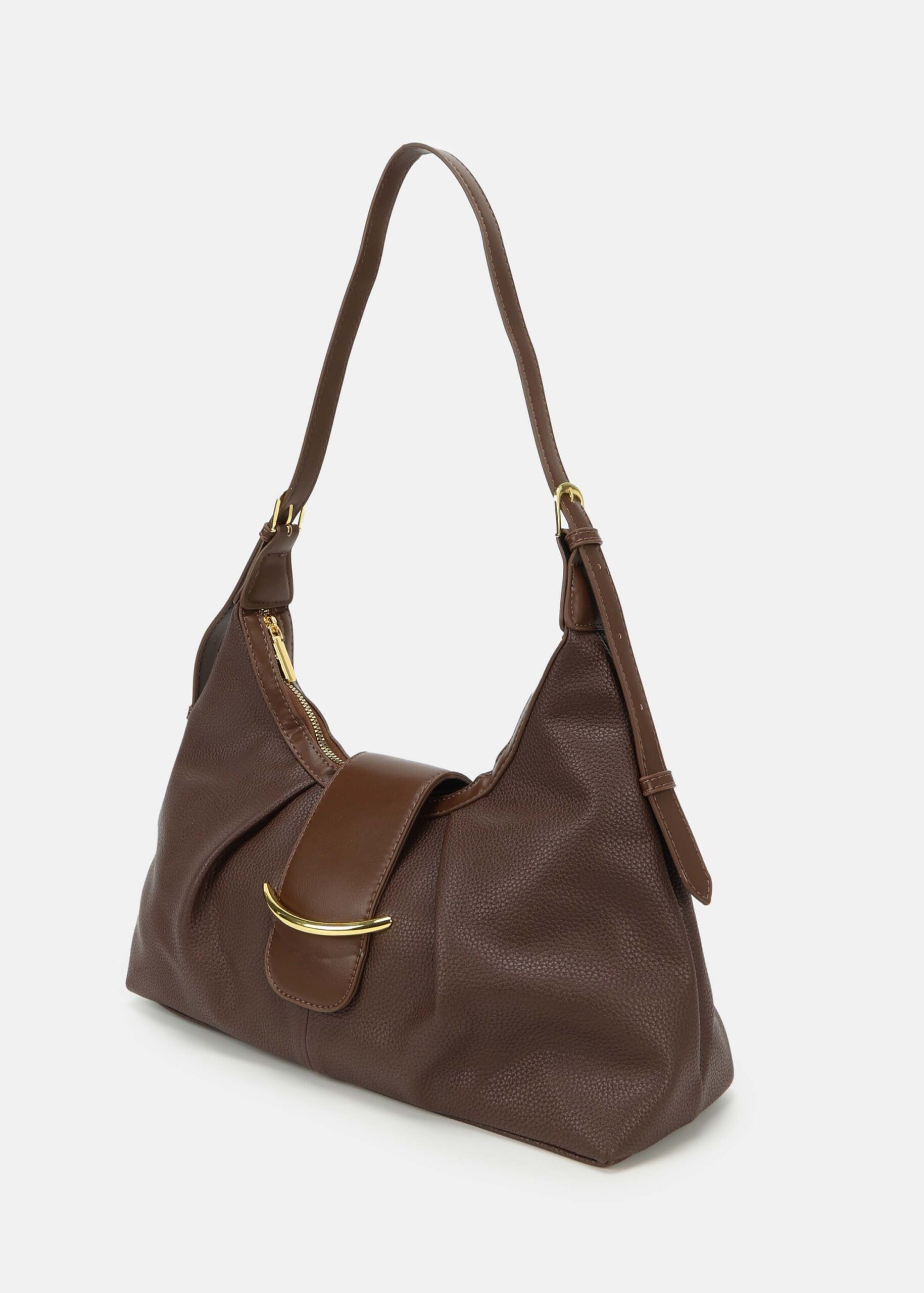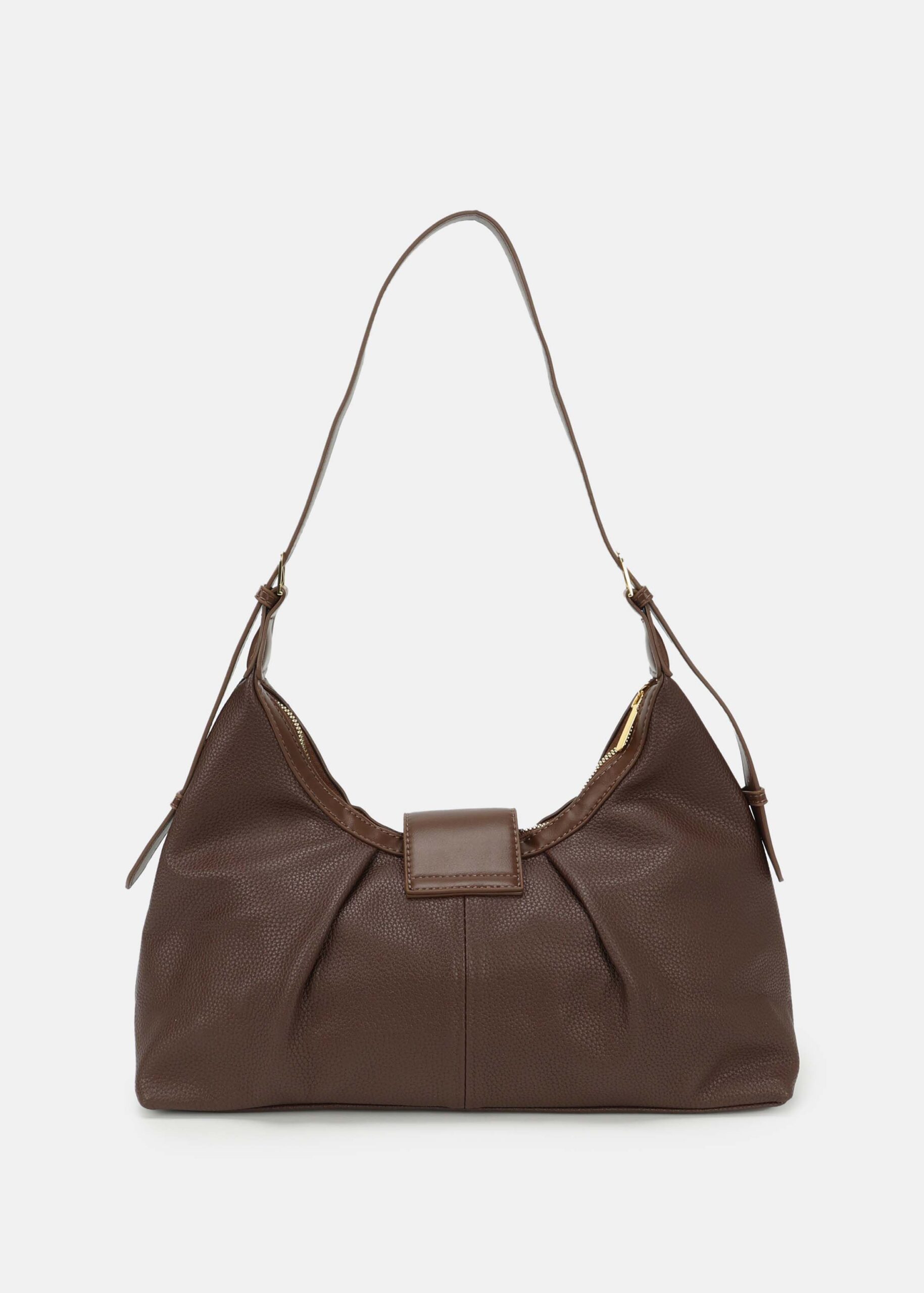 Women bag, leather, front flap with snap button to close, adjustable hand strap, upper zip closure, unique and modern