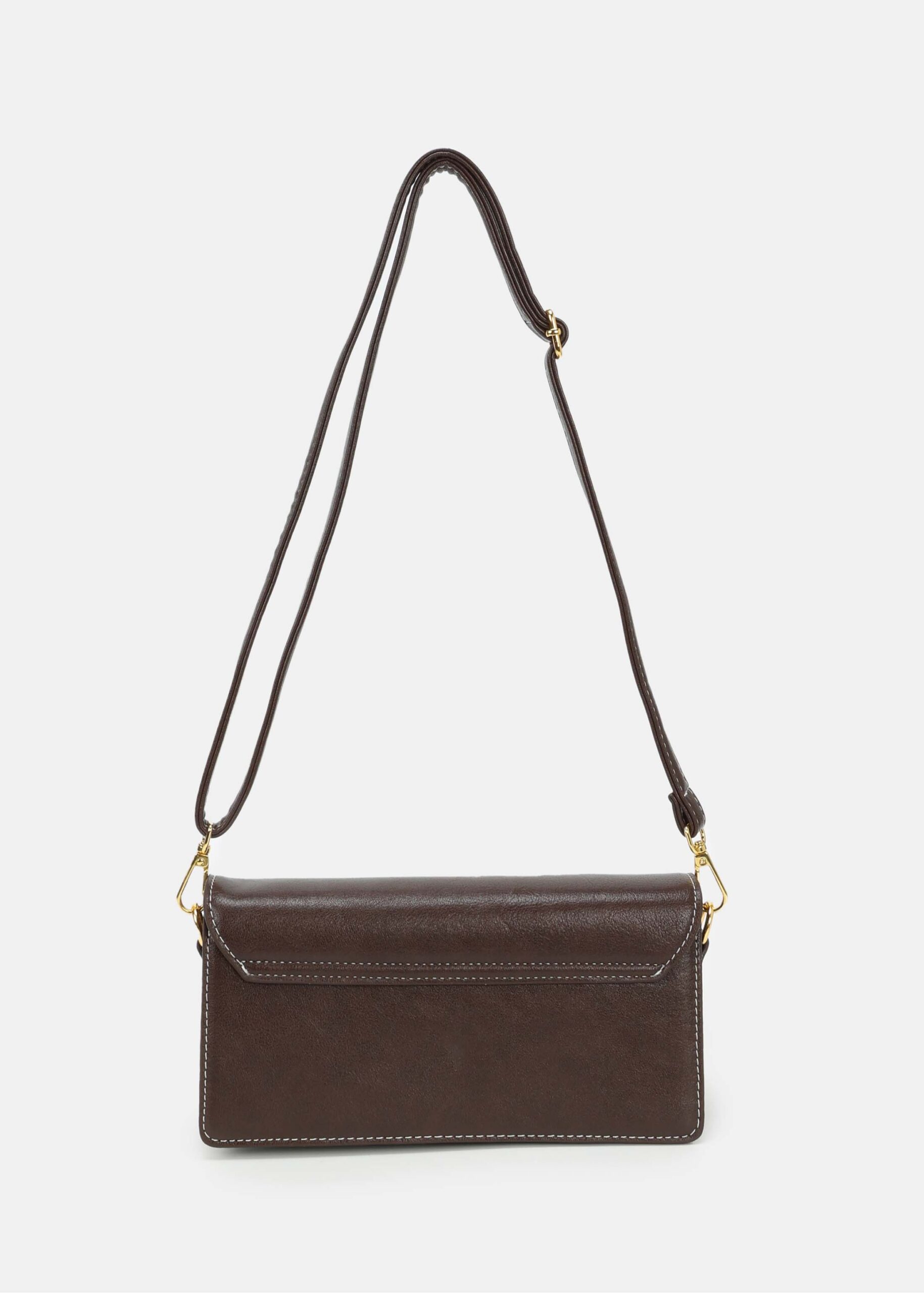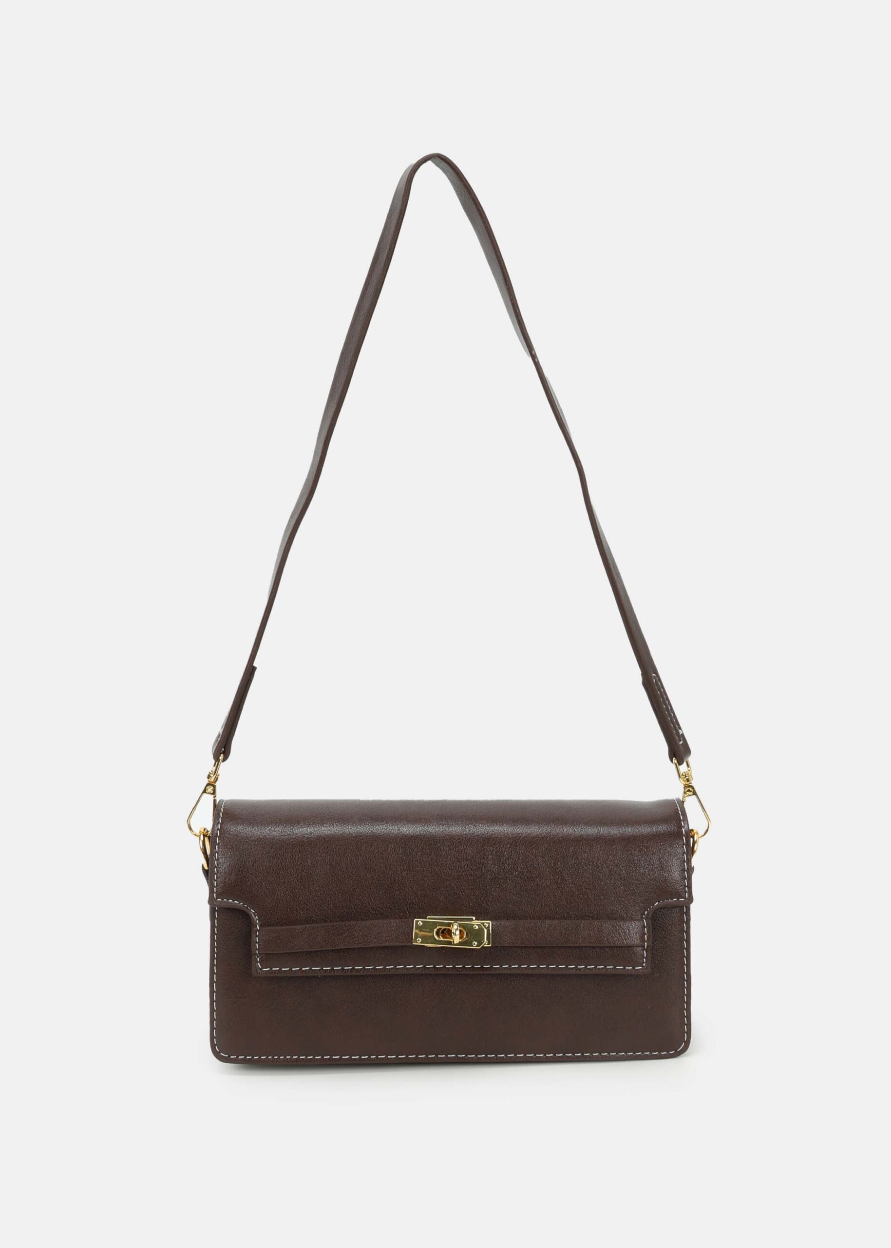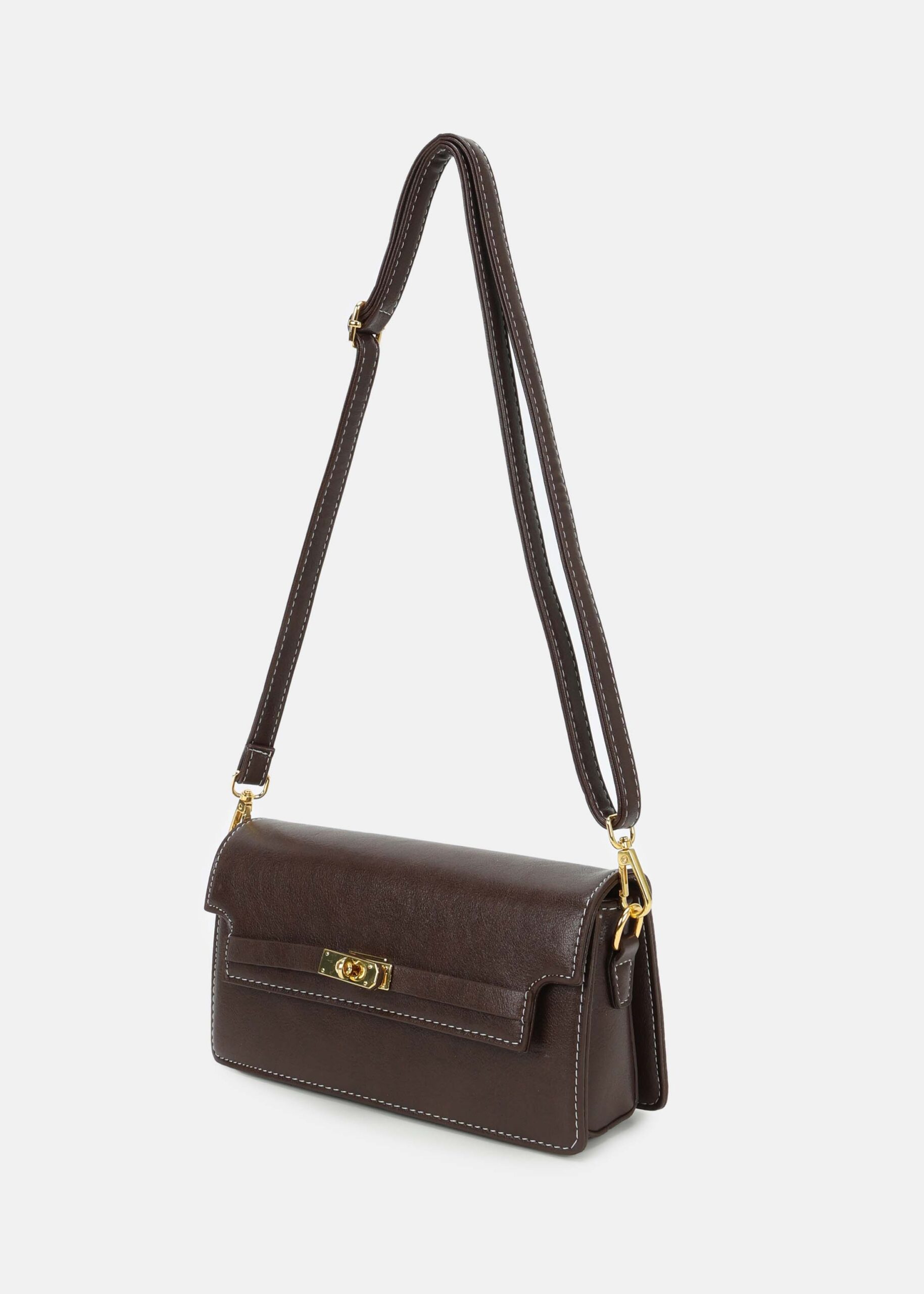 Women bag, leather, front flap with snap button, adjustable and detachable shoulder strap, detachable hand strap, upper zip closure, unique and modern