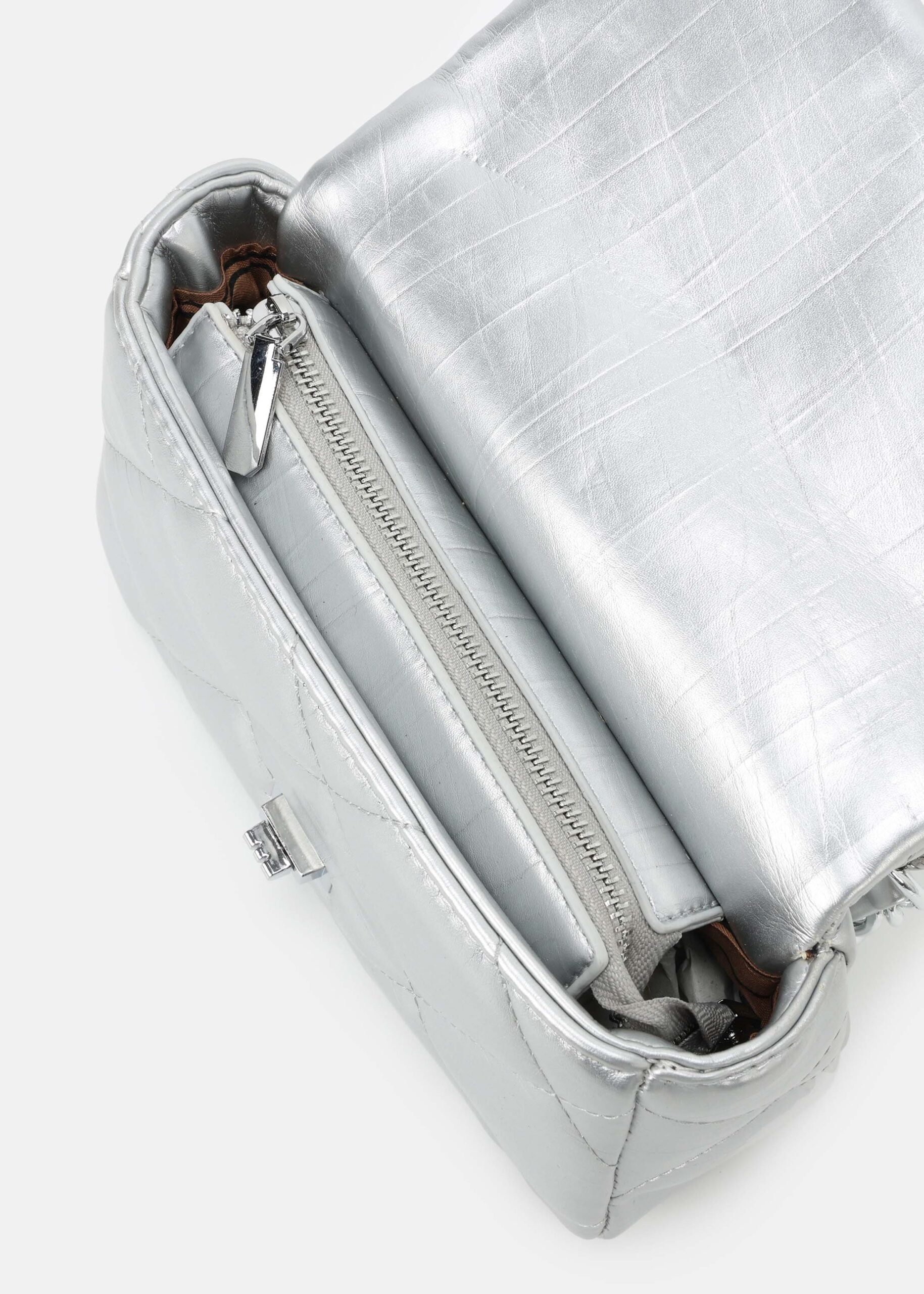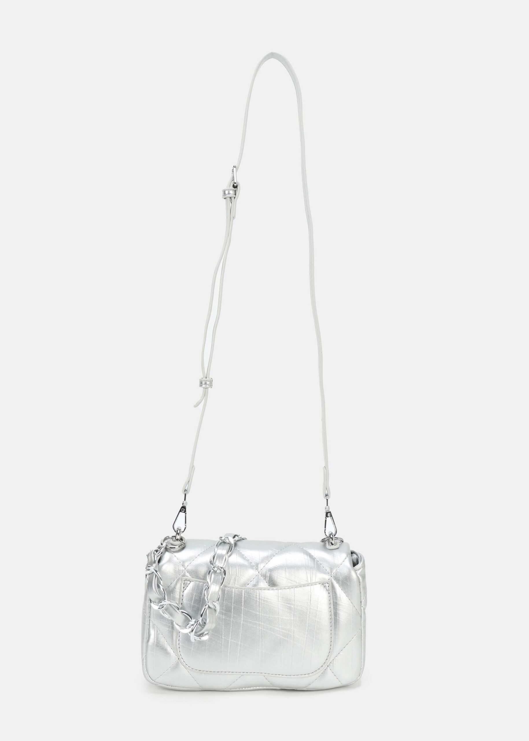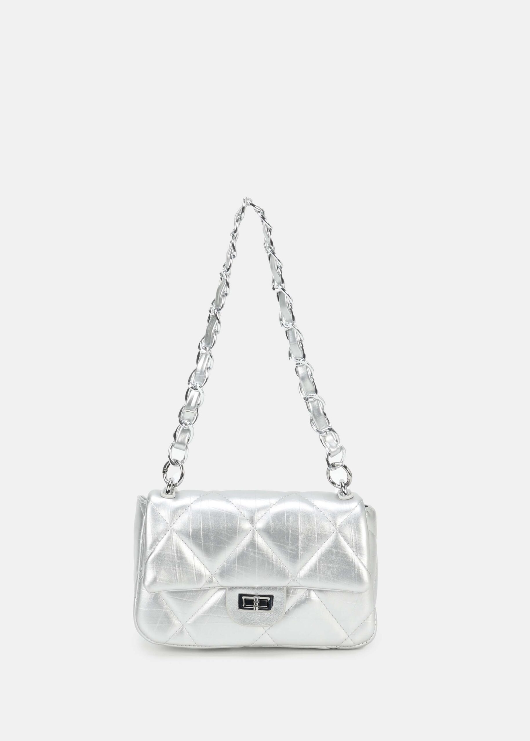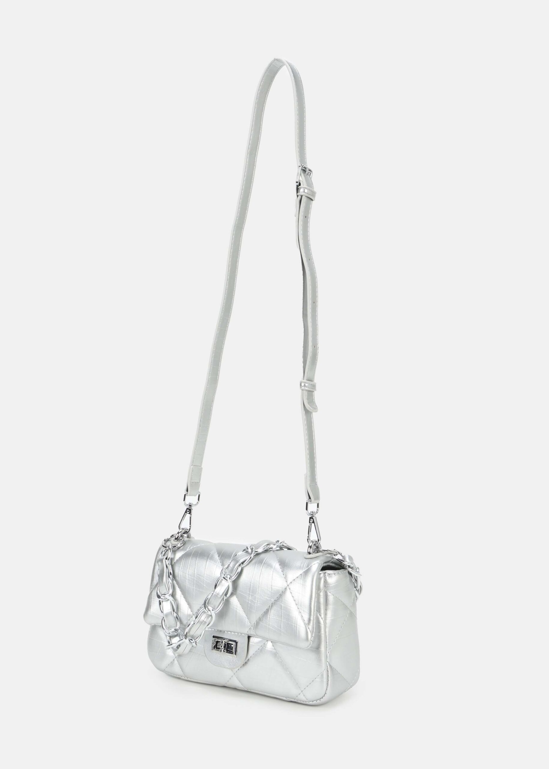Women bag, leather, quilted, front flap with metal buckle to close, upper zip closure, back pocket, chain hand strap, adjustable and detachable shoulder strap, unique and modern