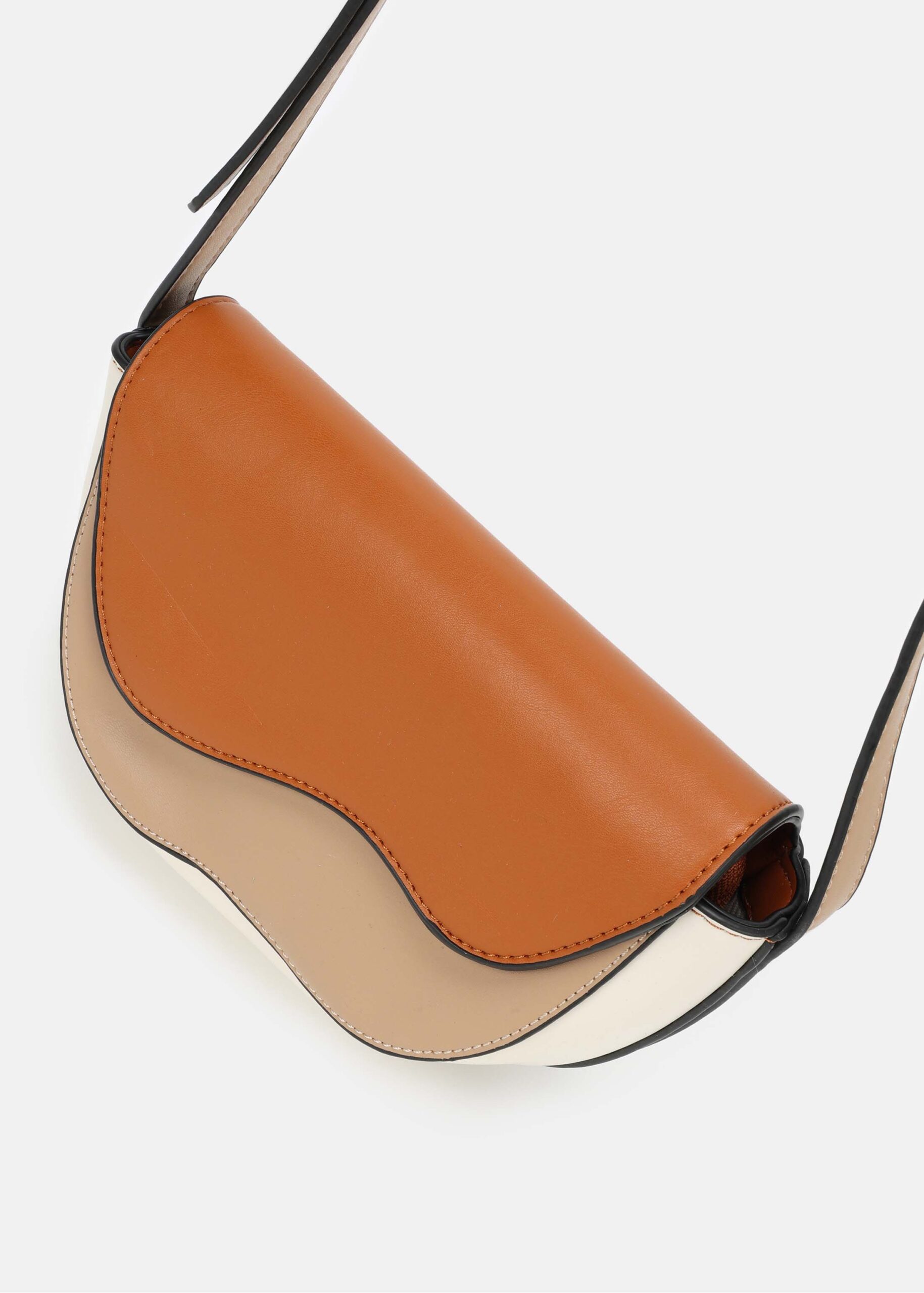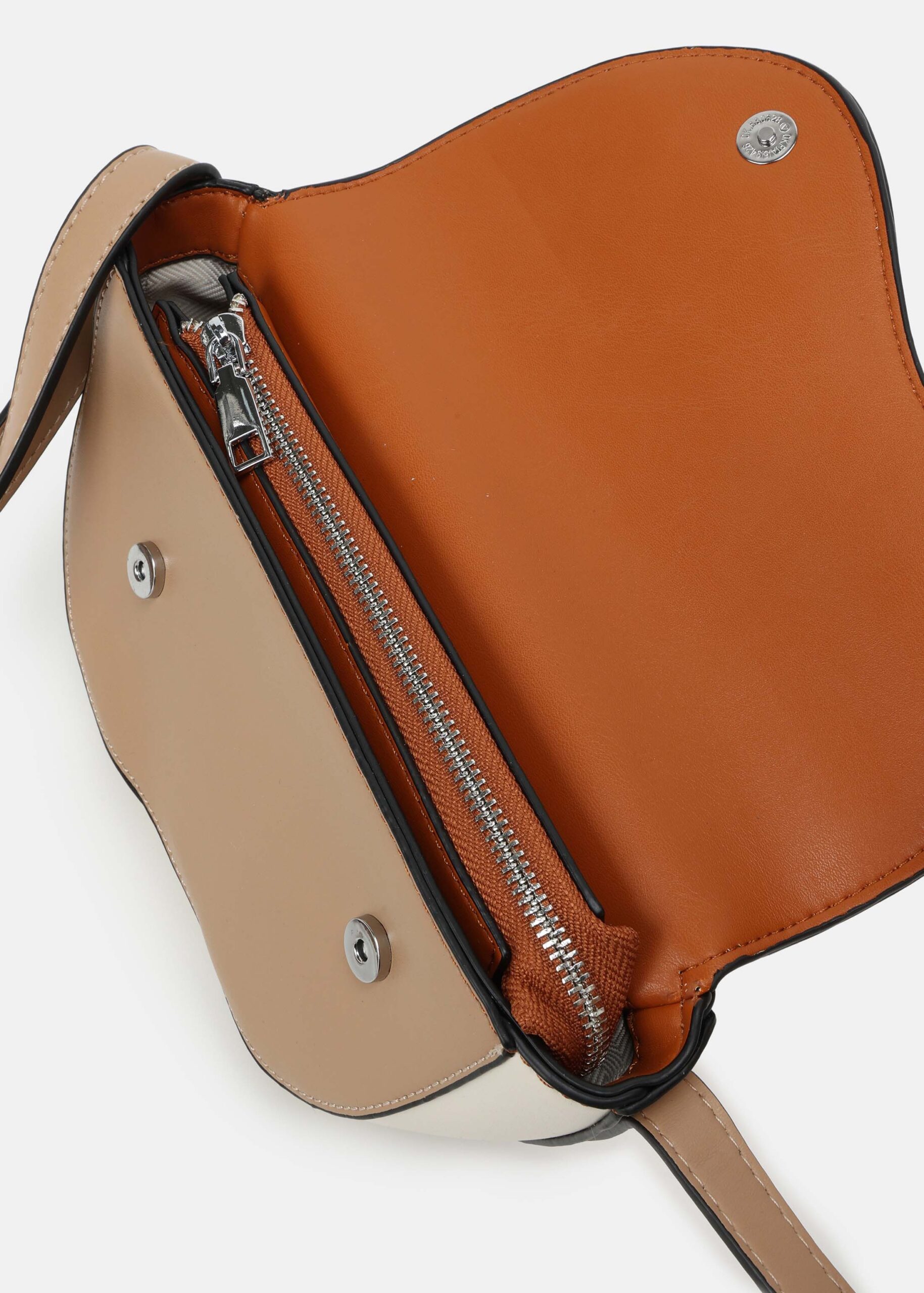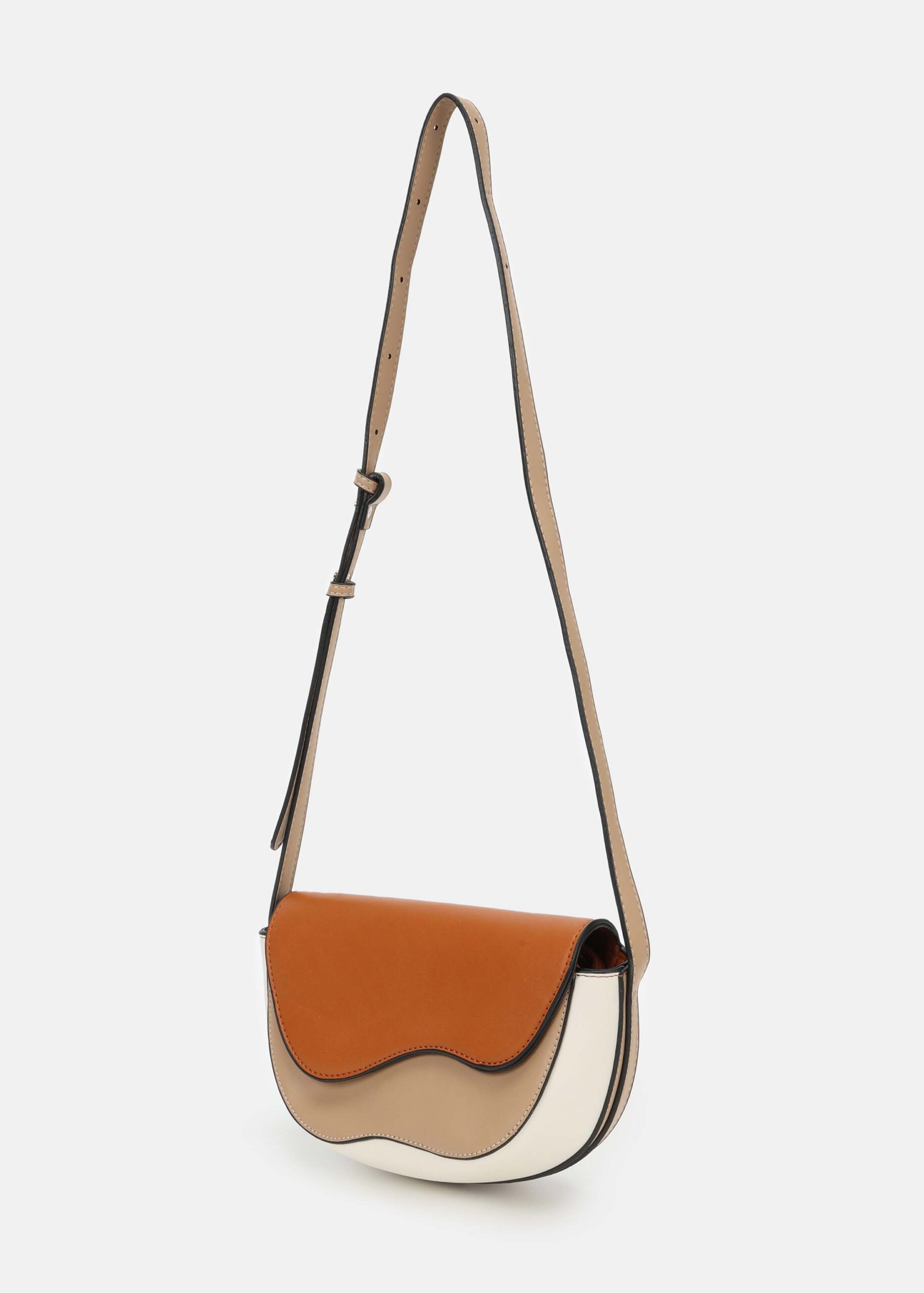 Women bag, leather, color-block, front flap with snap button to close, adjustable shoulder strap, back pocket, upper zip clousre, unique and modern