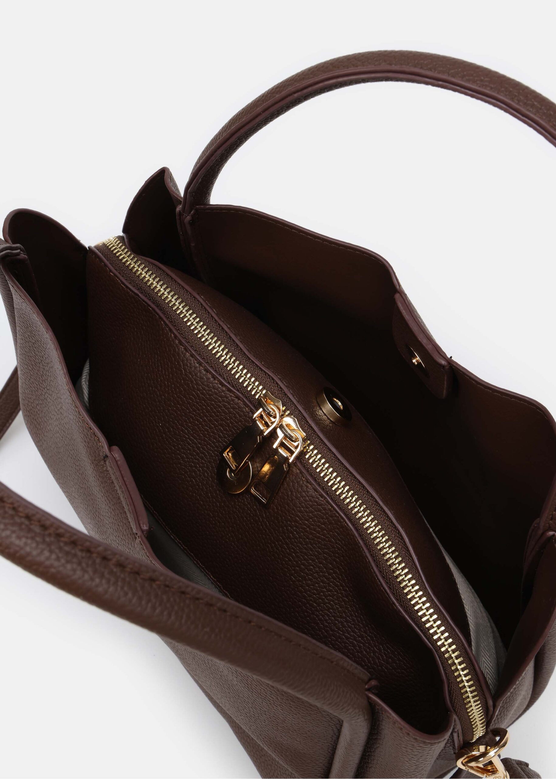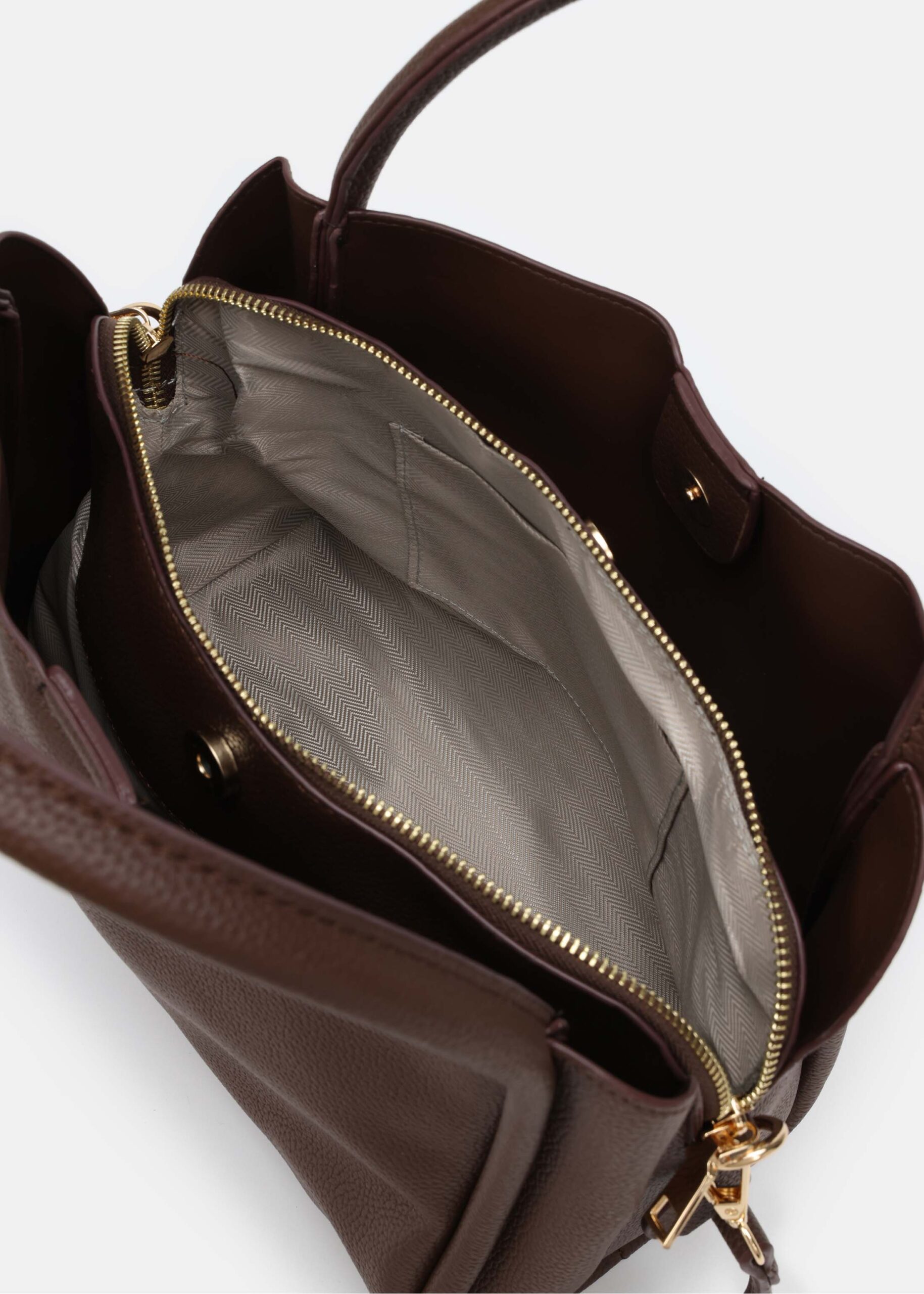 Women bag, leather, zipper closure with snap buttons, hand straps, adjustable shoulder strap, unique and modern