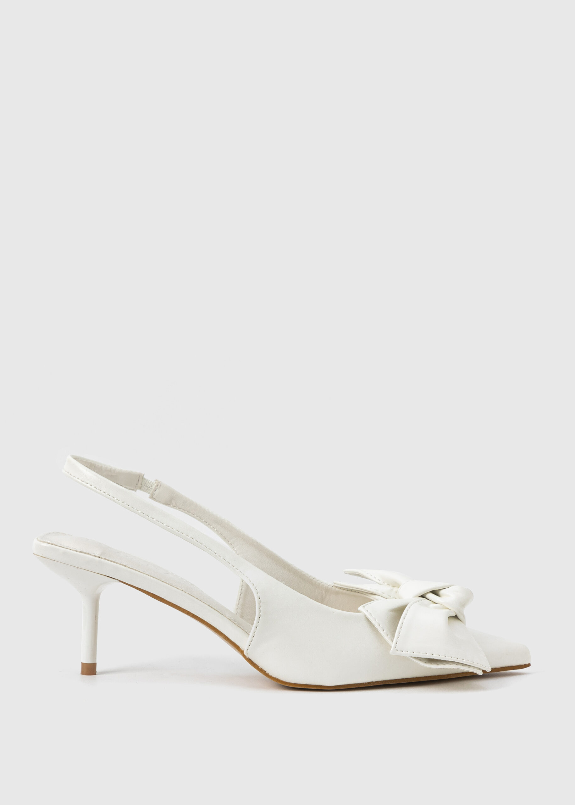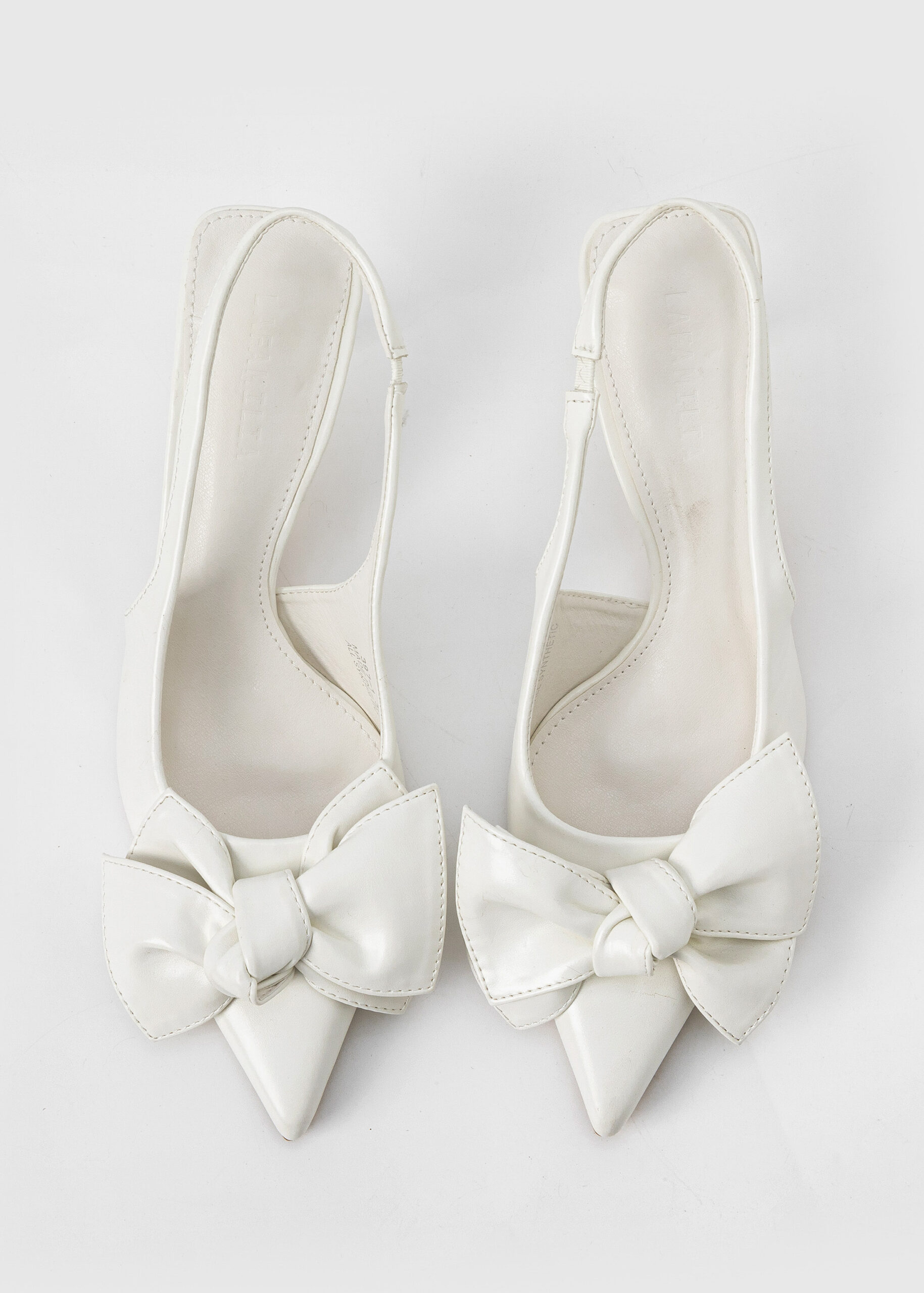 Women sandal, leather, heels, point toe, upper bow decor, elastic ankle strap, unqiue and modern
