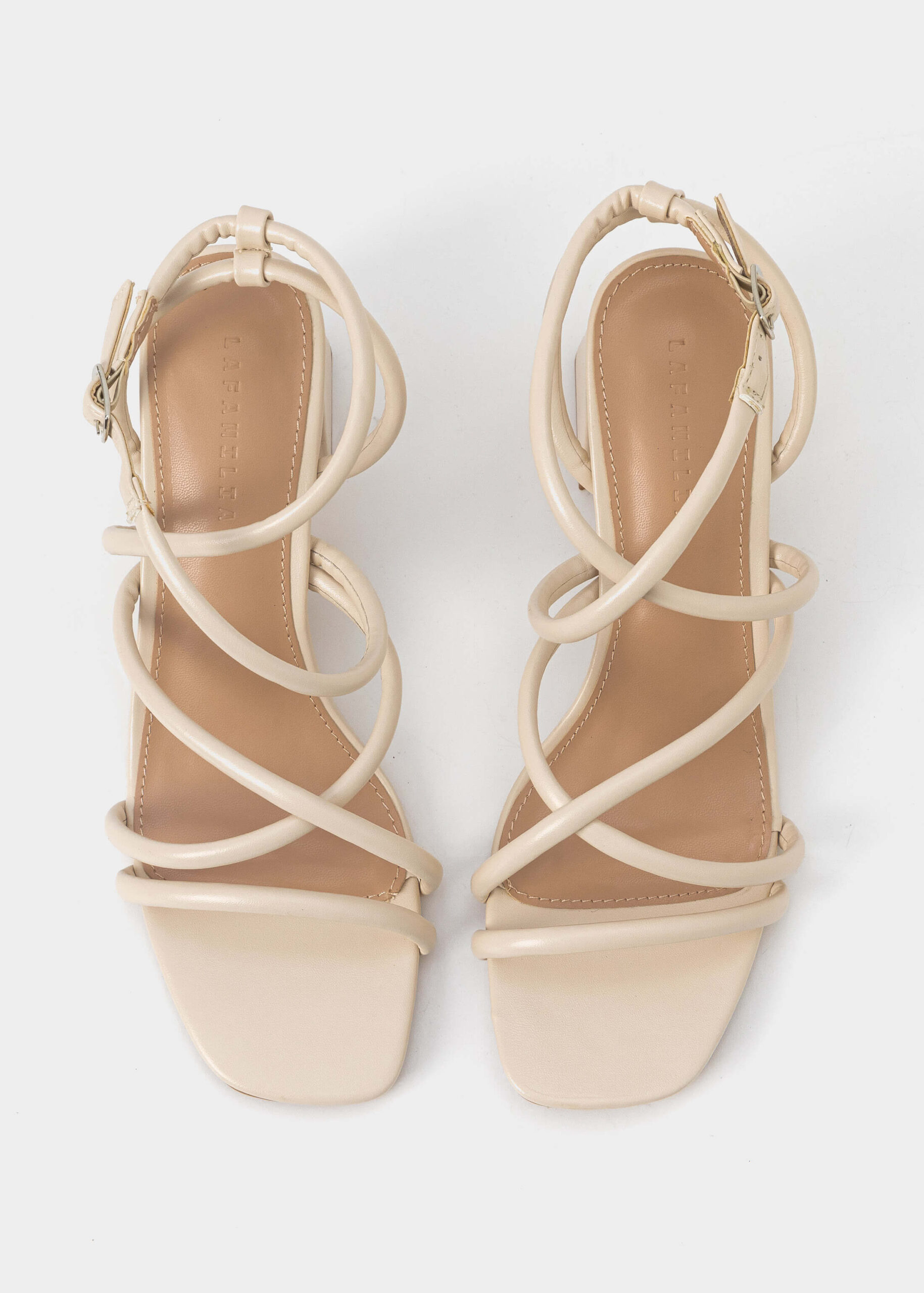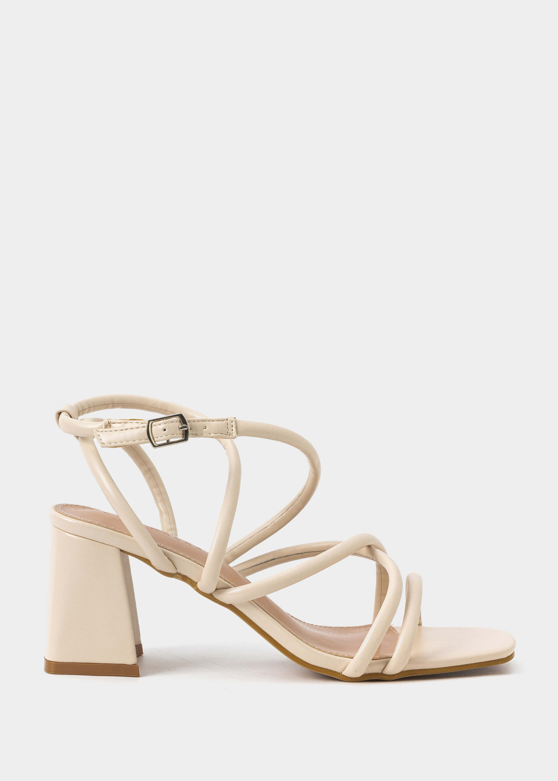 Women sandal, leather, open round toe, upper straps, ankle strap with side metal buckle to close, heels, unique and modern
