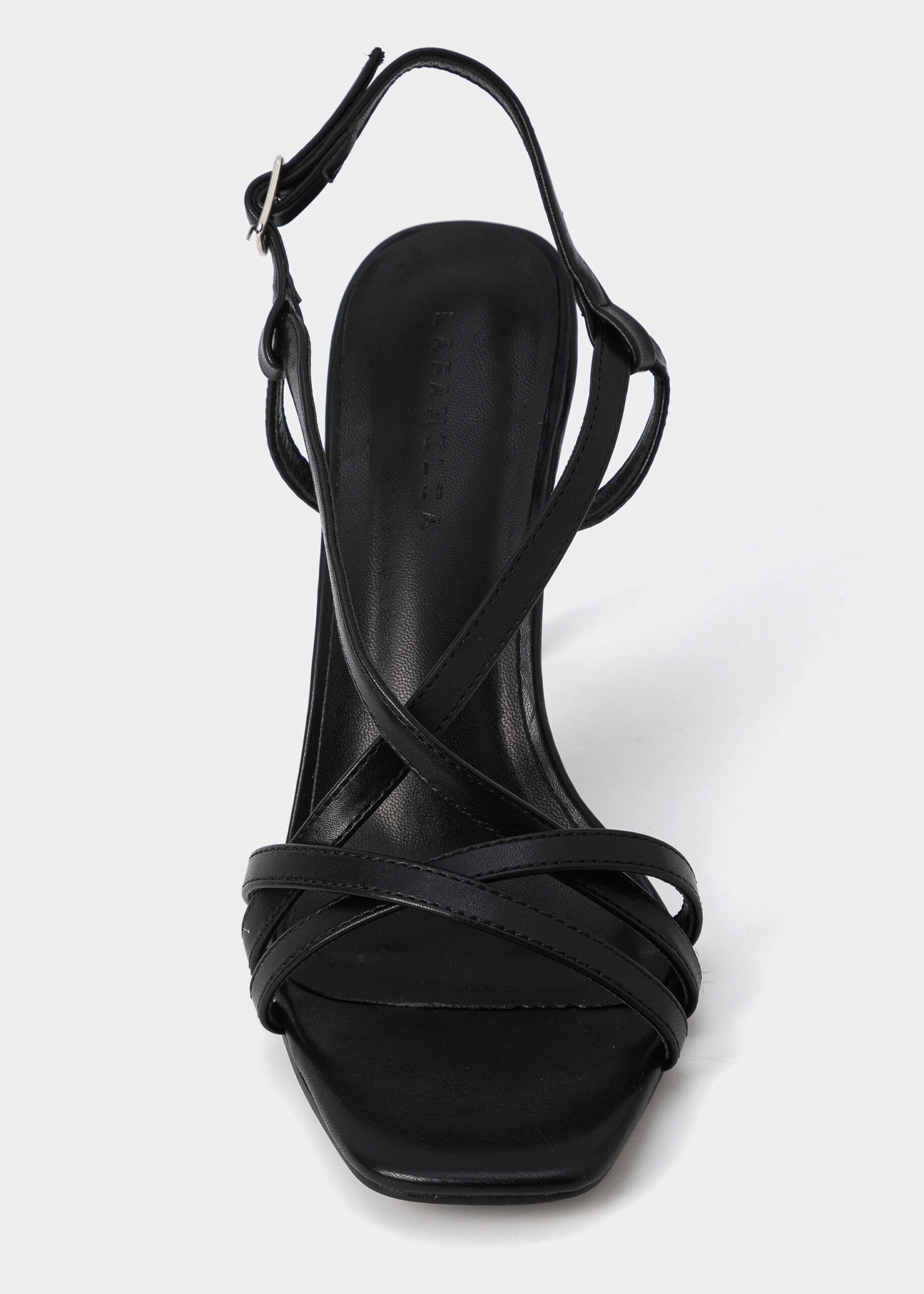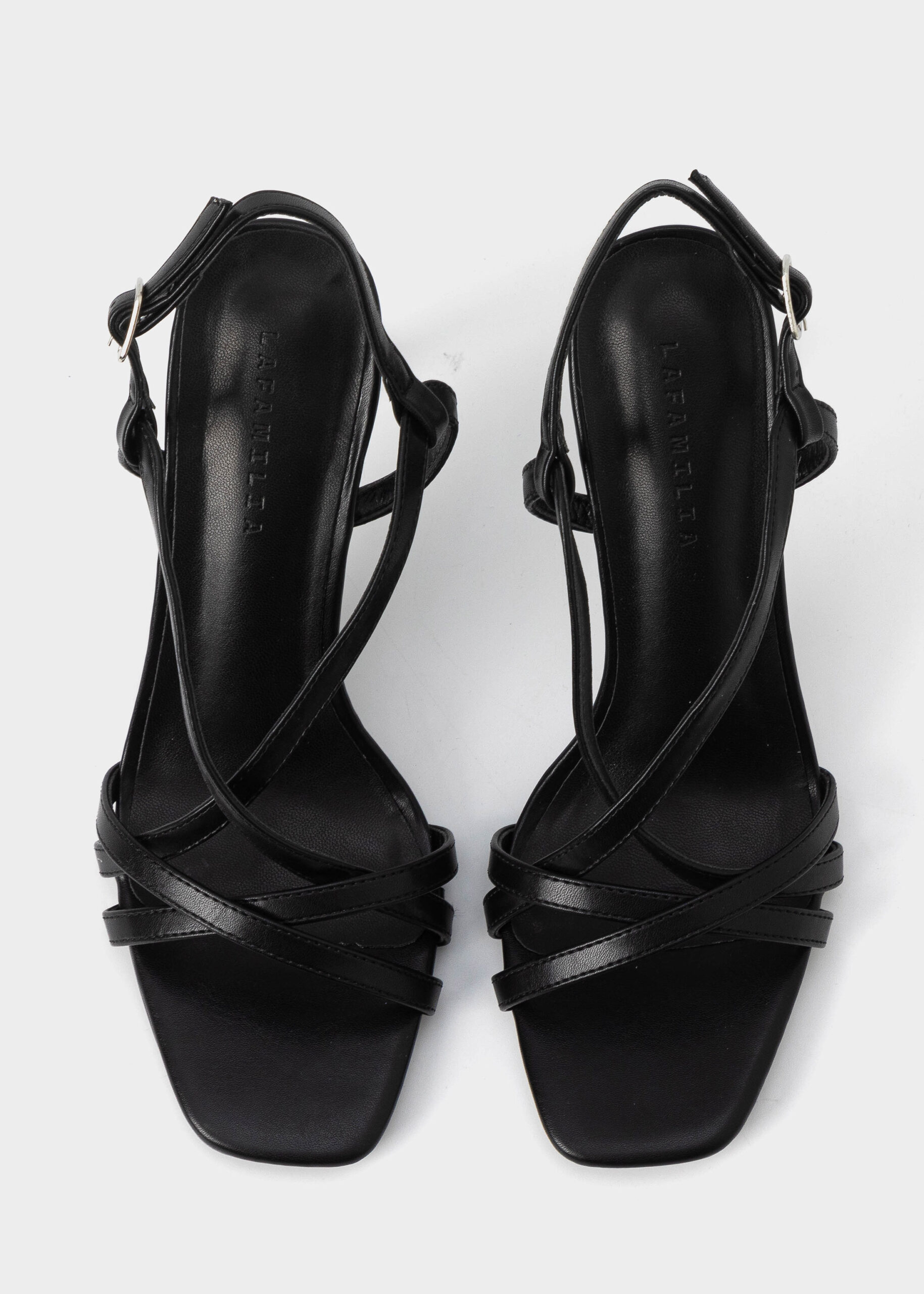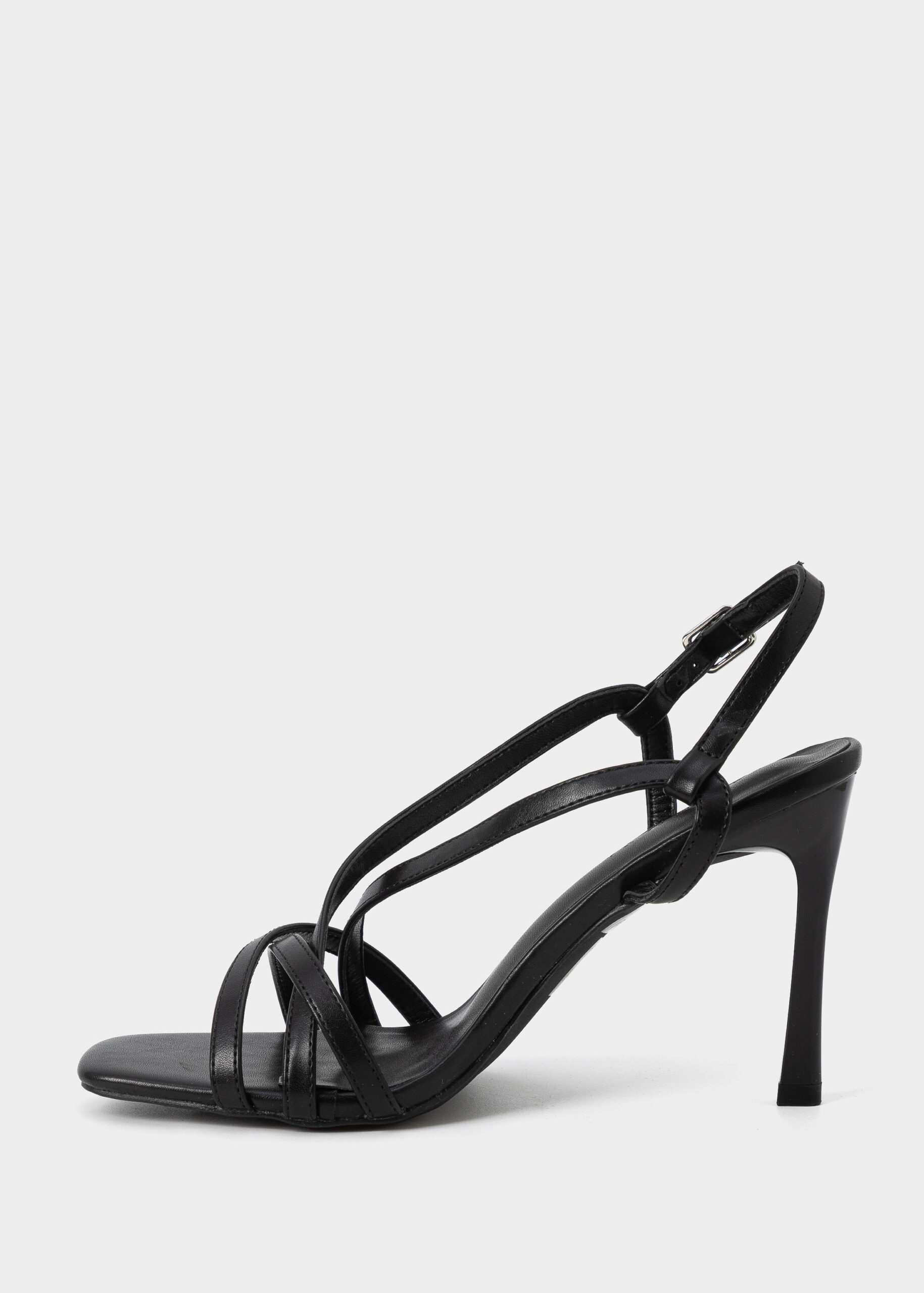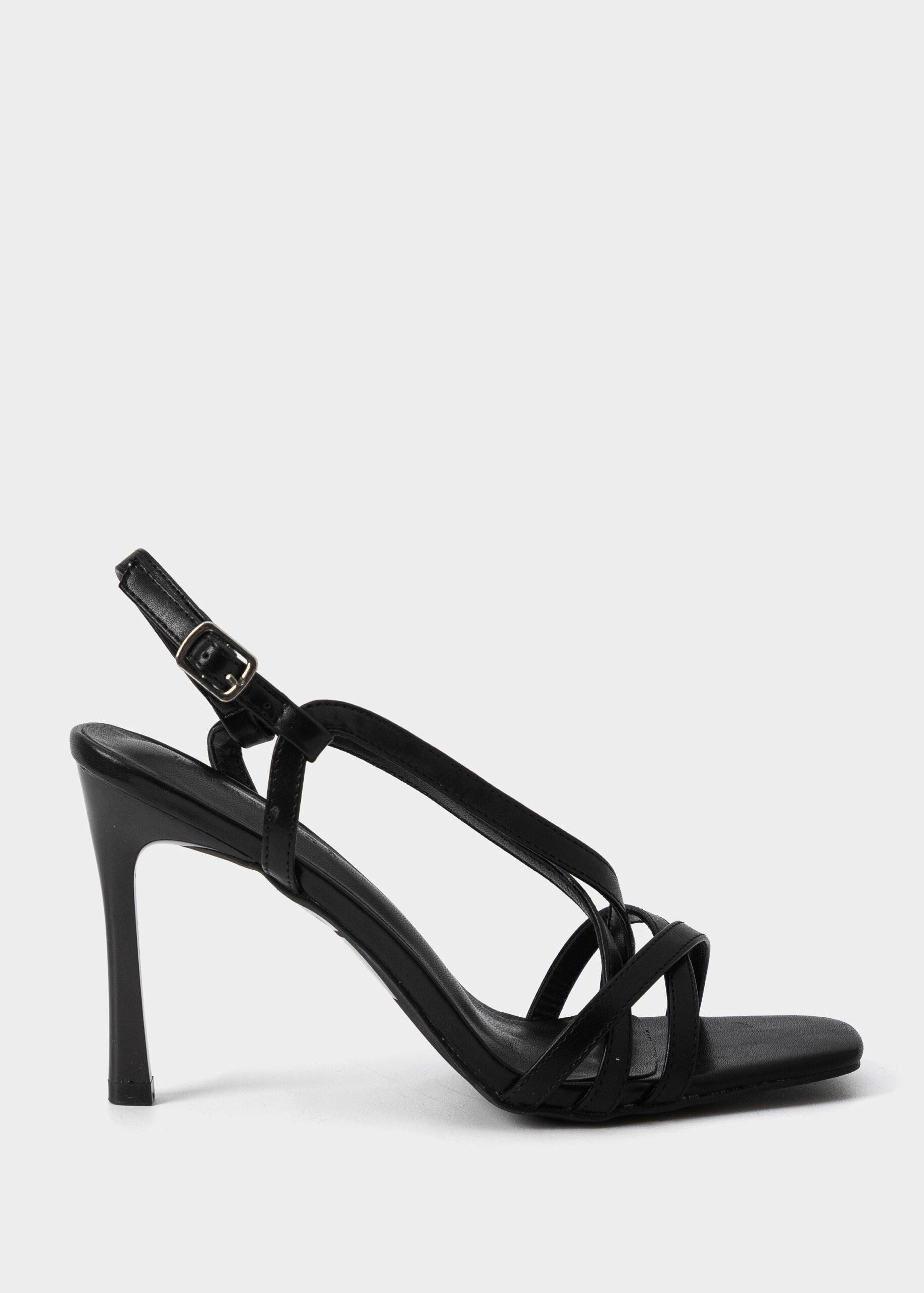 Women sandal, leather, open square toe, upper straps, stiletto heels, ankle strap with buckle to close, unique and modern