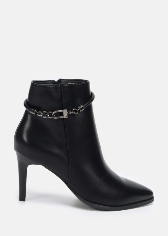 Women shoes, leather, heels, point toe, upper strap with side metal buckle, unique and modern