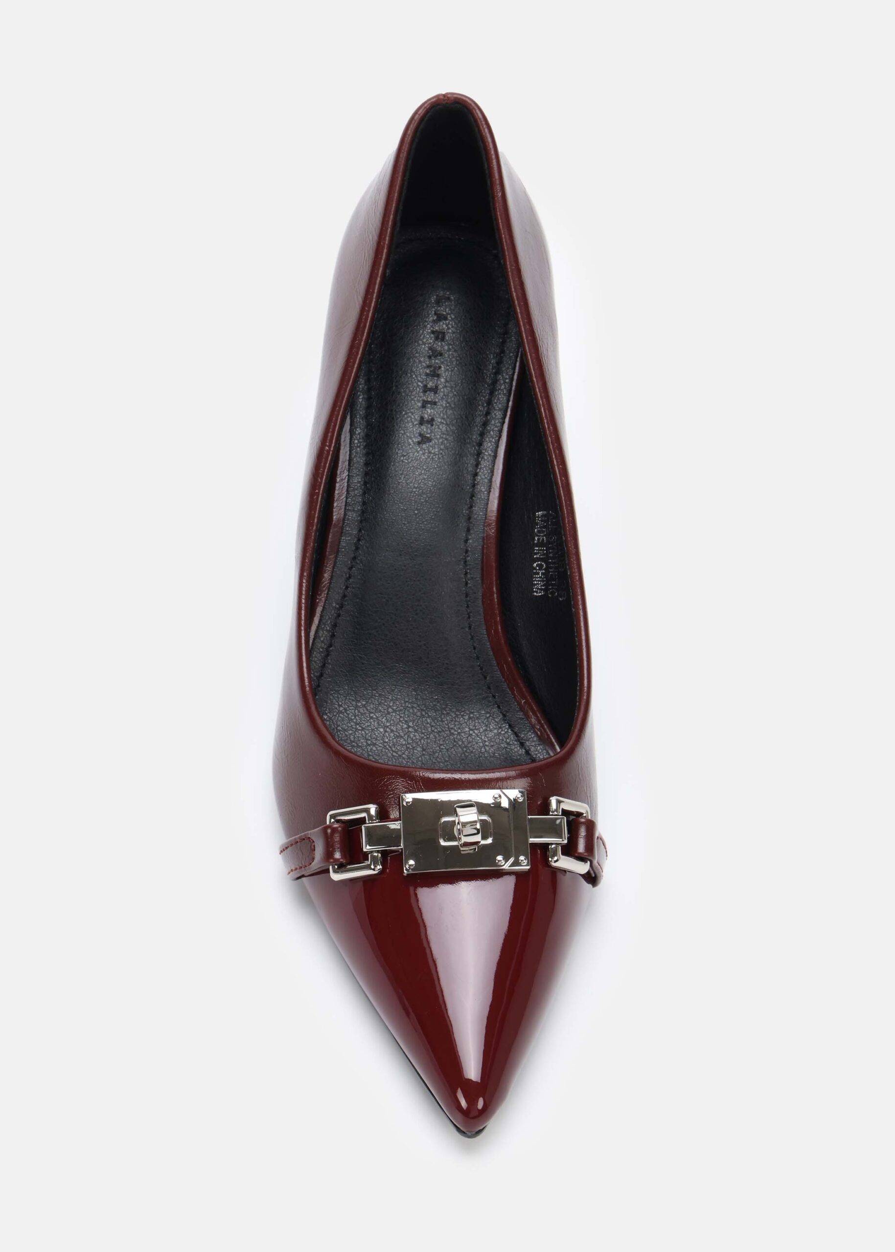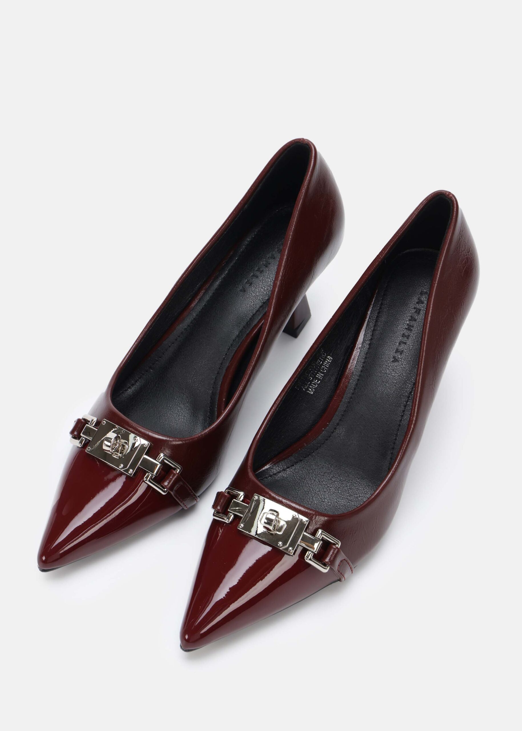 Women shoes, leather, high heels, point patent leather toe, upper chain decor, unique and modern