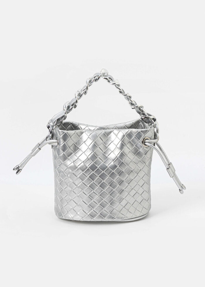 Women bag, leather, patterned, button to close, with elastic straps, hand braided chain, unique and modern