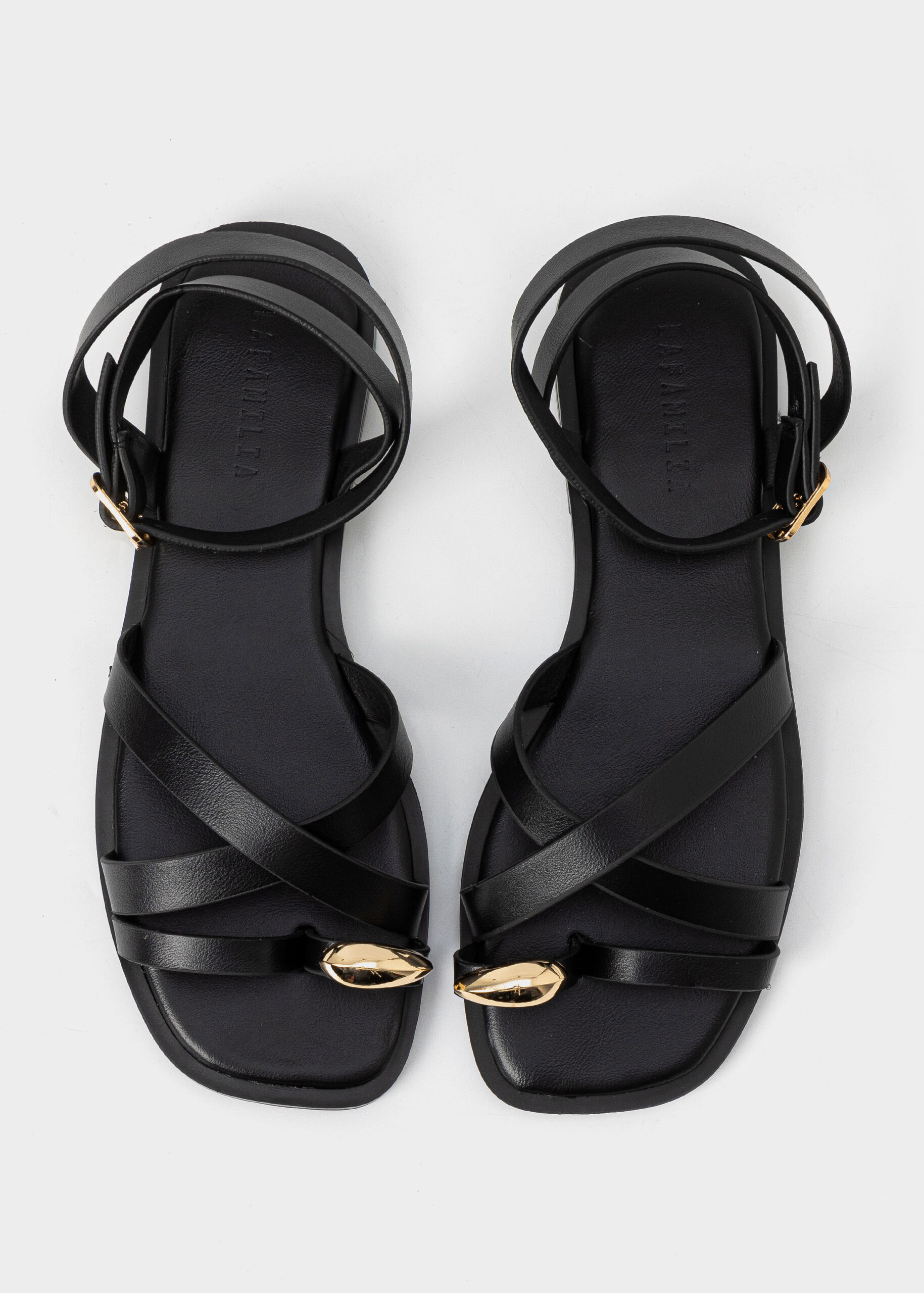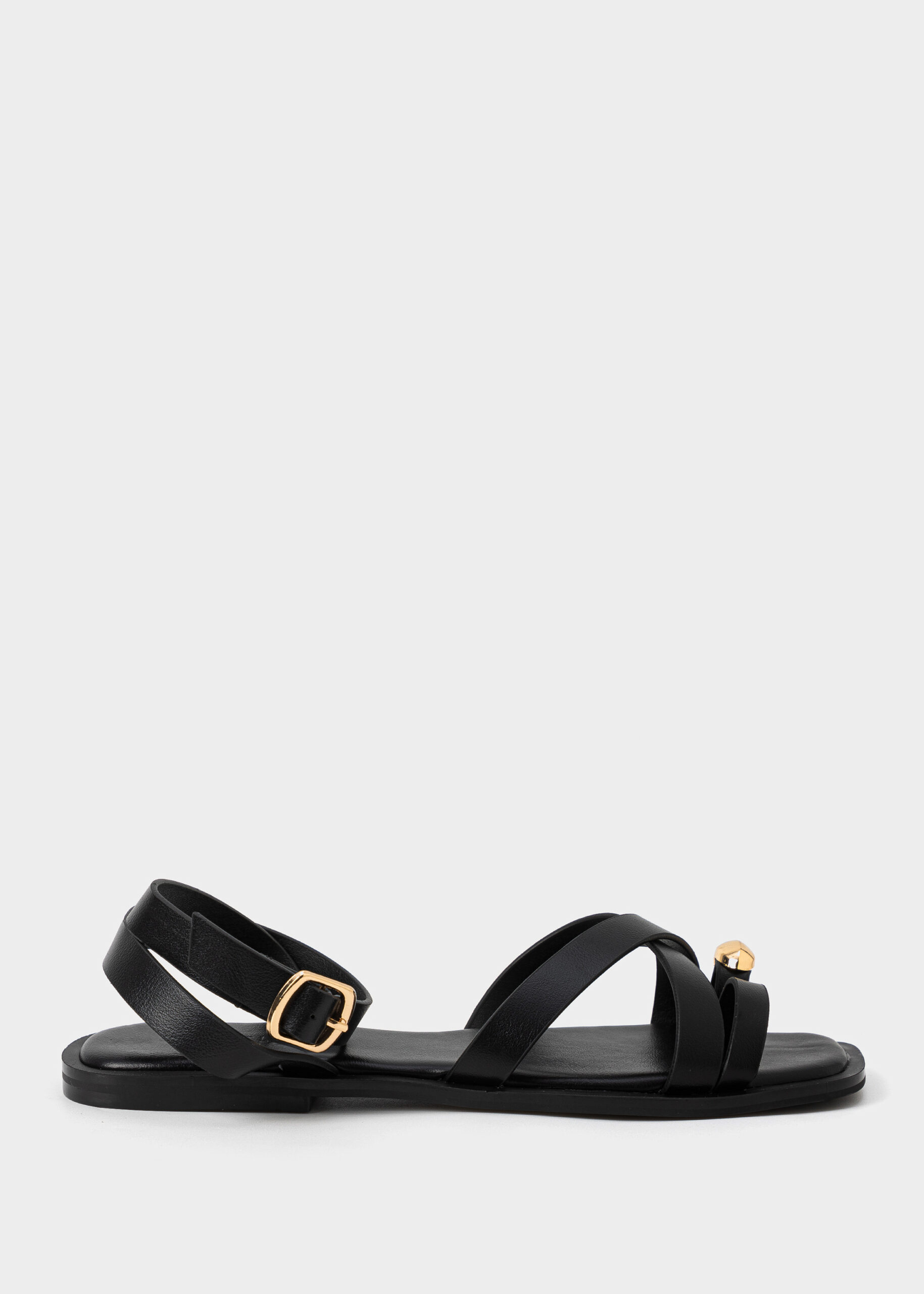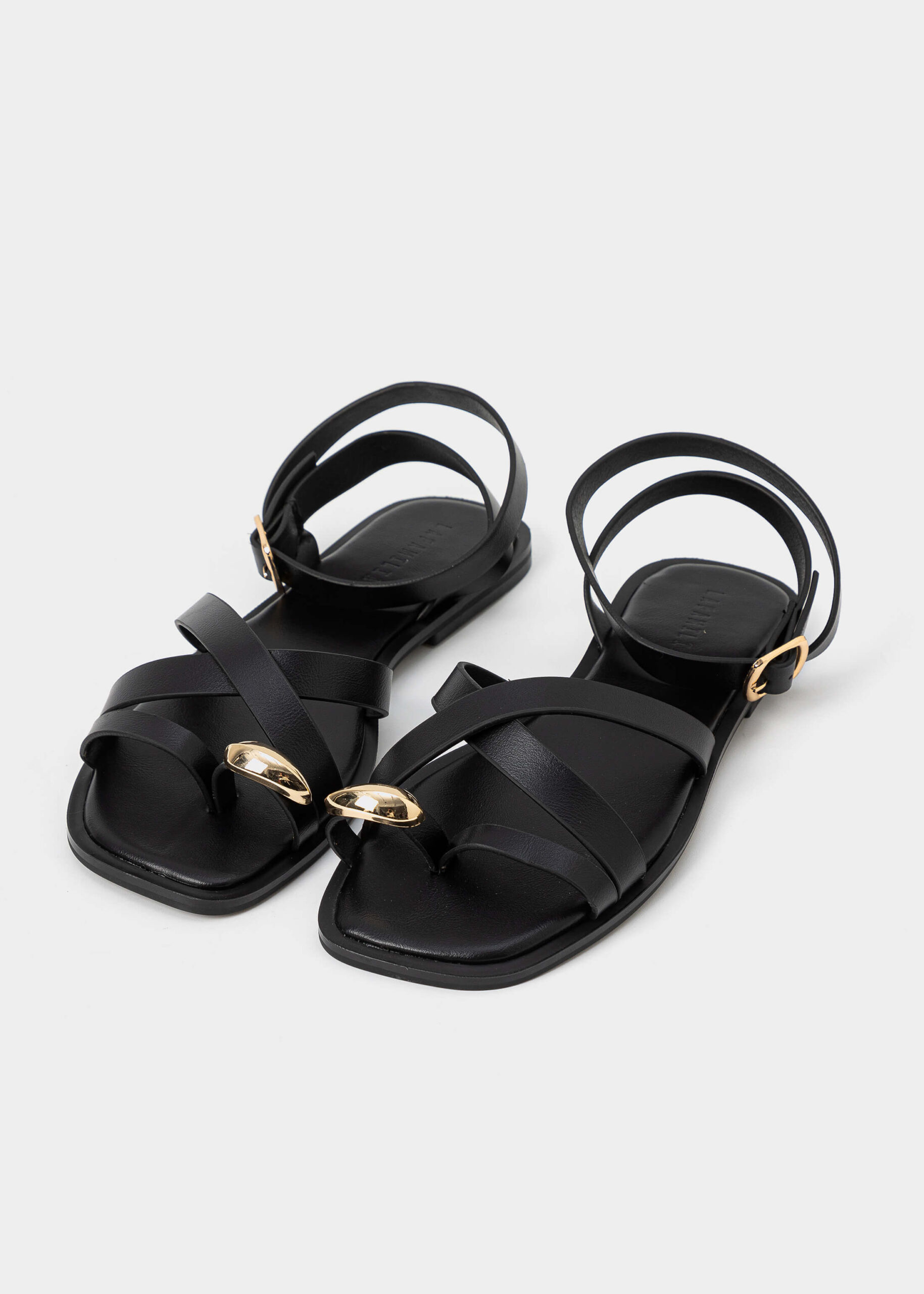 Women sandal, flat, leather, open square roe, upper strap, thong with metal piece decor, ankle strap with side metal buckle to close, unique and comfortable