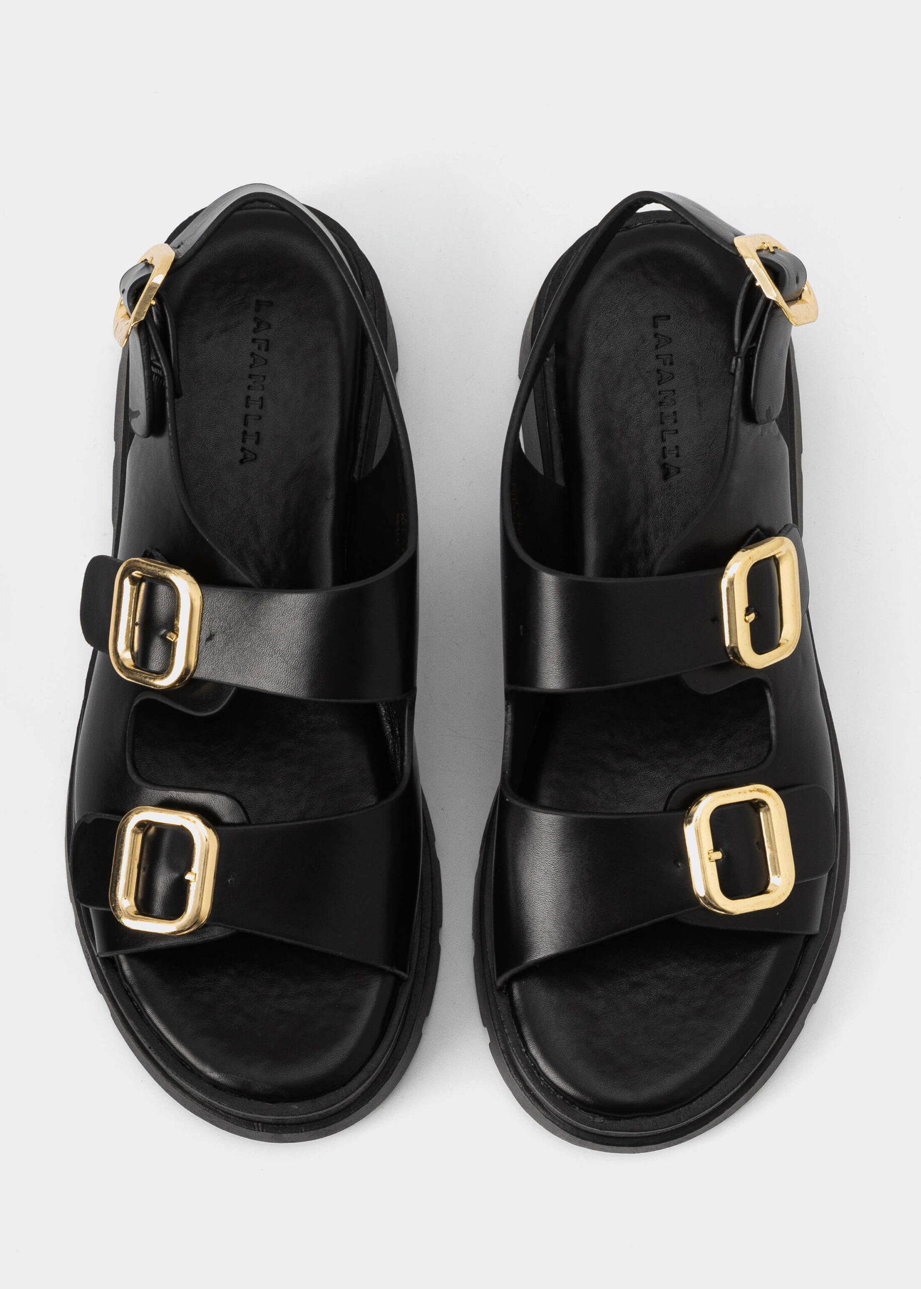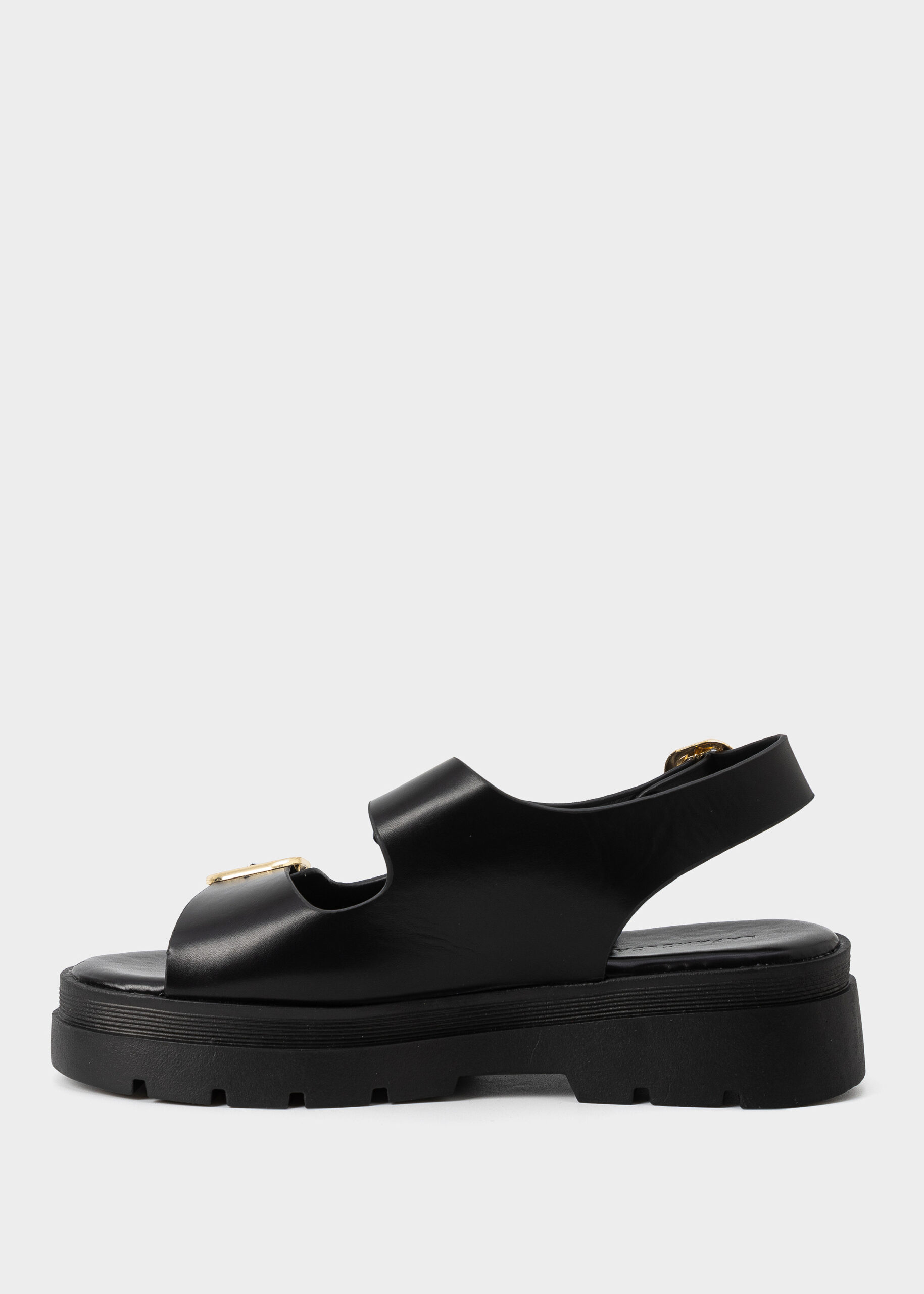 Women sandal, leather, flat, chunky sole, open round toe, upper belts decor, ankle strap with buckle to close, unique and modern