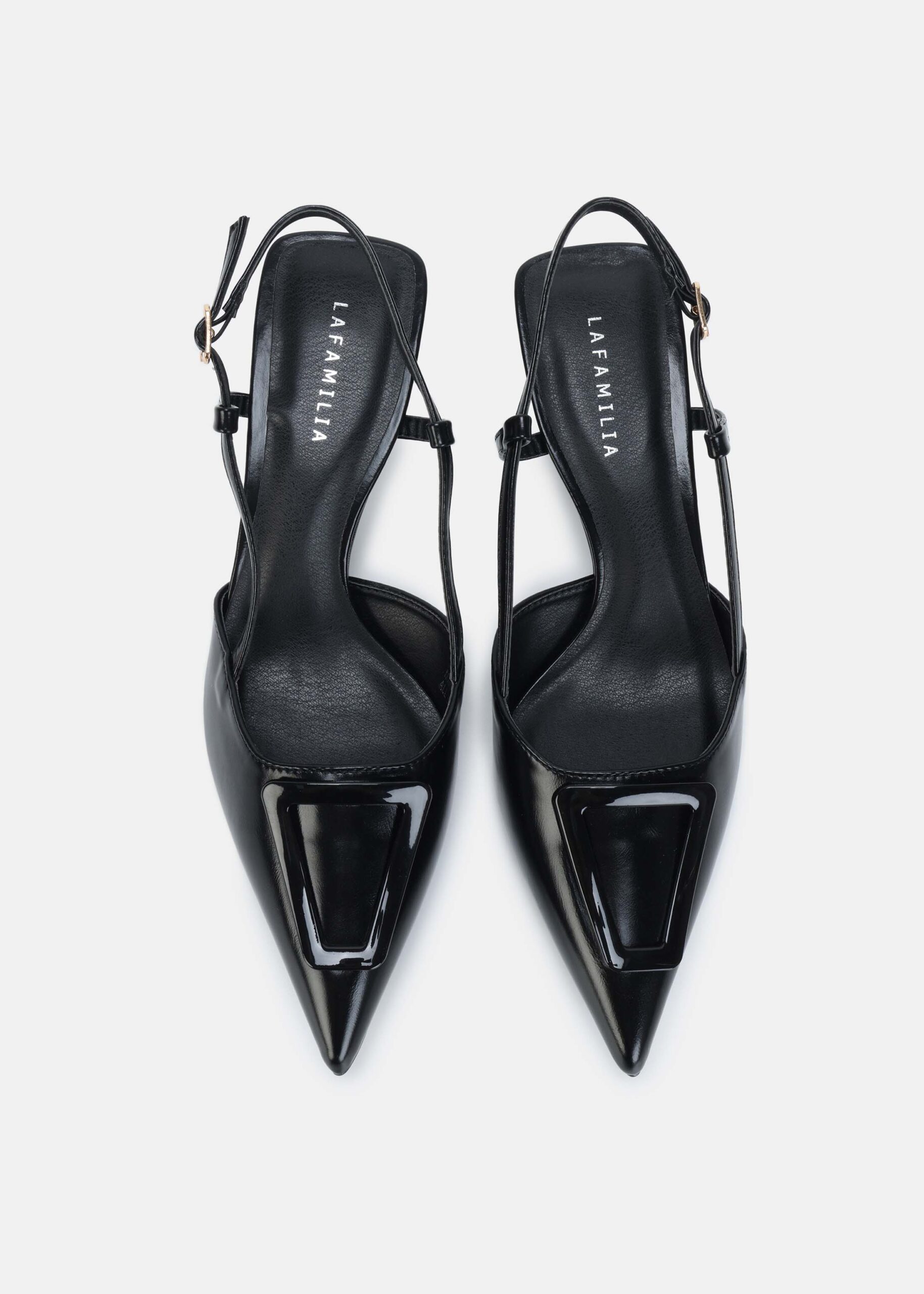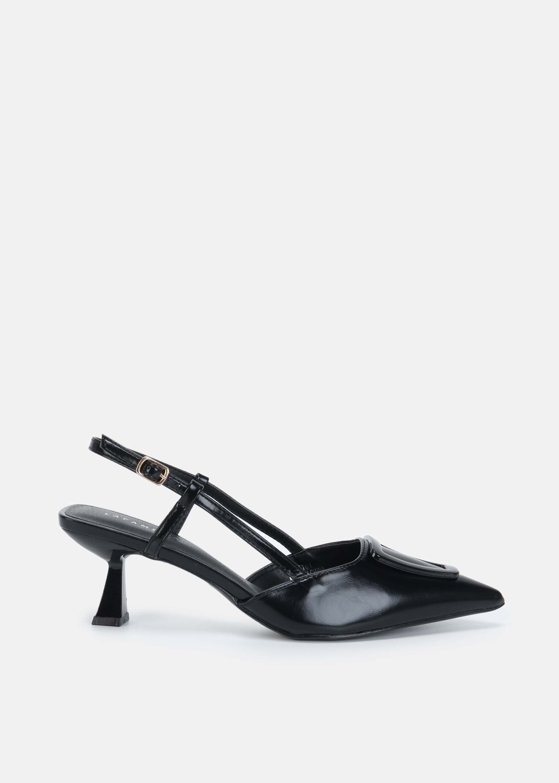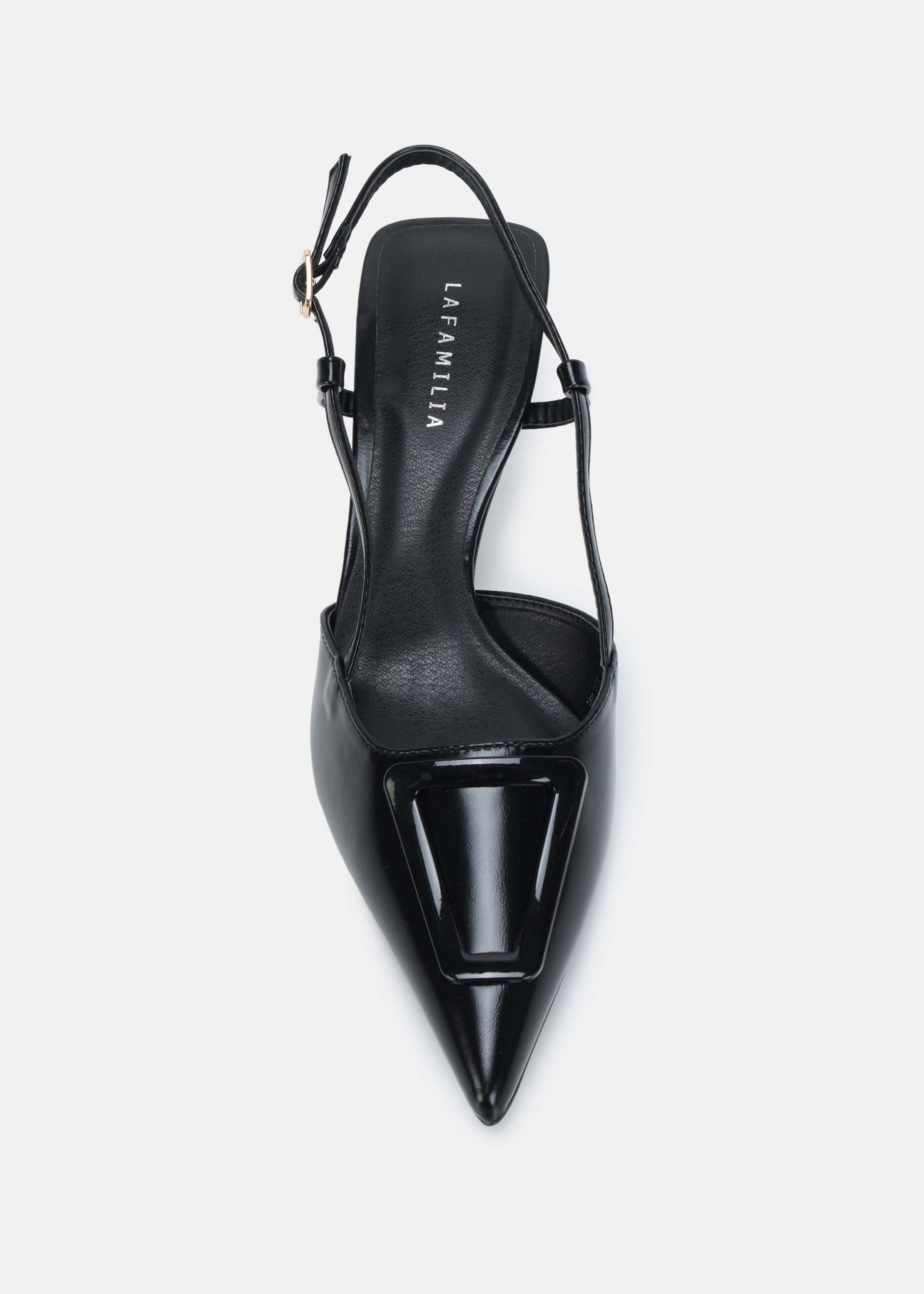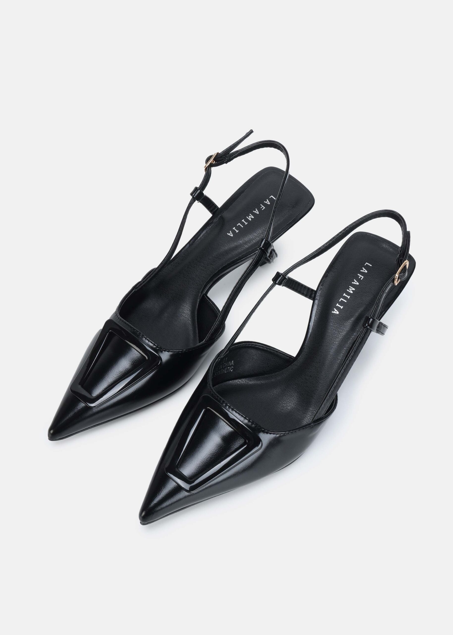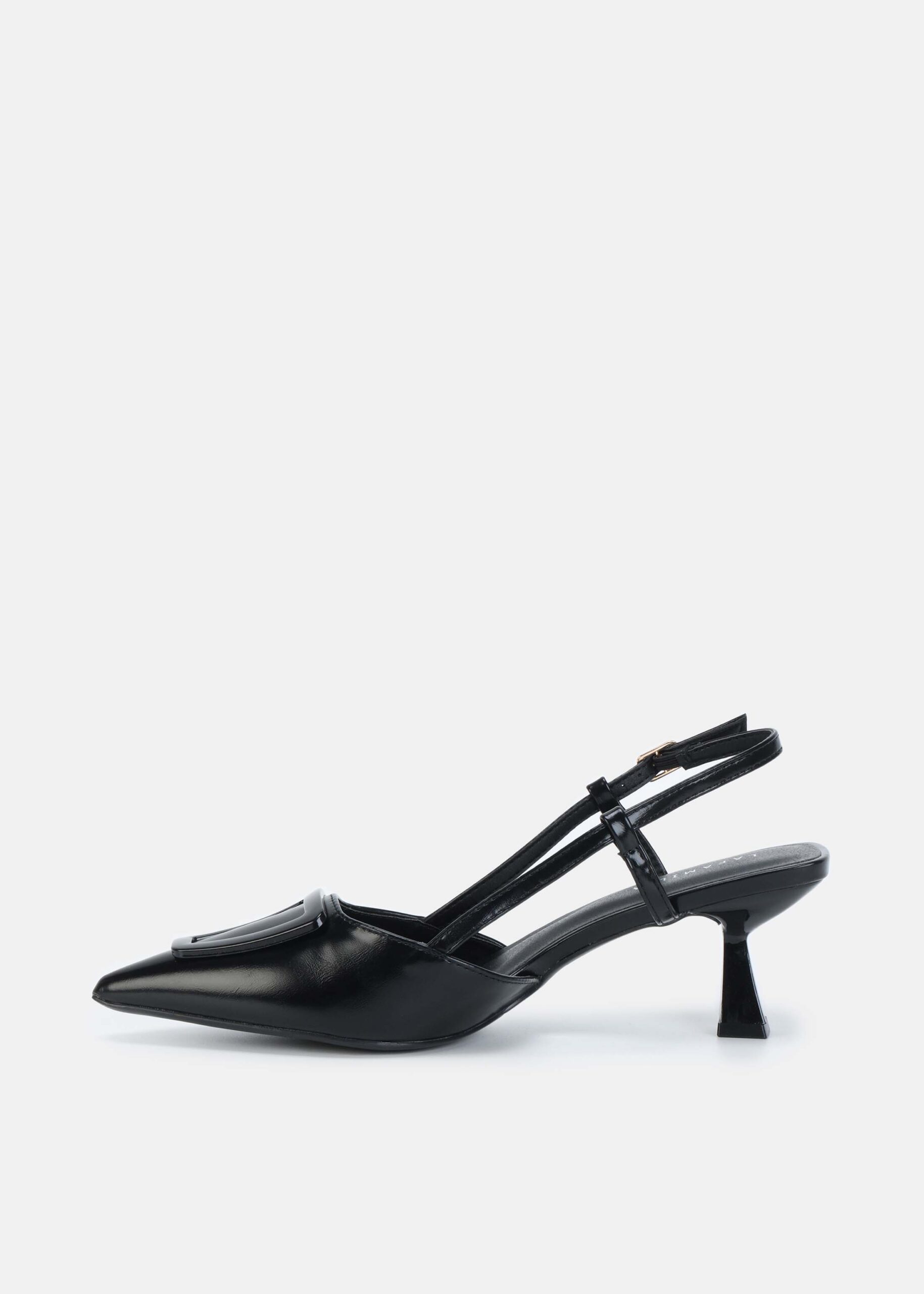 Women sandal, leather, point toe, kitten heels, ankle strap with side buckle, upper piece decor, unique and modern