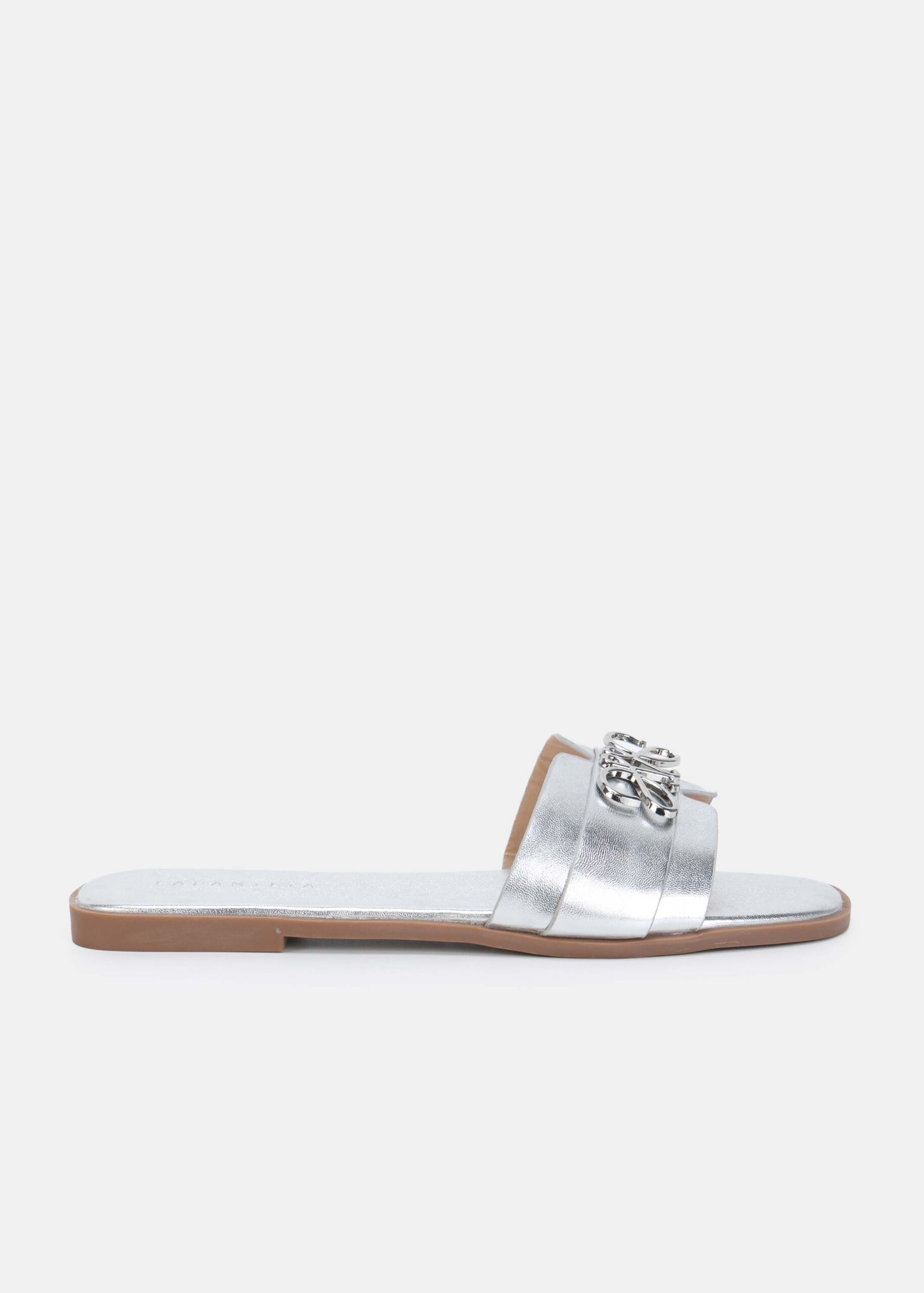Women slipper, leather, flat sole, upper strap with metal piece decor, open square toe, rubber sole, unique and comfortable