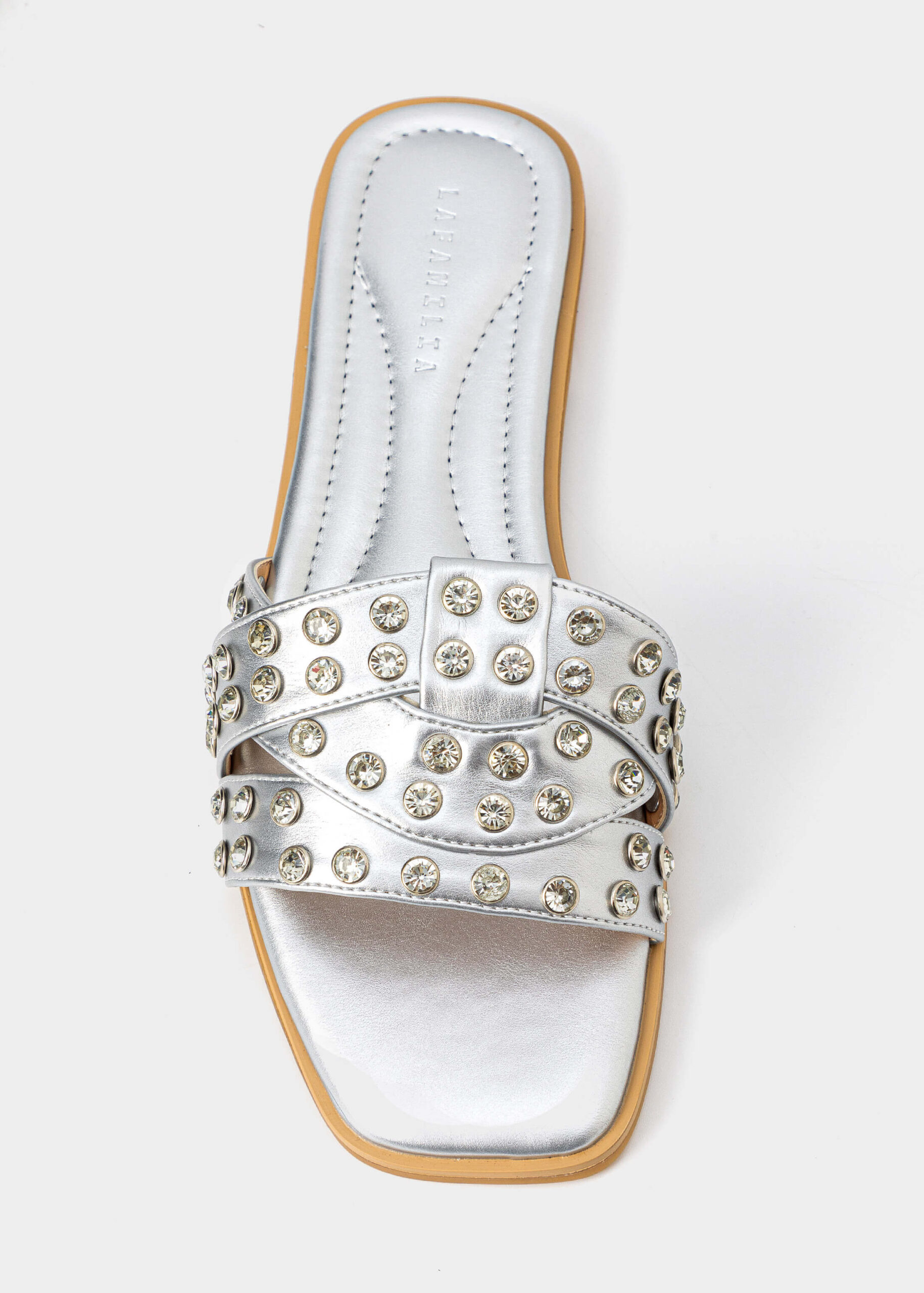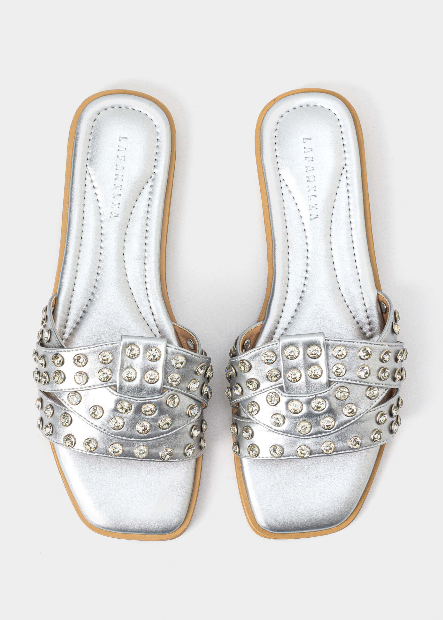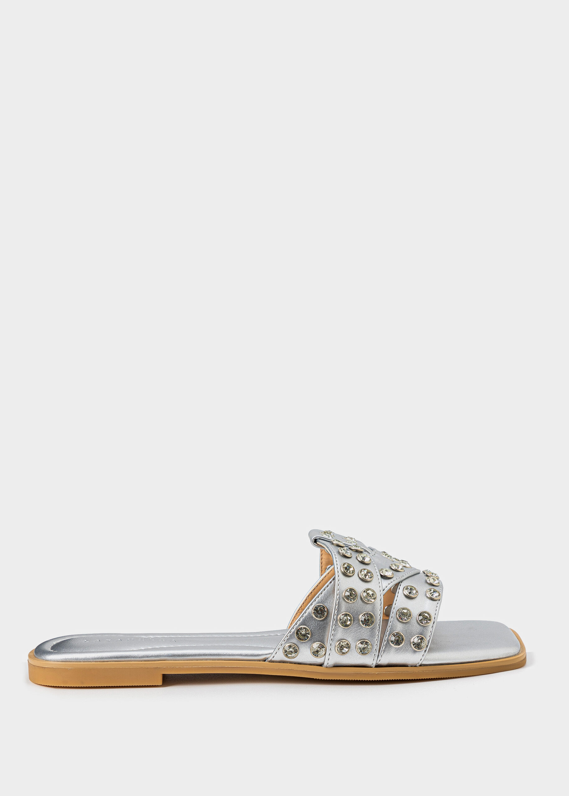 Women slipper, flat, leather, upper strass decor, open square toe, unique and modern