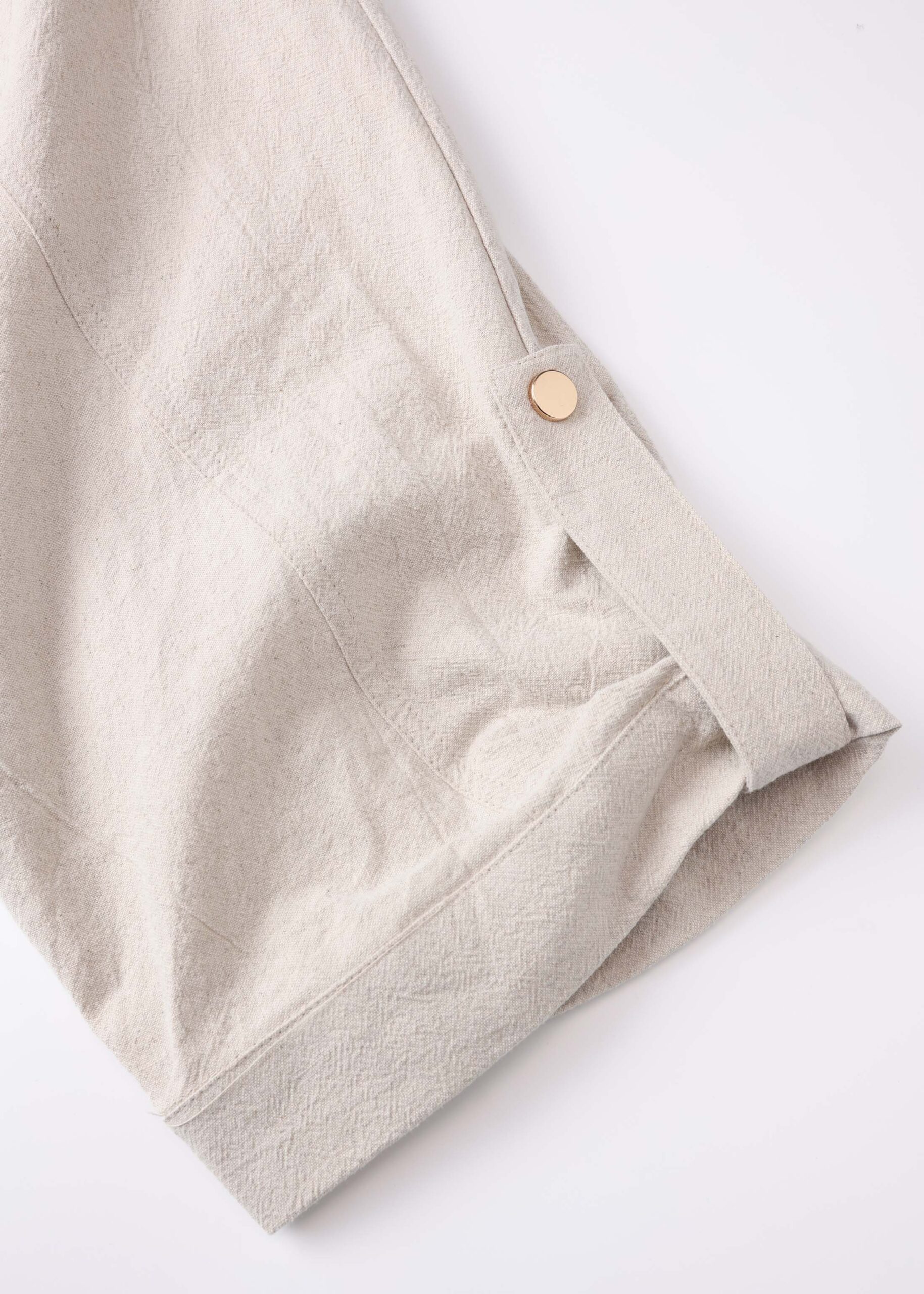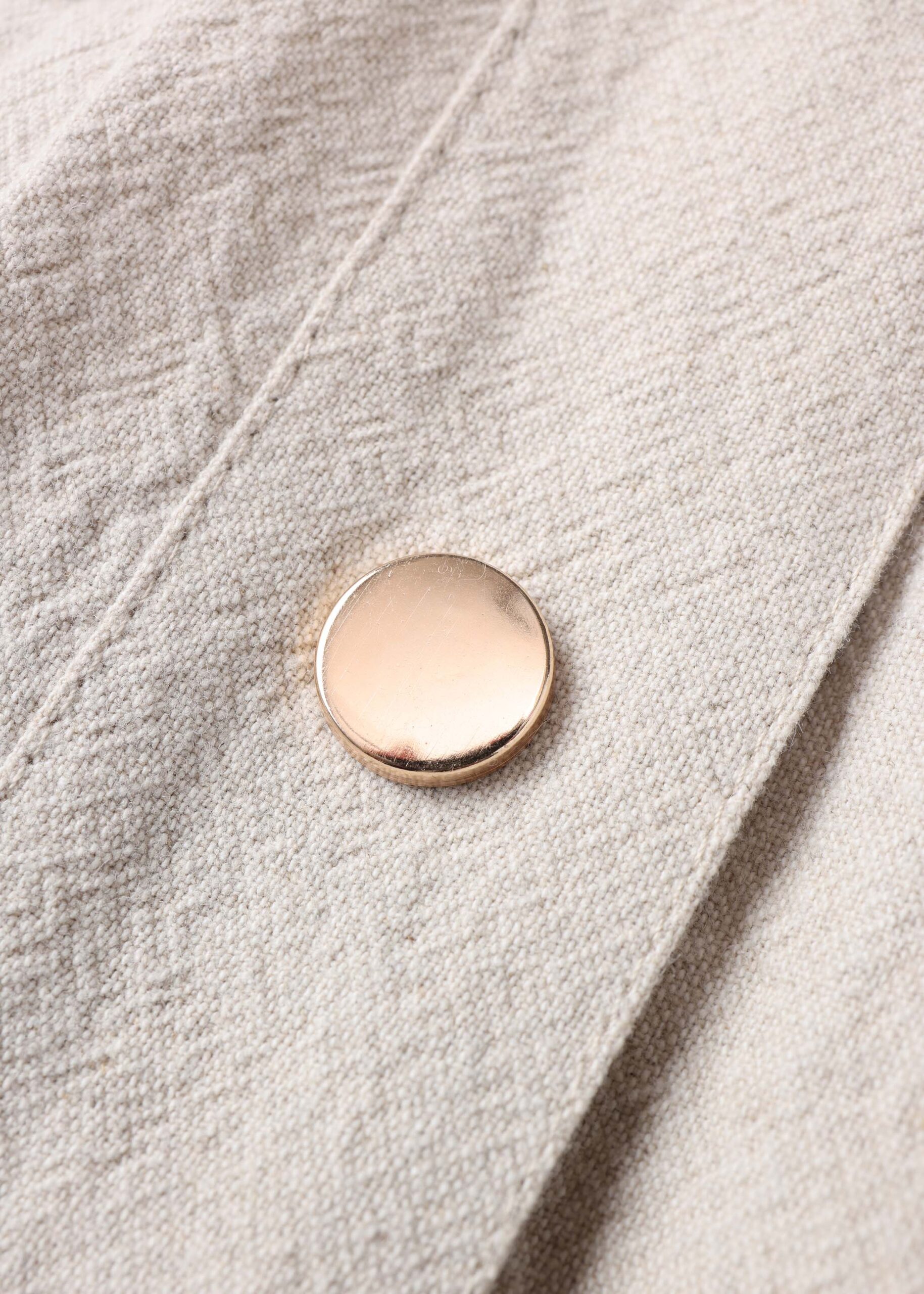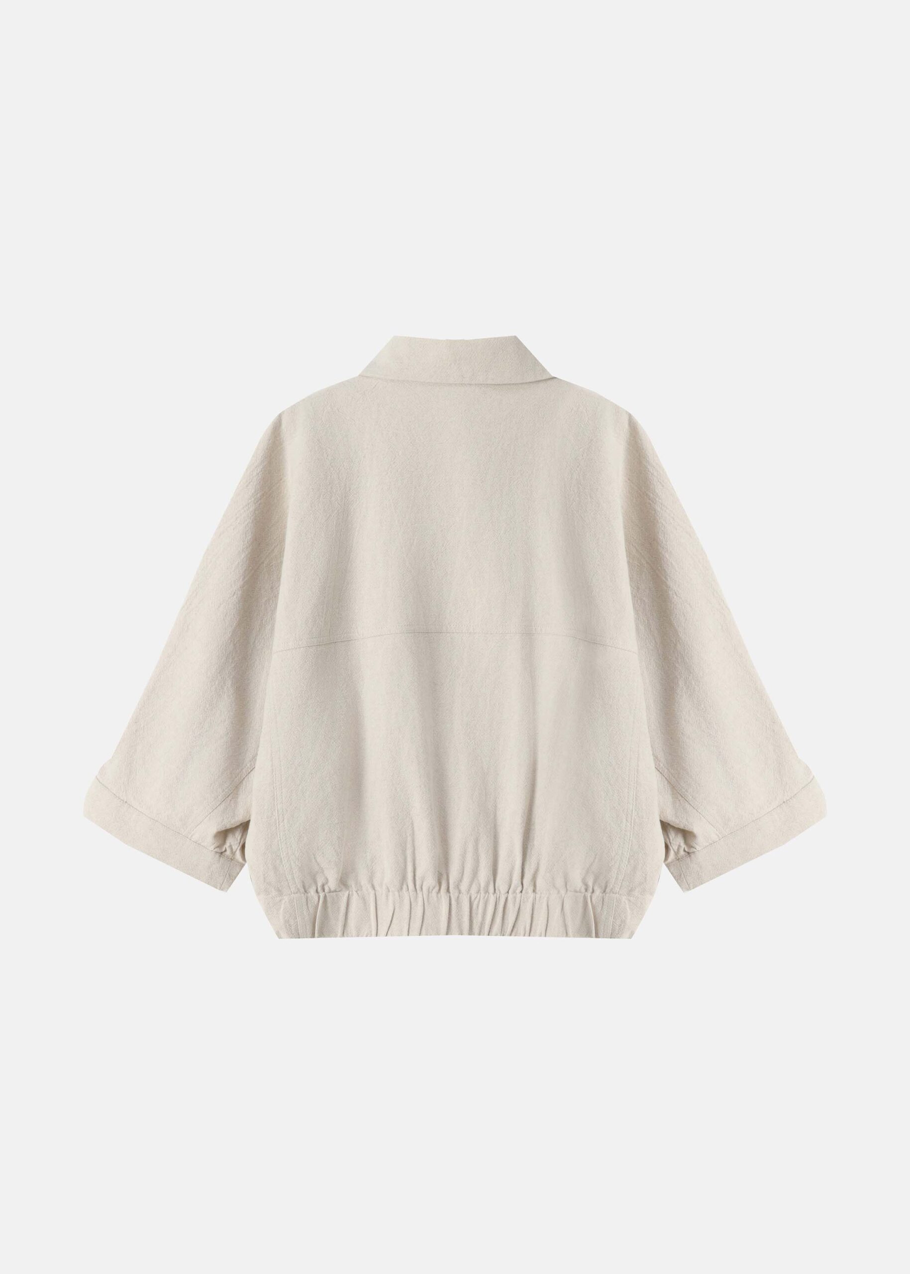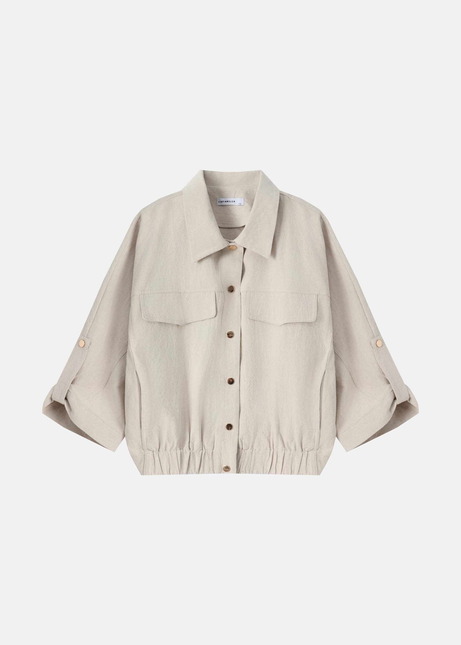 Women jacket, linen, rolled collar, mid-length sleeves, front flap chest pockets, front pockets, elastic hem, front buttons to close, unique and practical