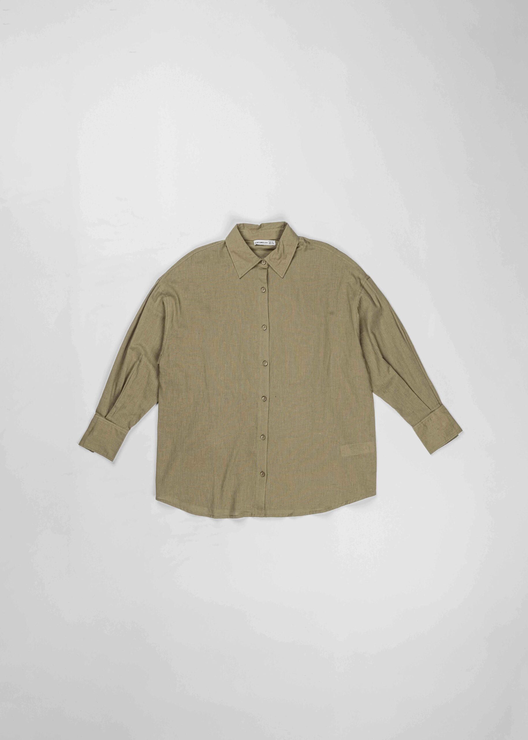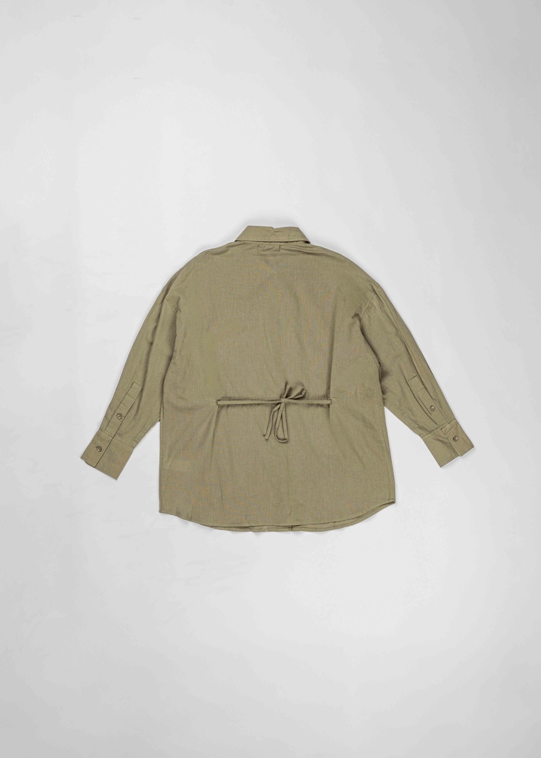 Women shirt, longline, plain, rolled collar, front buttons to close, long sleeves with tight cuff, tie from the back, unique and practical