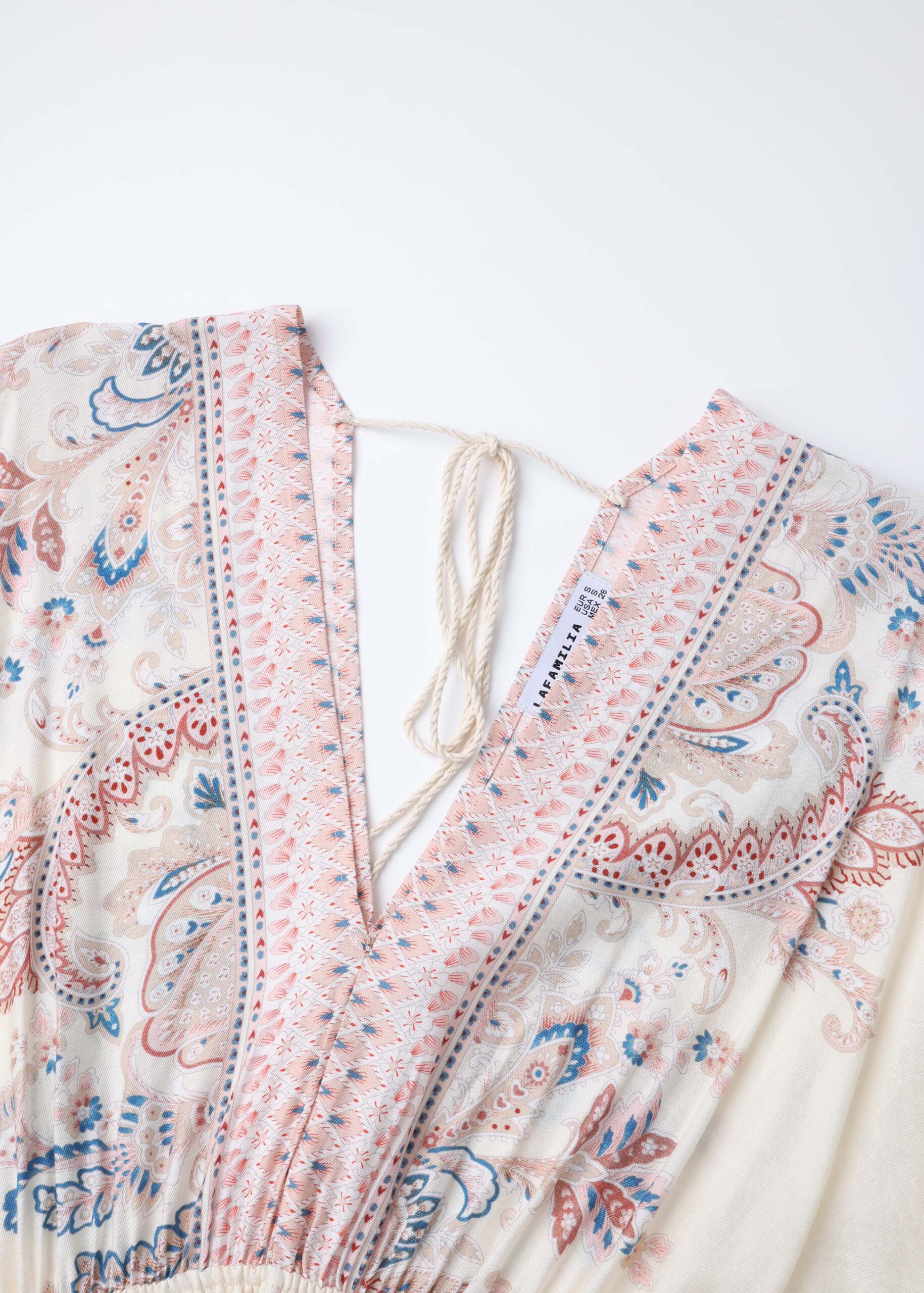 Women dress, maxi, V neck, flowy kimono-sleeves, elasticated high waist, tie string details at the back of the neck, paisly printed, unique and modern
