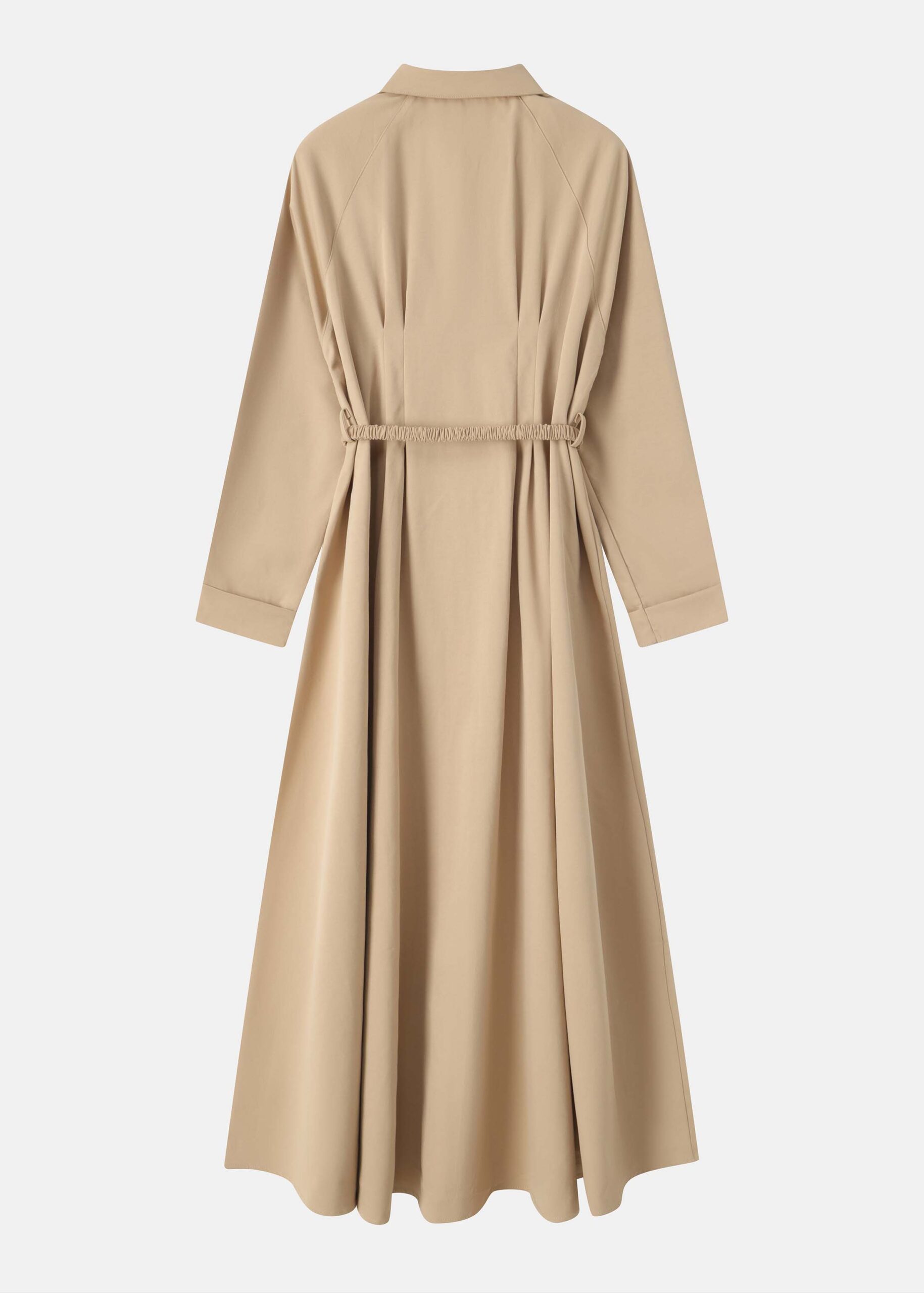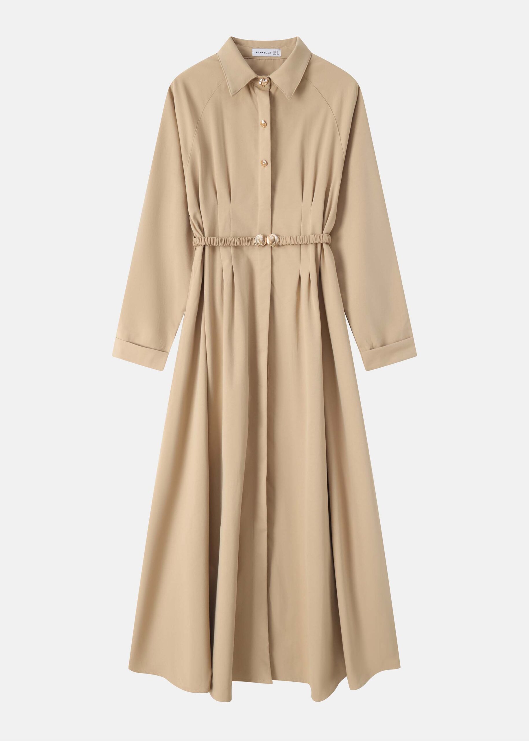 Women dress, maxi, rolled collar, front buttons to close, long sleeves, waist elastic with front buckle, pleated waist, unique and modern