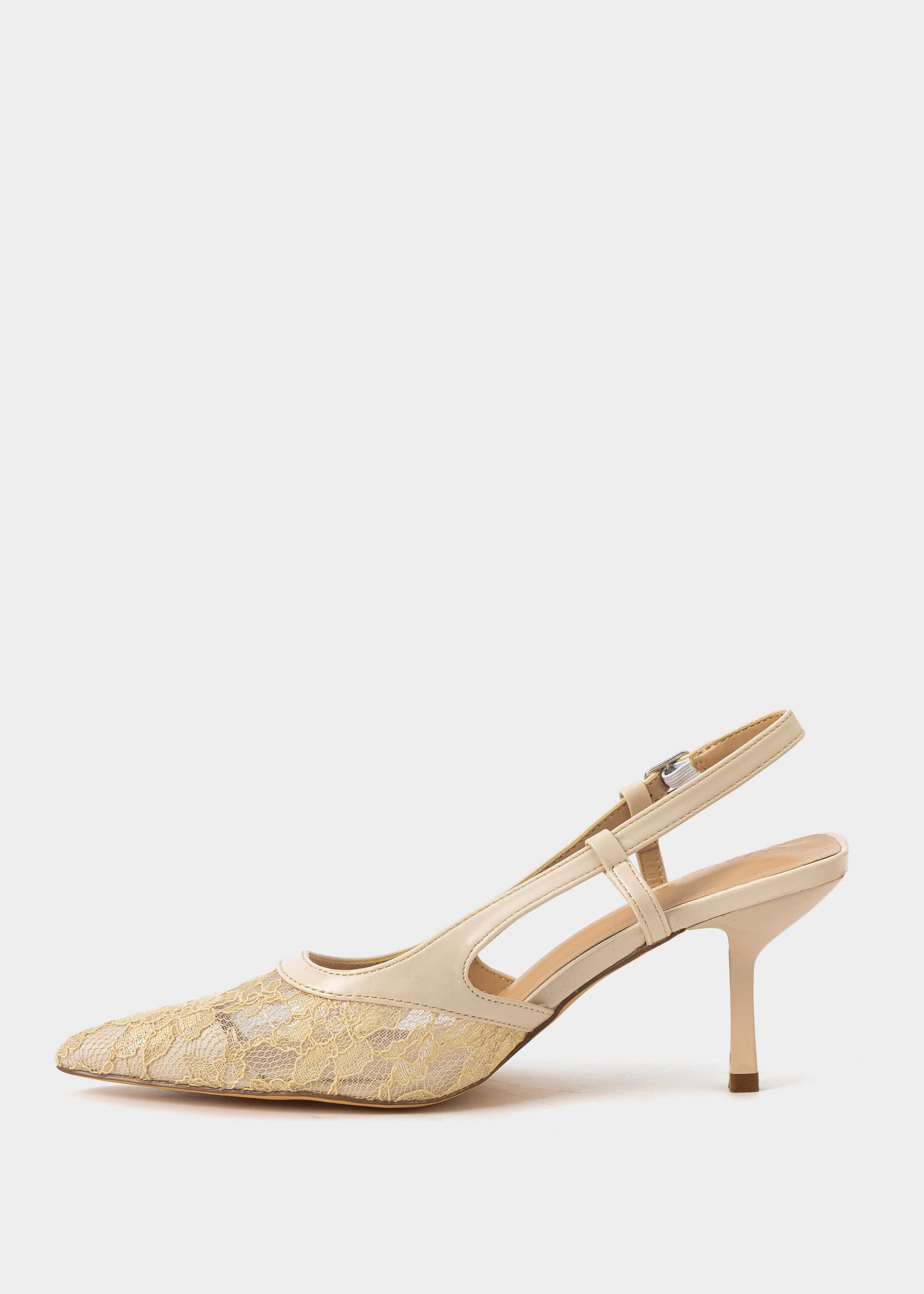 Women sandal, mesh fabric, embroidery, point toe, heels, ankle strap with side metal buckle to close, unique and modern