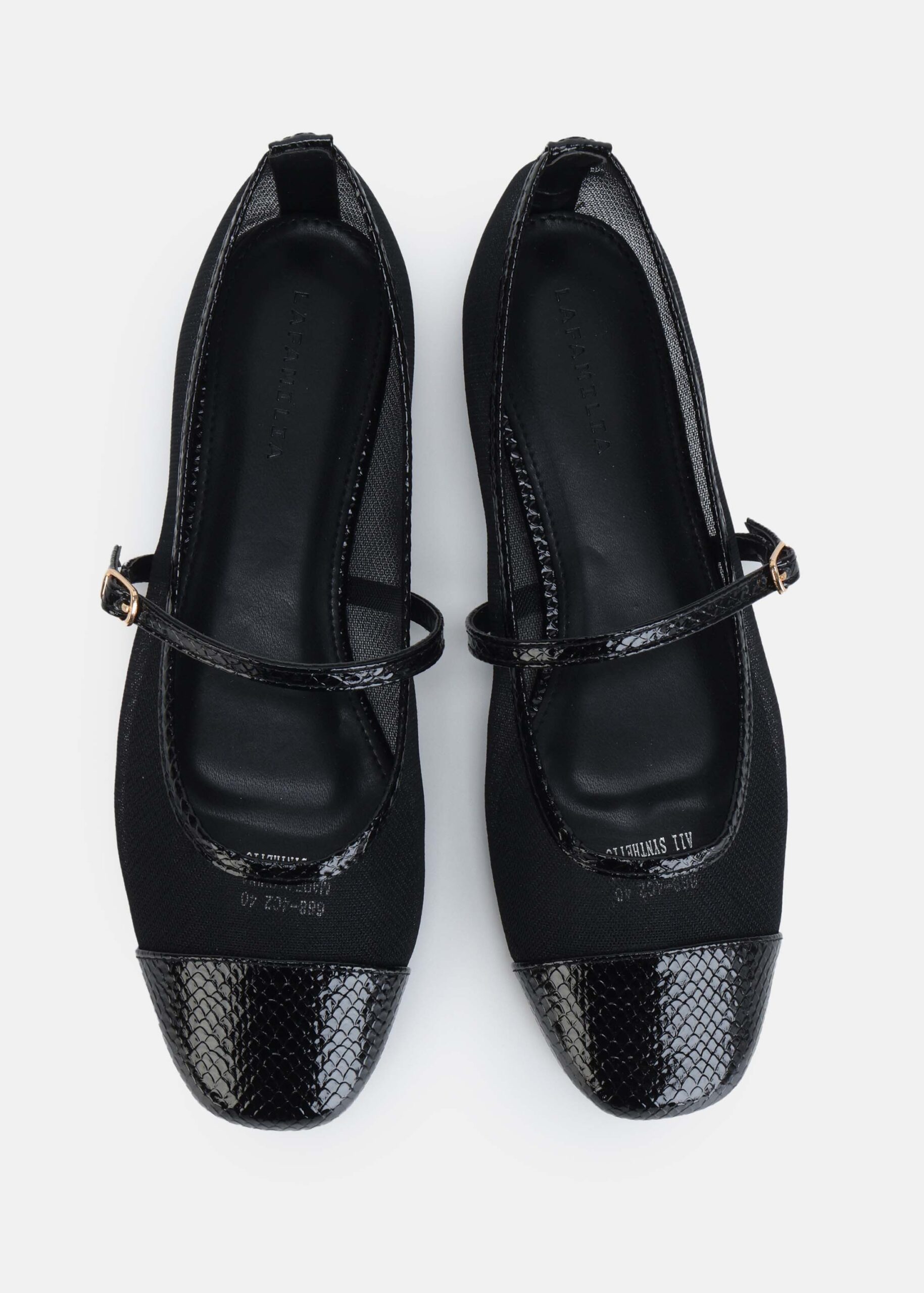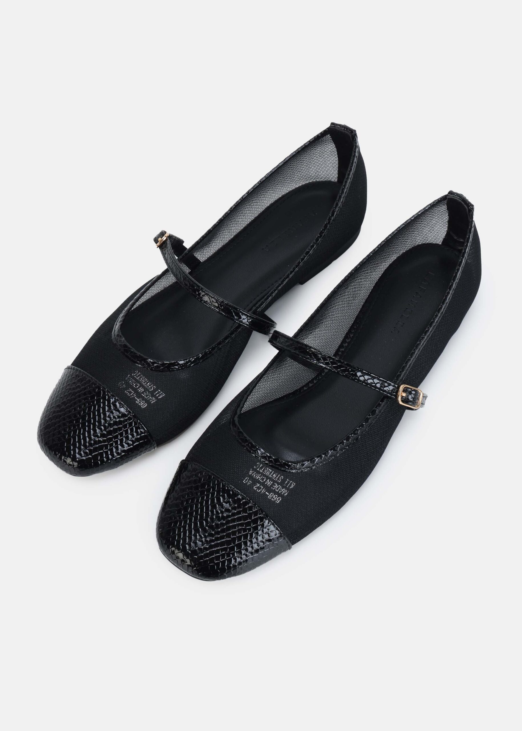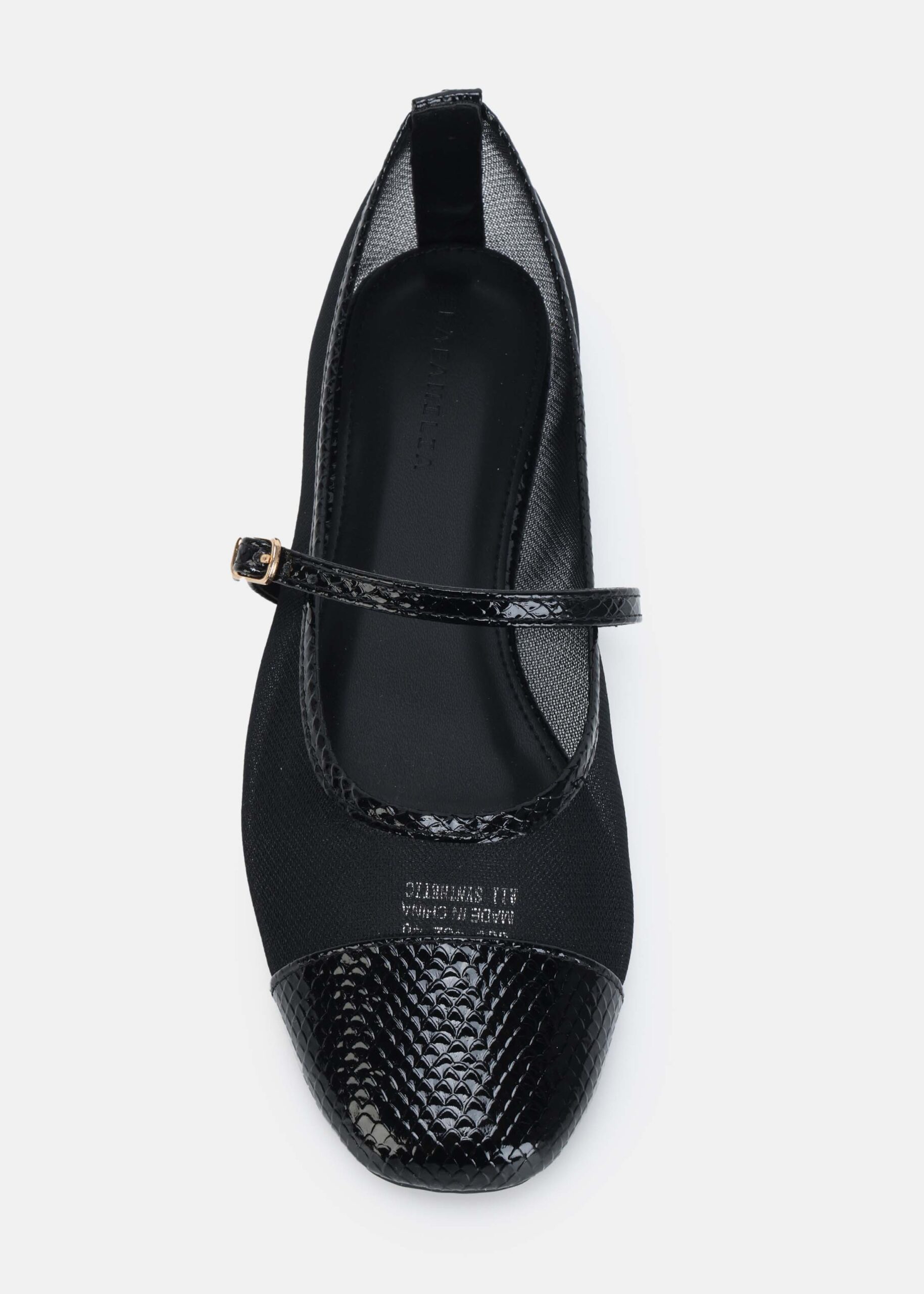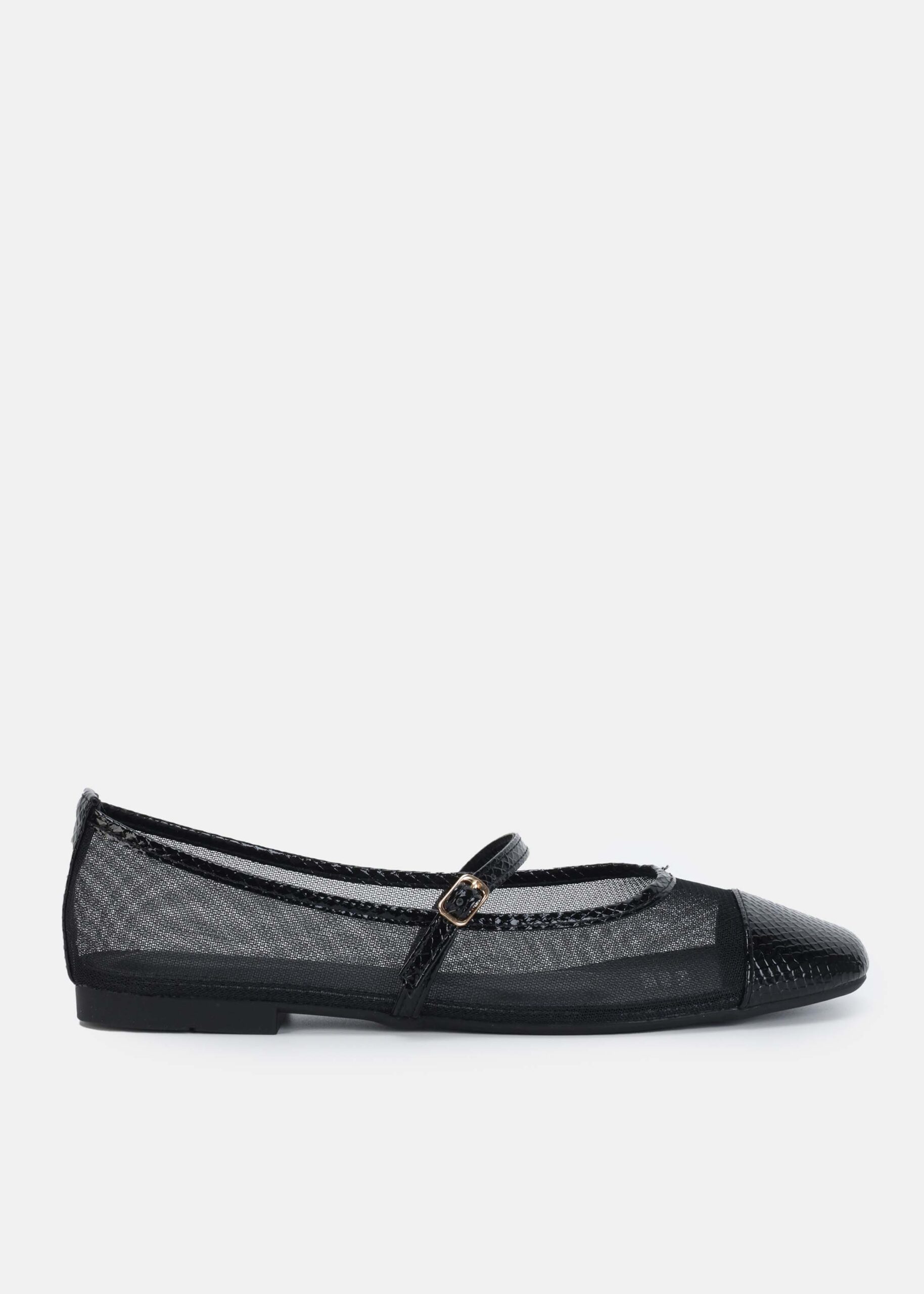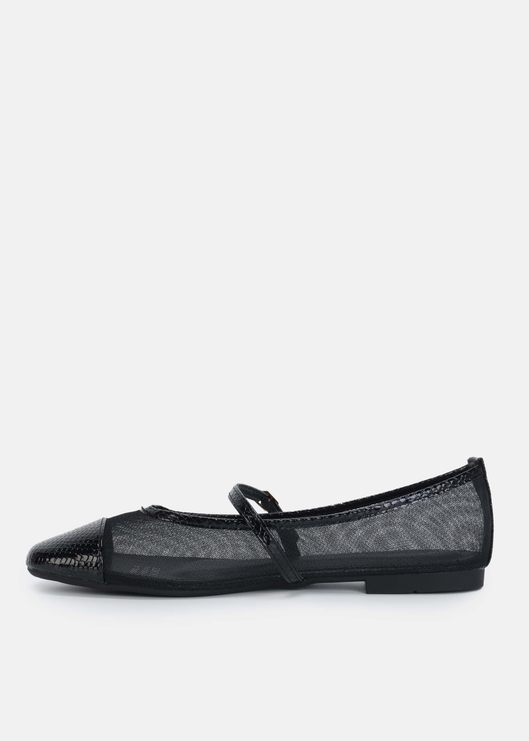 Women ballerina, mesh fabric with front embossed leather toe, upper strap with side buckle, unique and modern