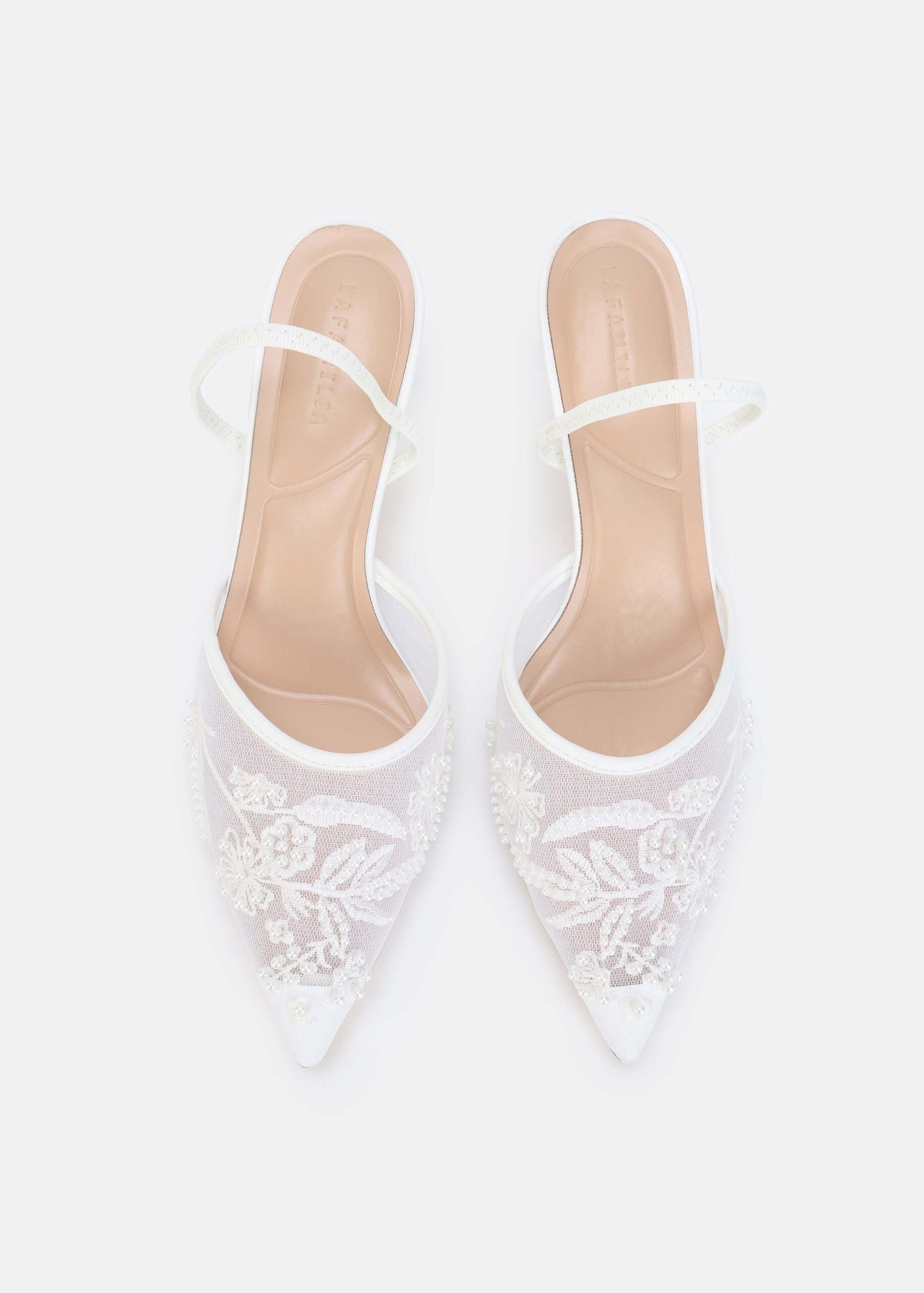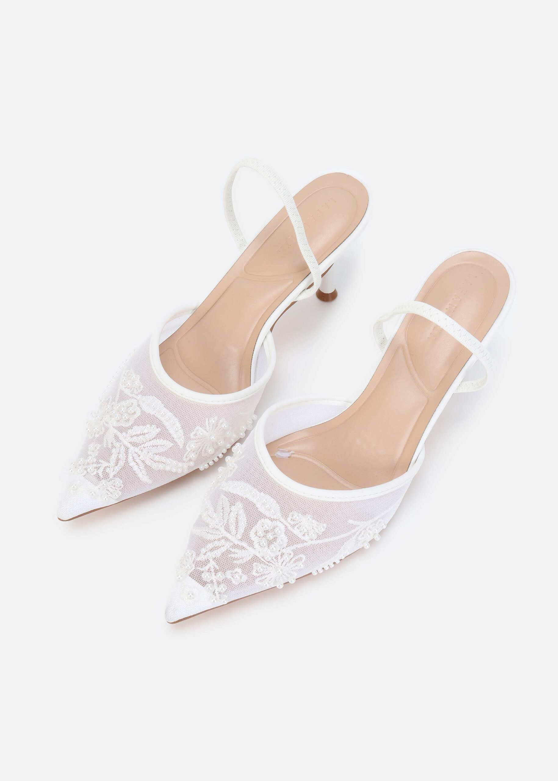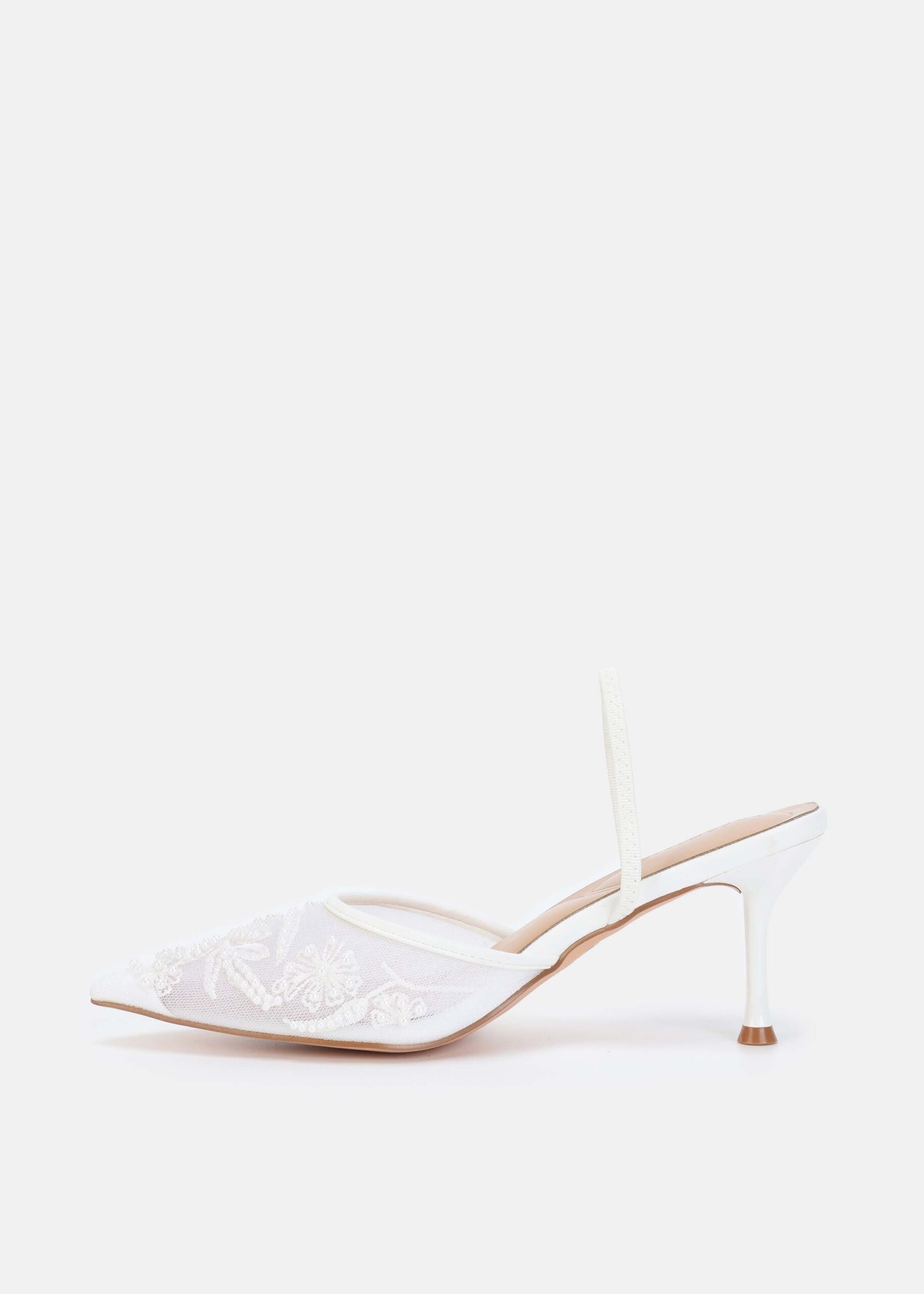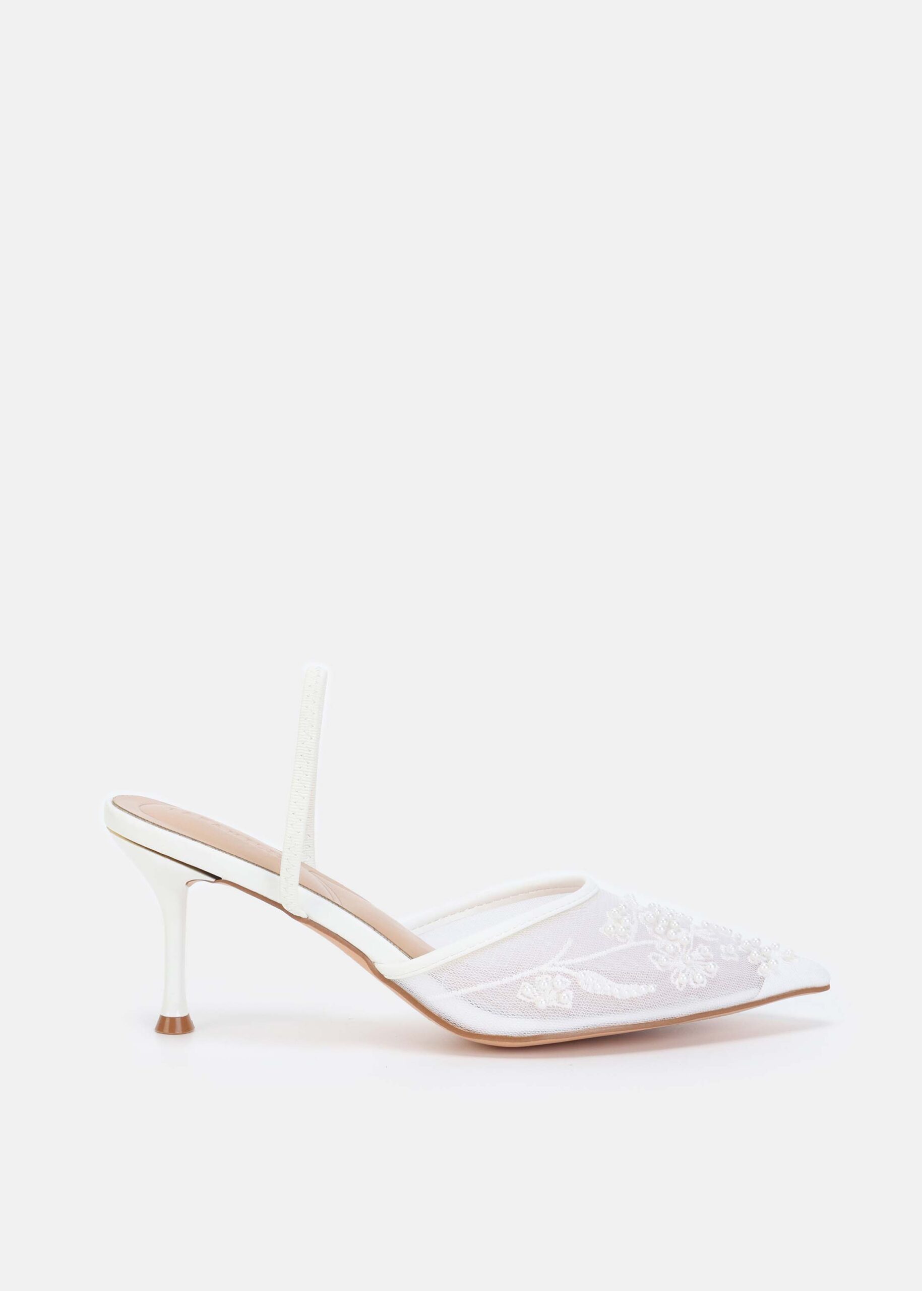 Women sandal, mesh fabric with embroidery and beads decor, point toe, elastic ankle strap, heels, unique and modern