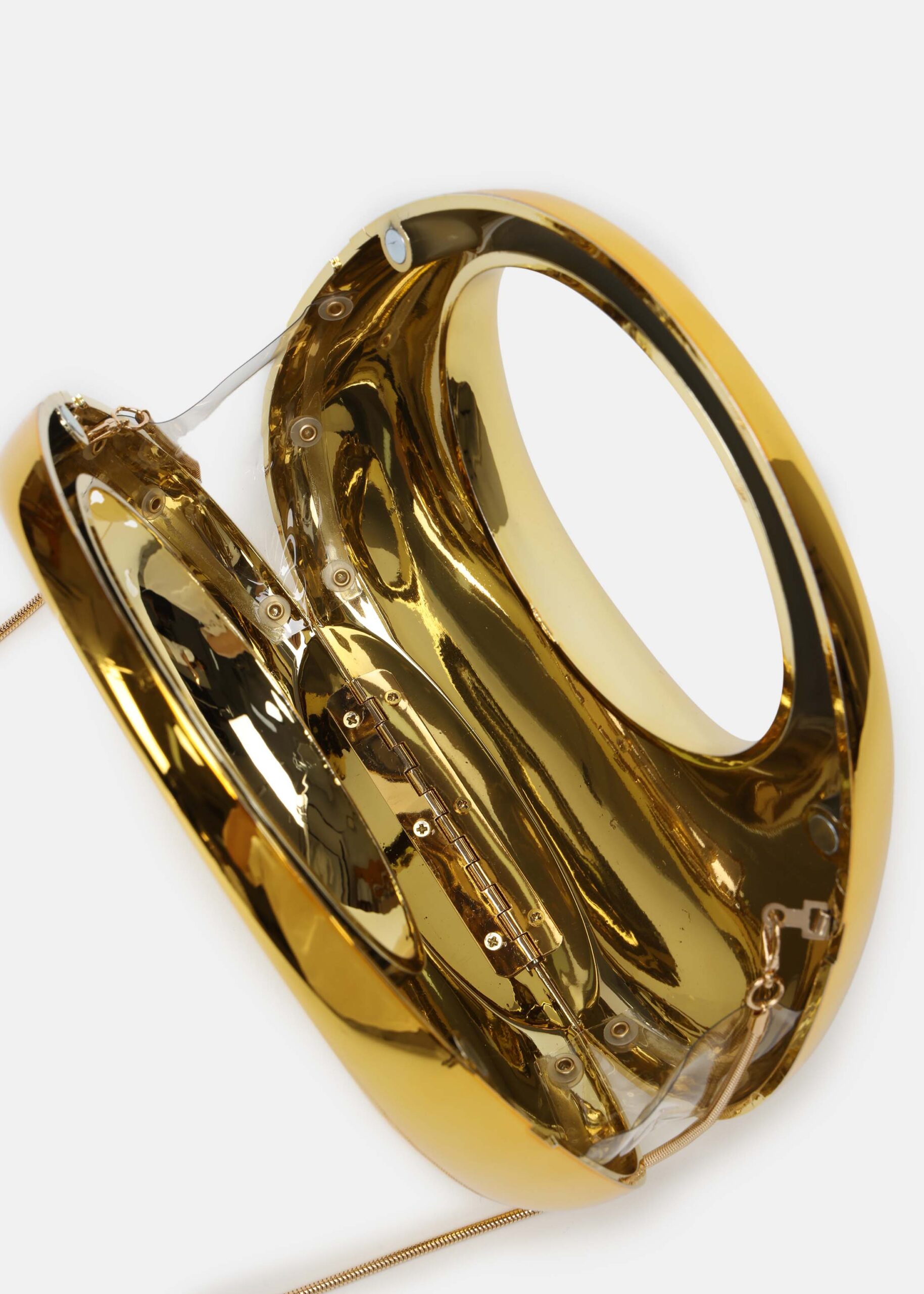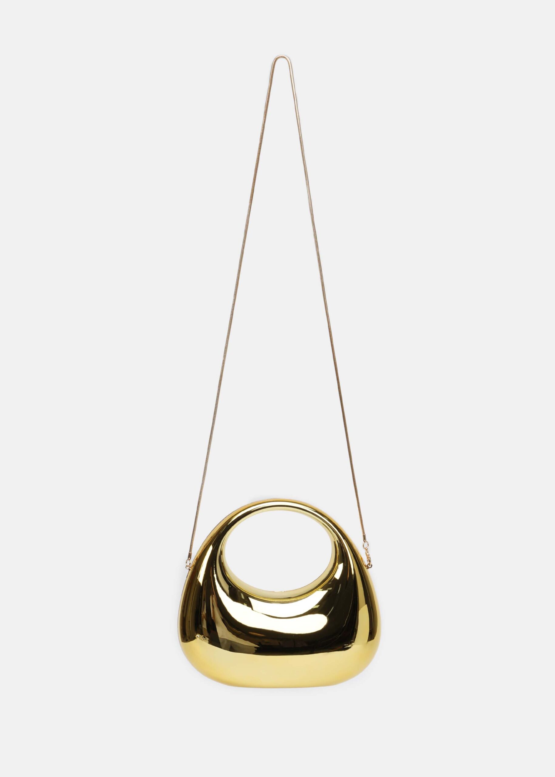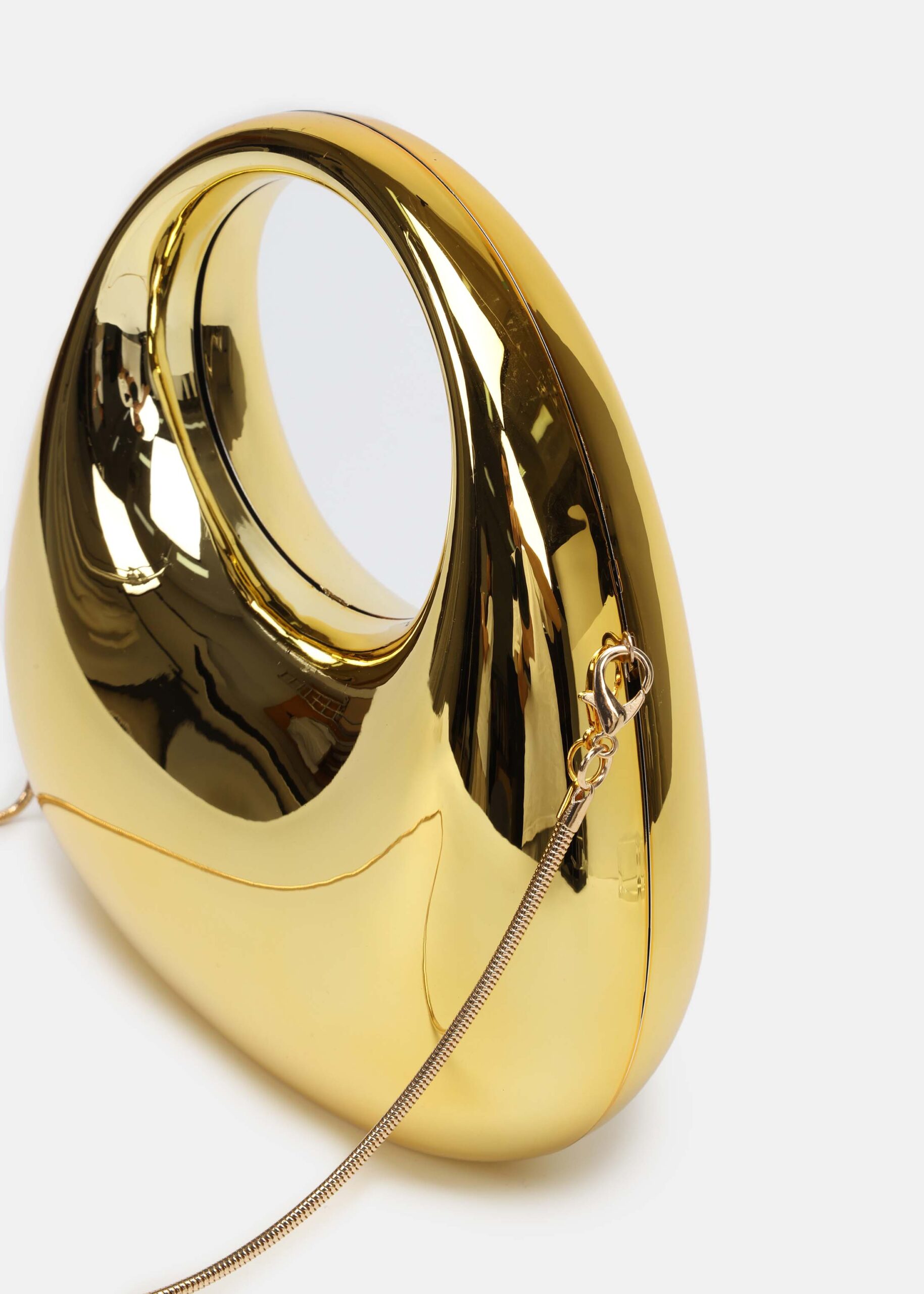 Women bag, shiny metallic, rounded shape, circular cutout at the top, shoulder chain, unique and modern