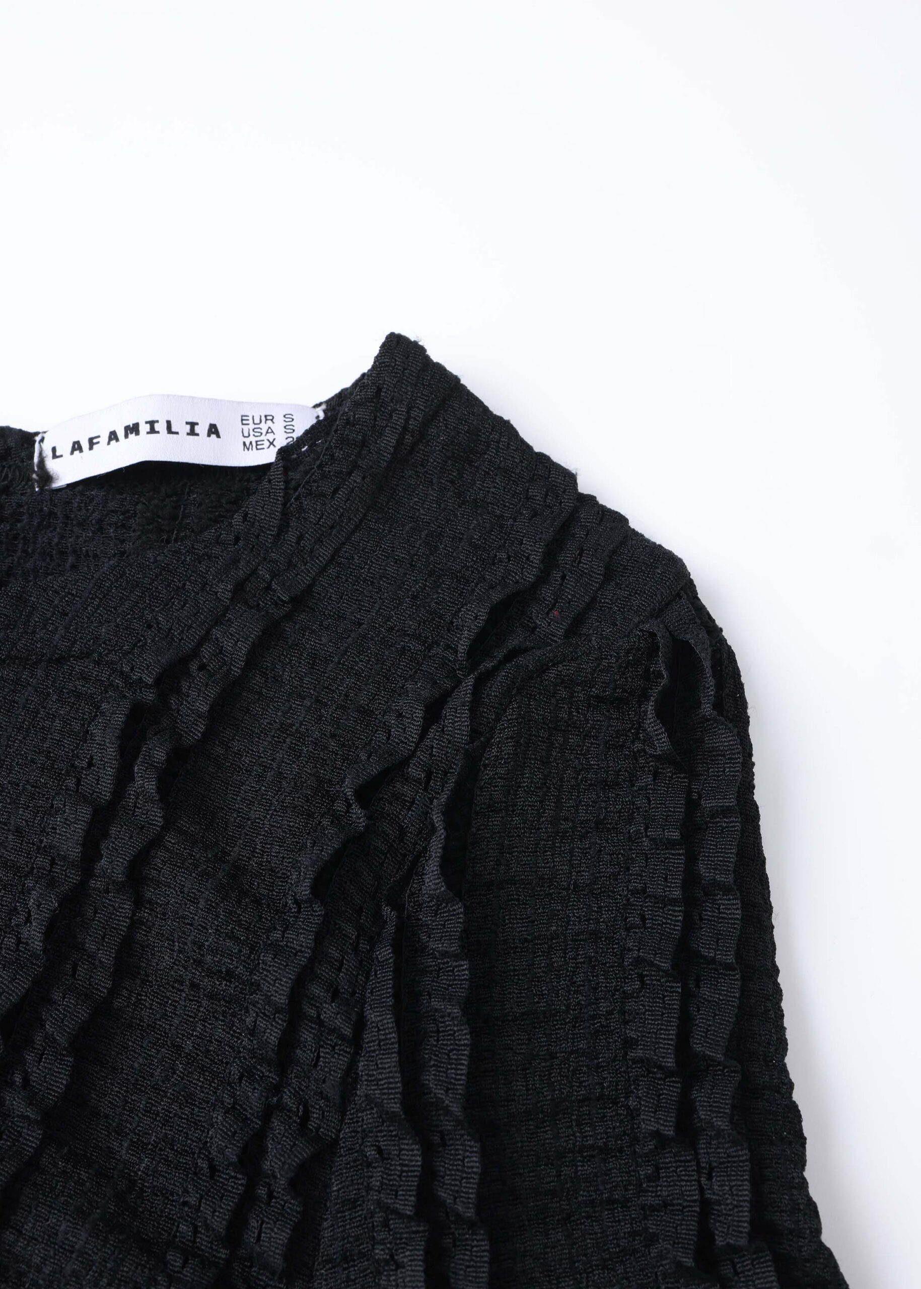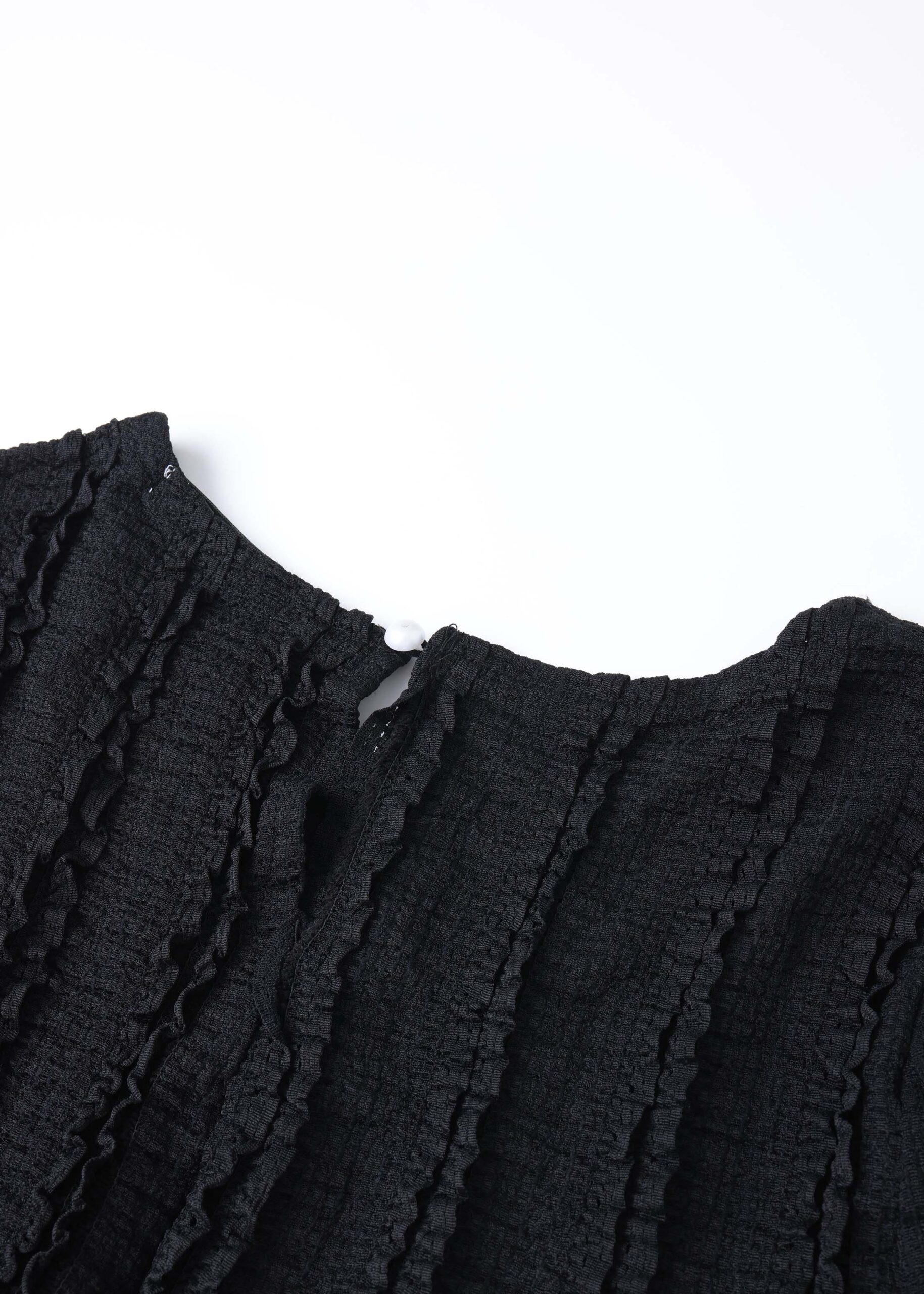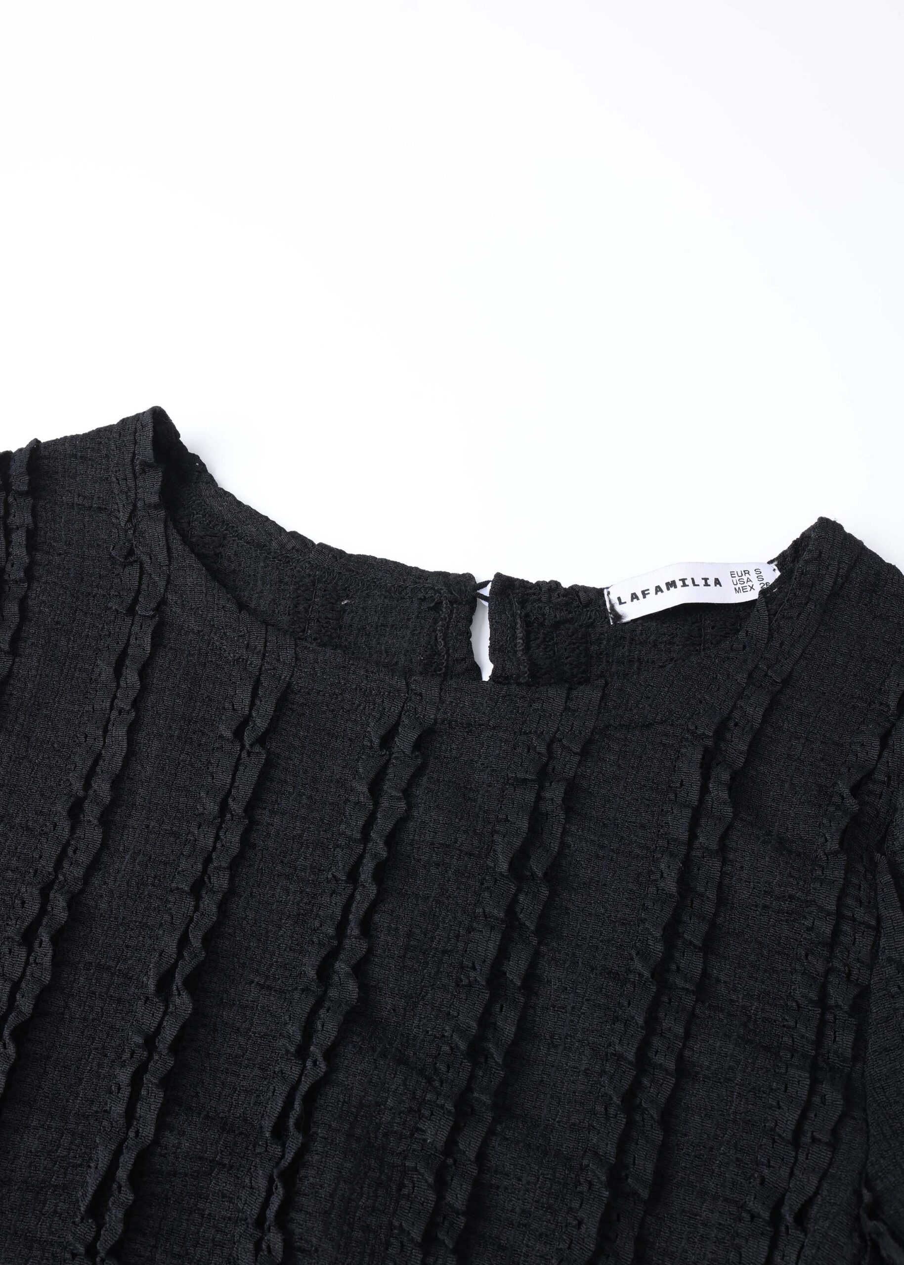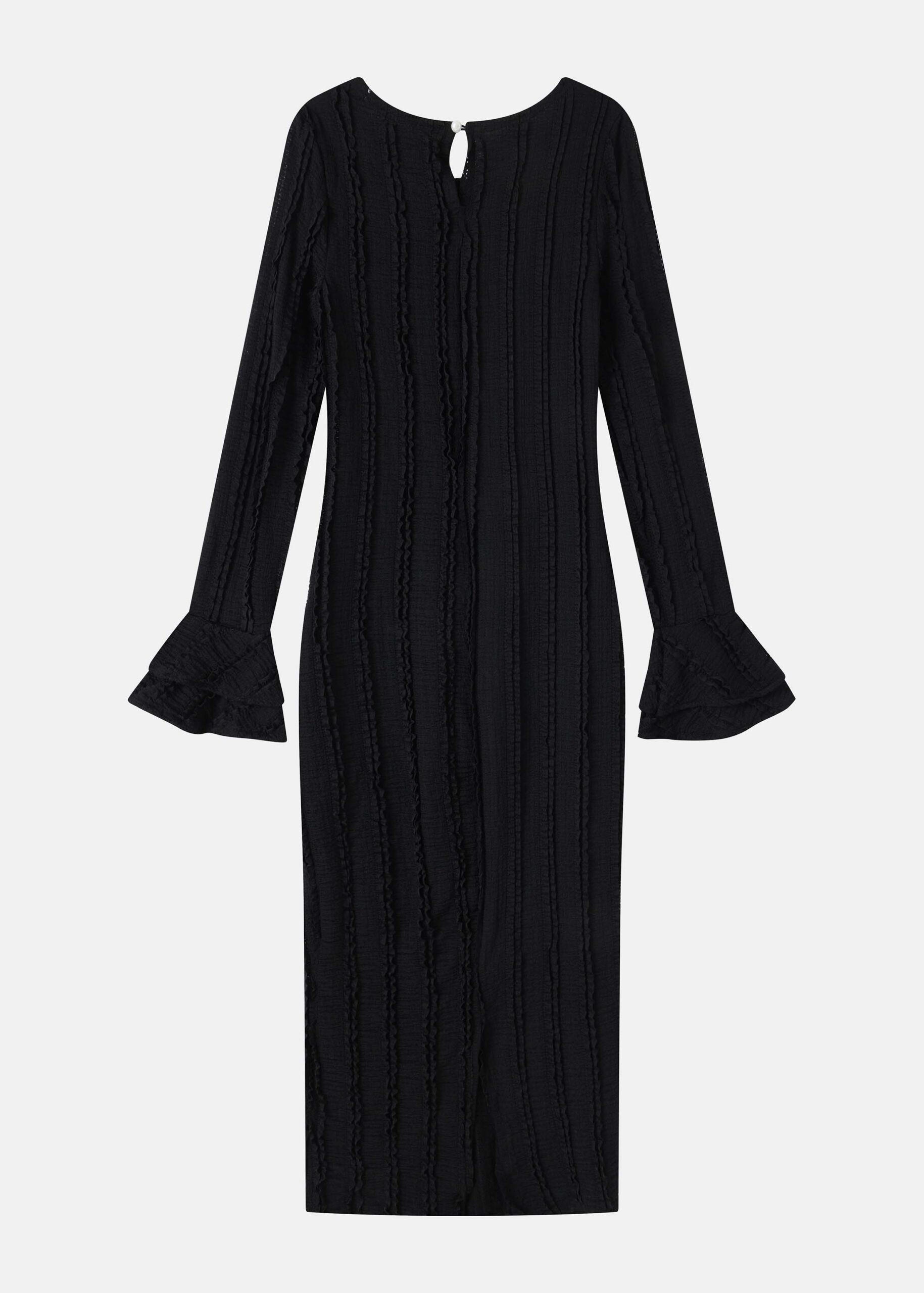 Women dress, midi, textured fabric with ruffled detailing, crew neck with back button, long sleeves with flared cuffs, unique and suitable for many occasions