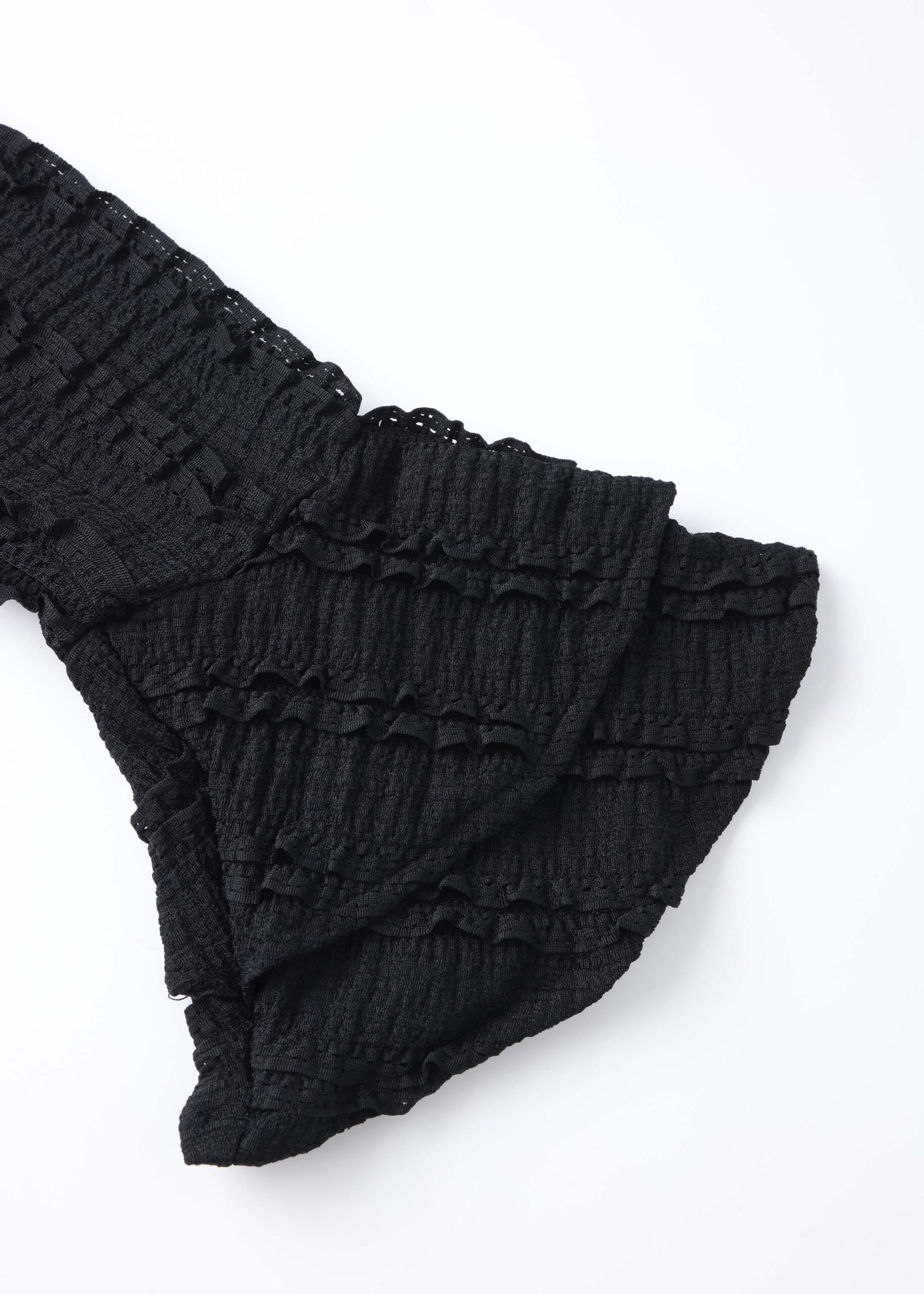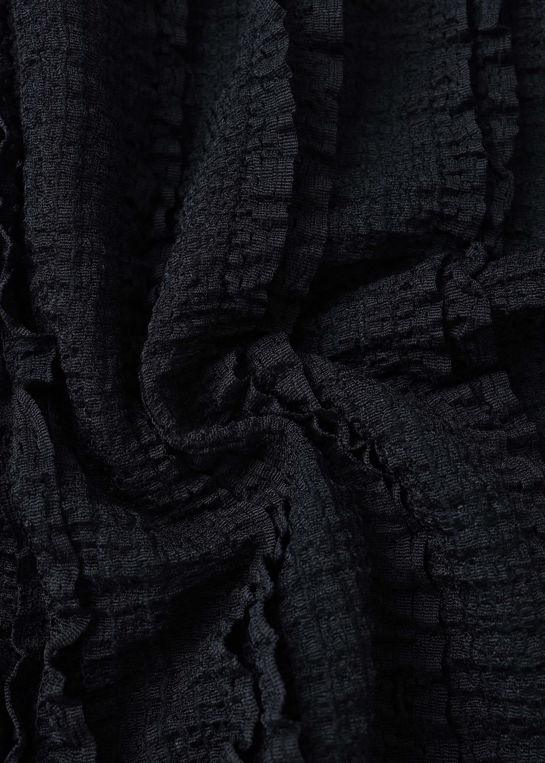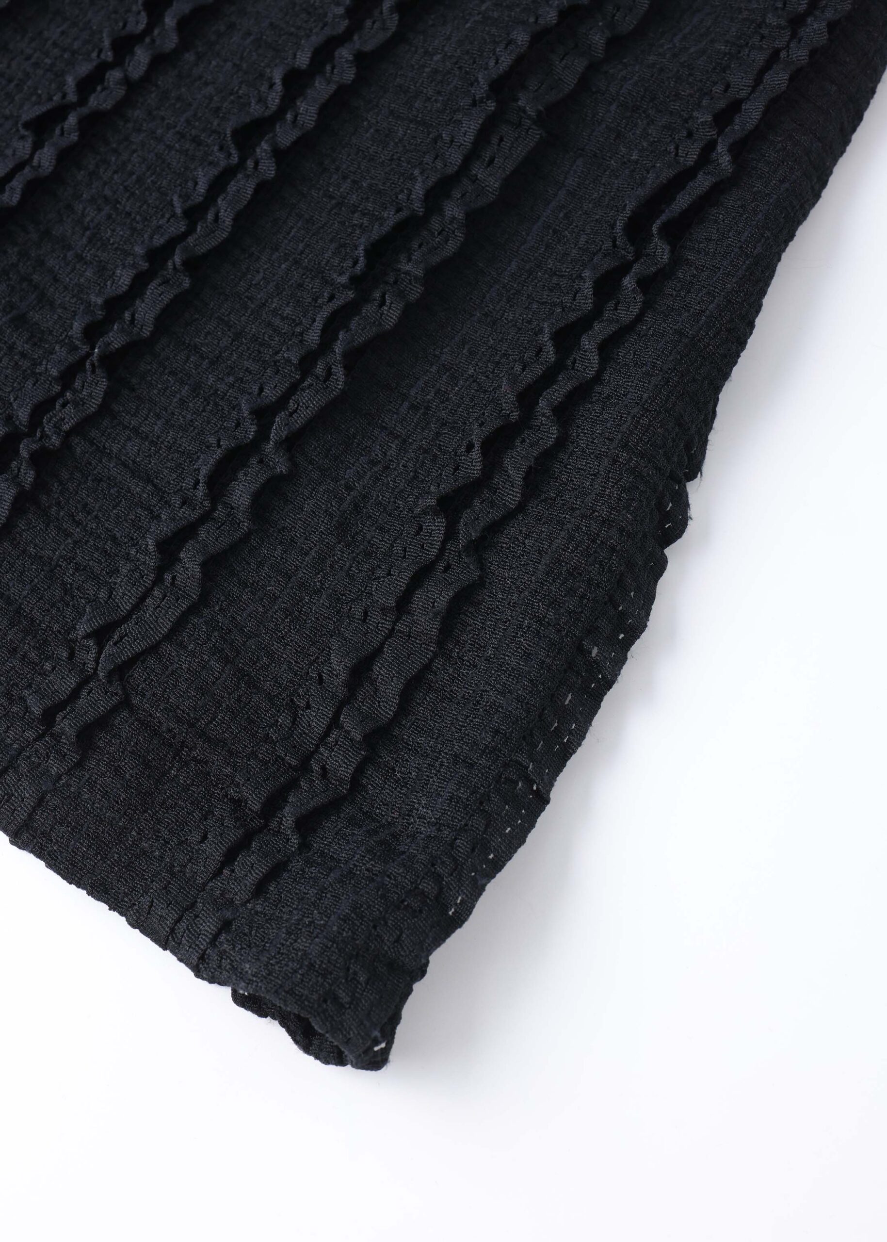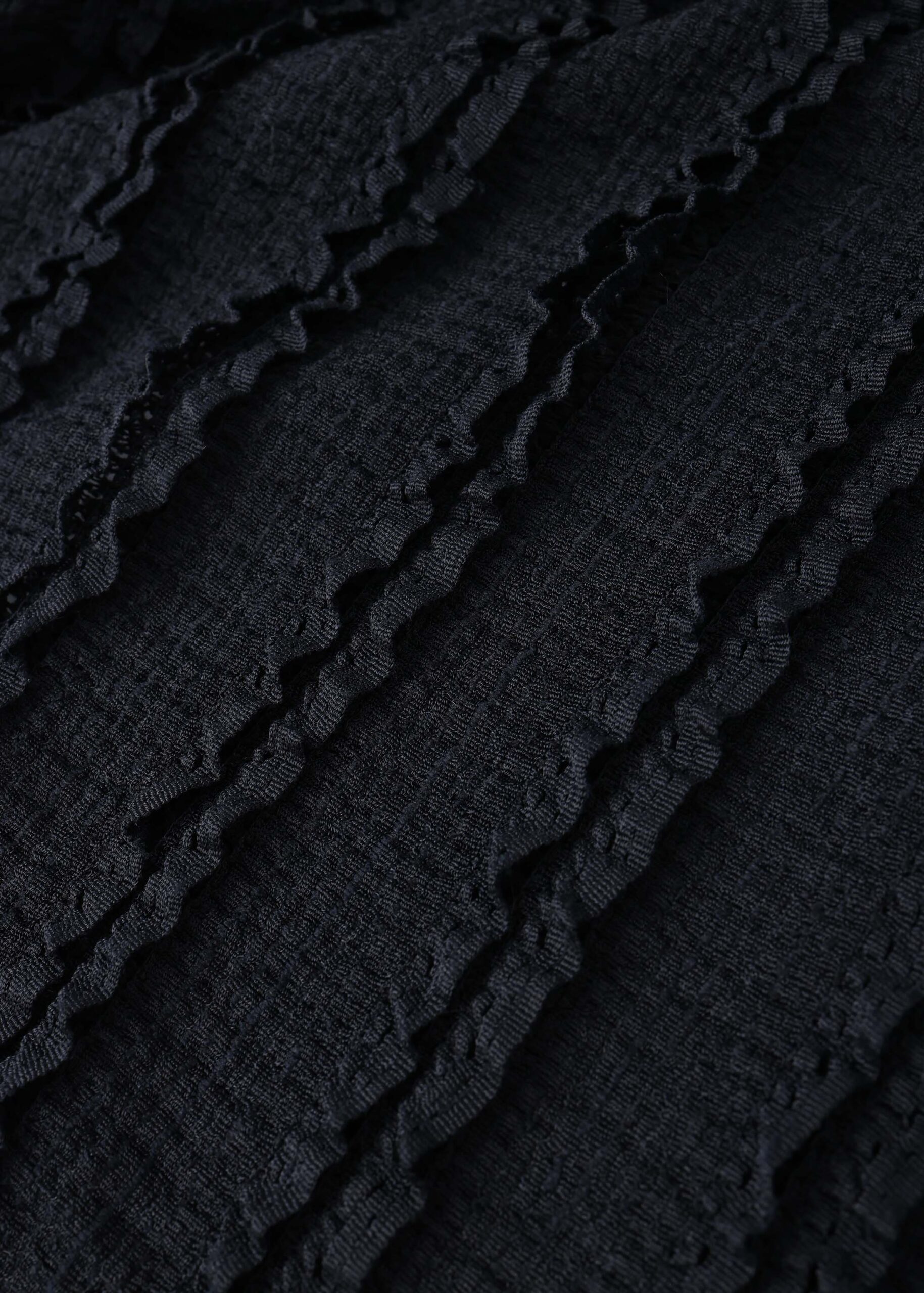 Women dress, midi, textured fabric with ruffled detailing, crew neck with back button, long sleeves with flared cuffs, unique and suitable for many occasions