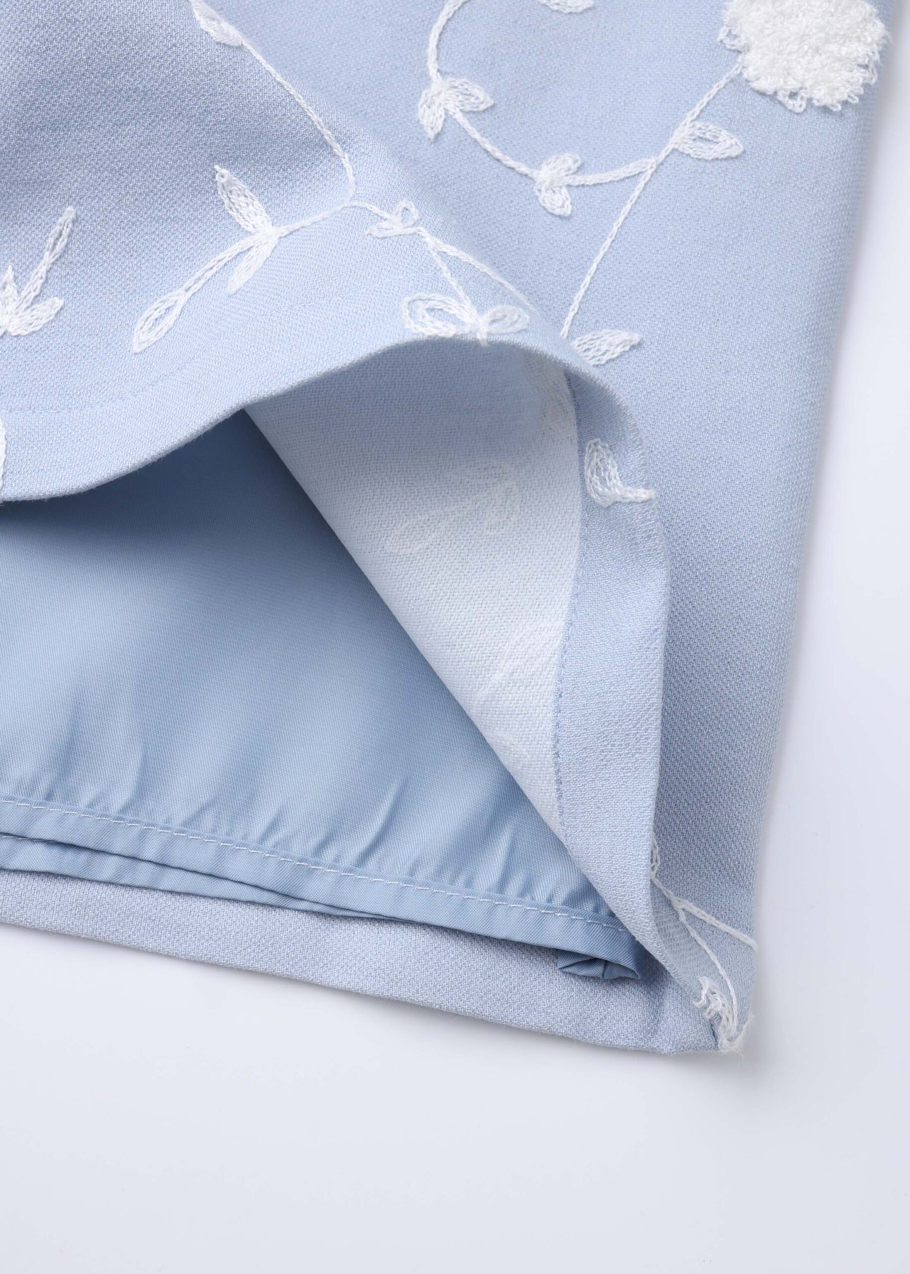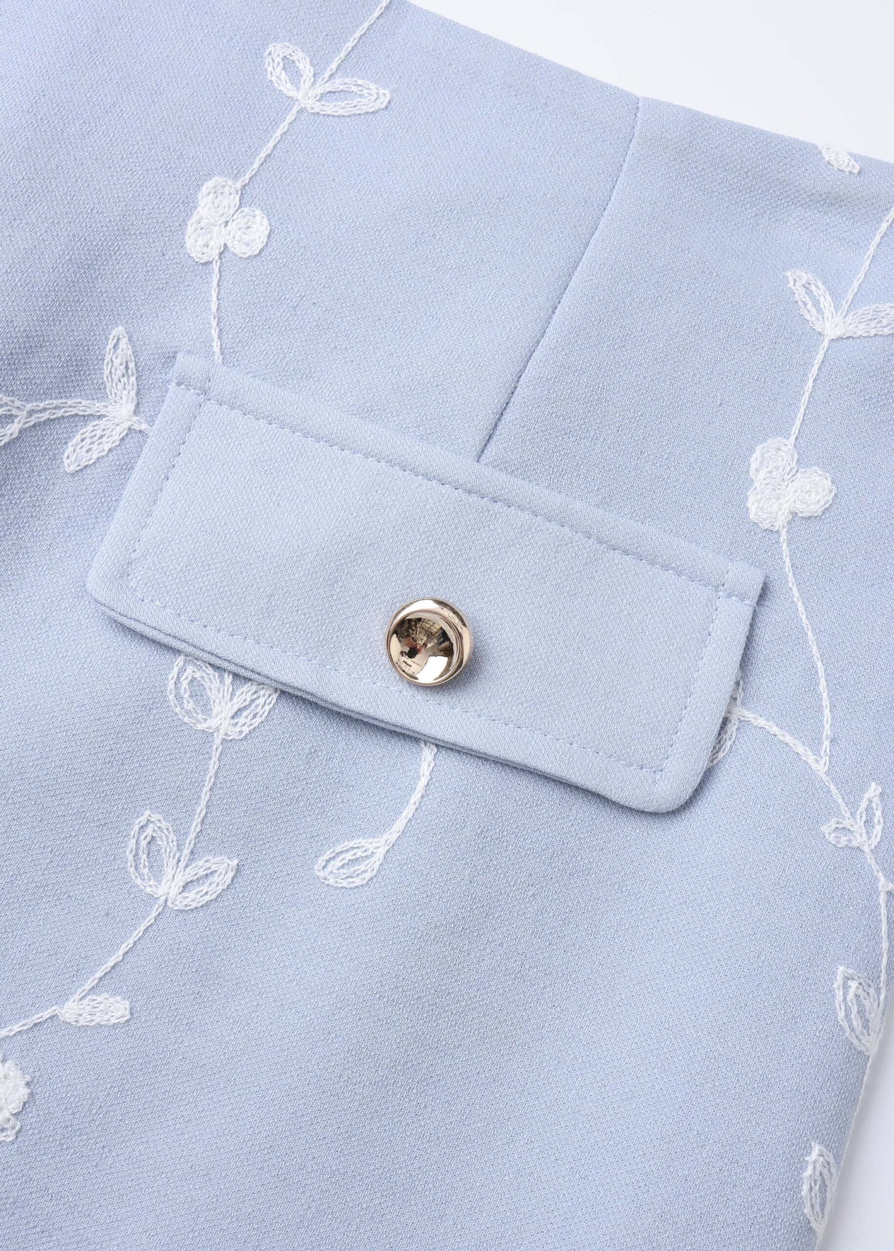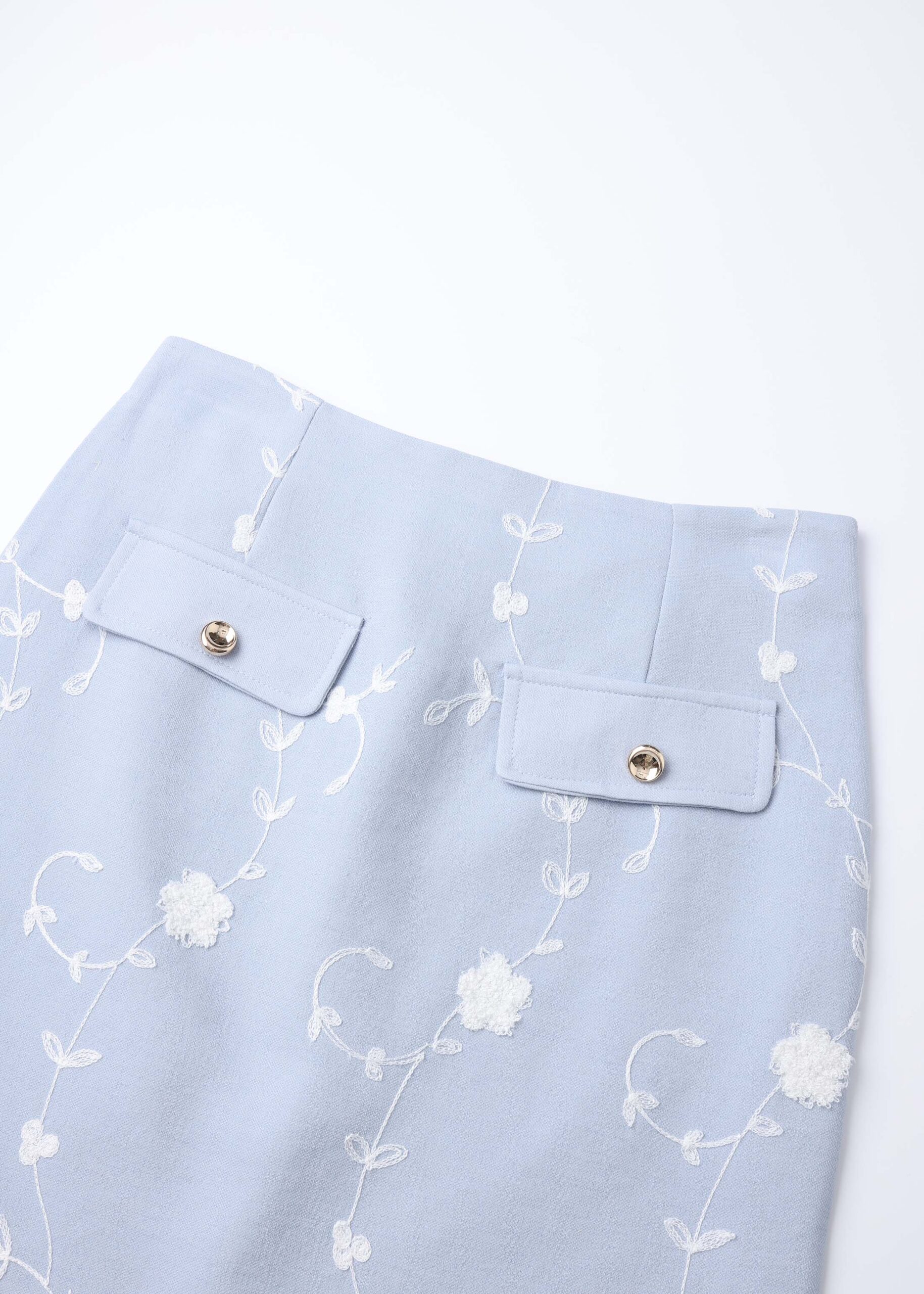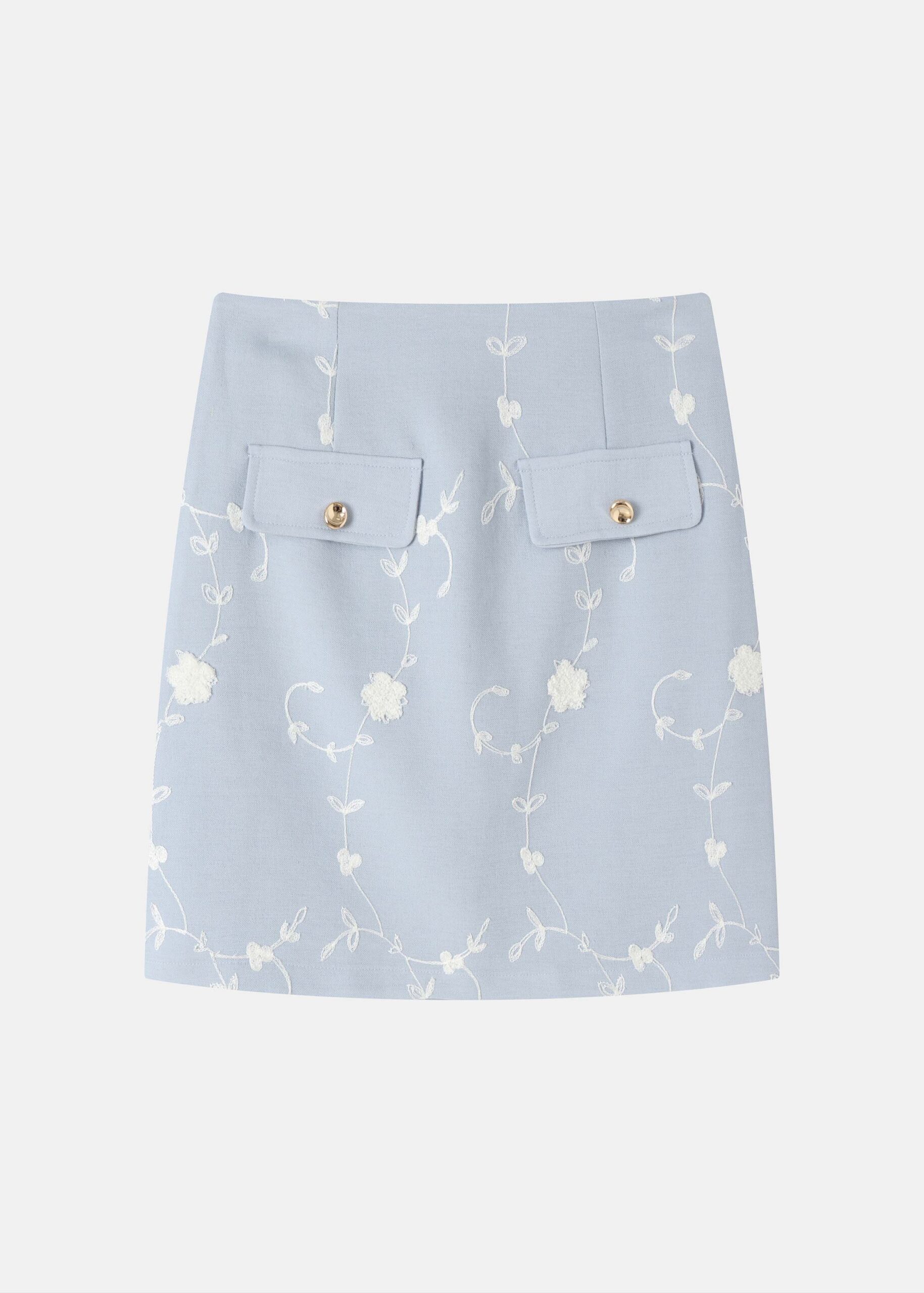 Women skirt, mini, flowers embroidery decor, front fake flap pockets, back zipper closure, unique and modern