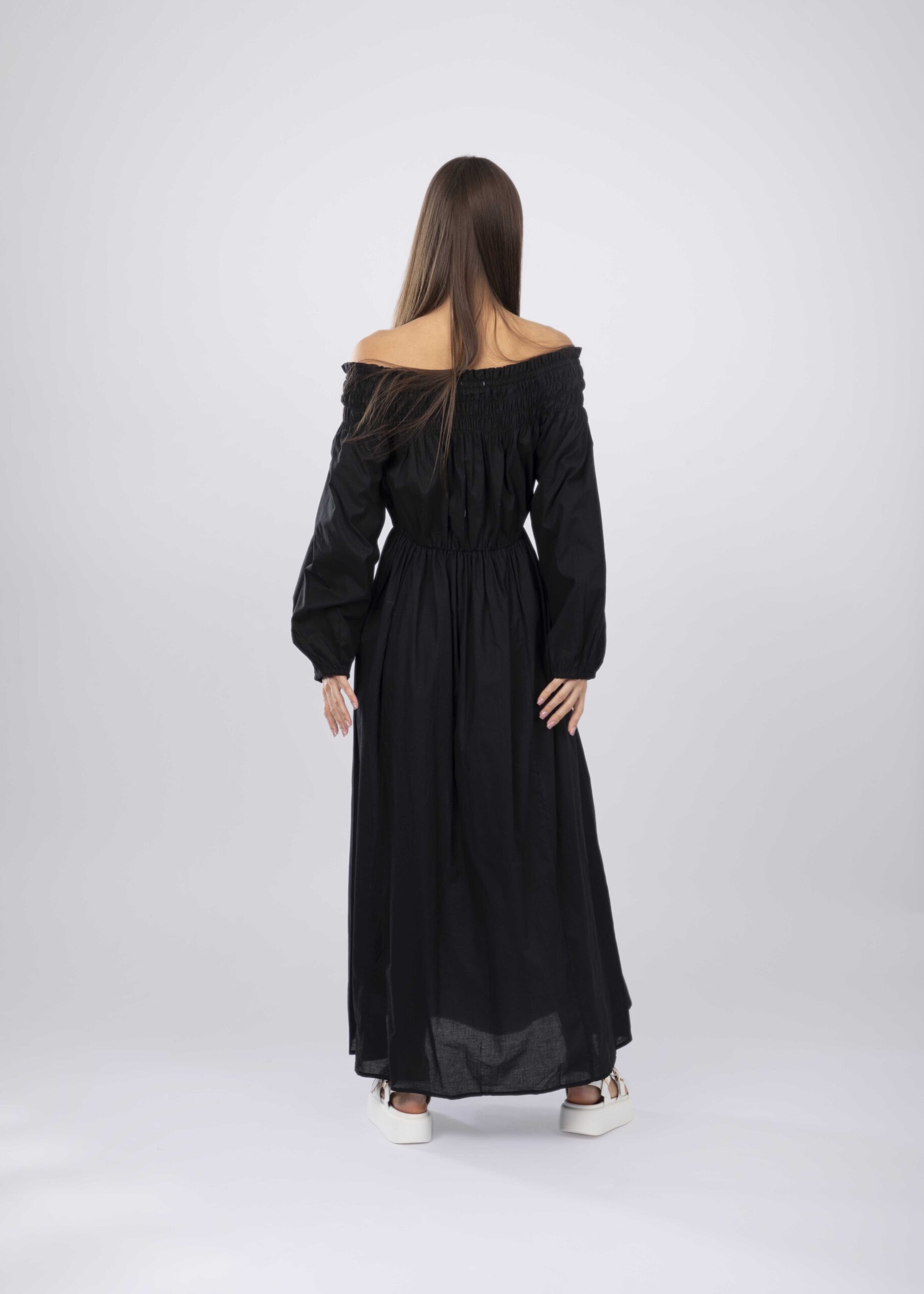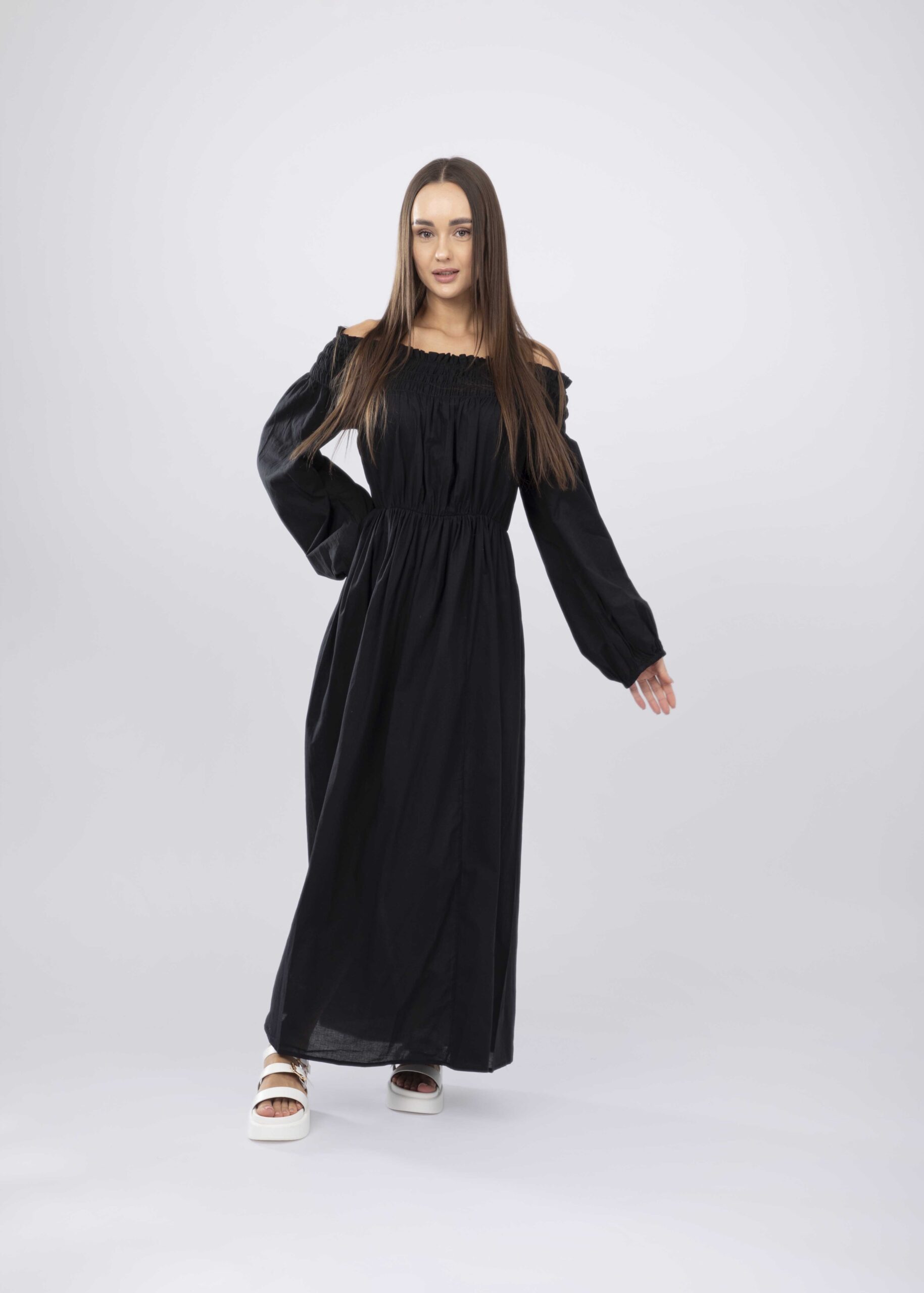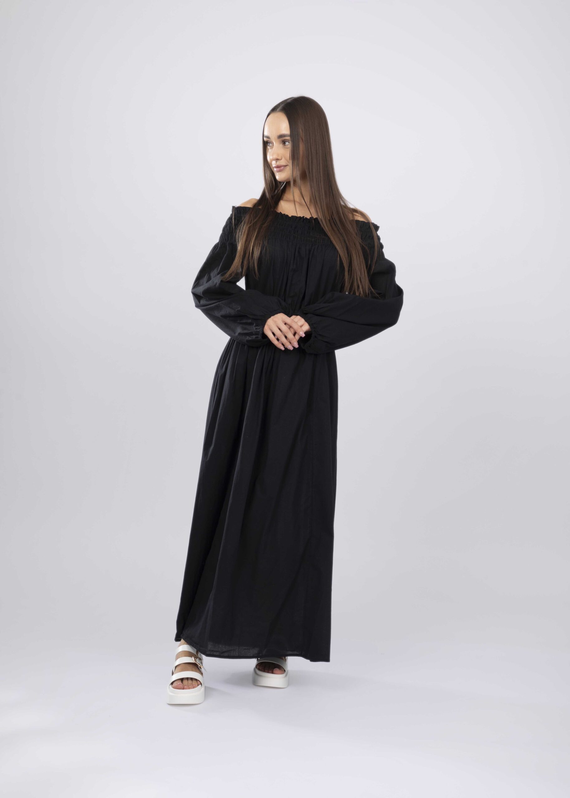 Women dress, long, plain, off-shoulders, long sleeves with tight cuff, elastic waist, unique and modern