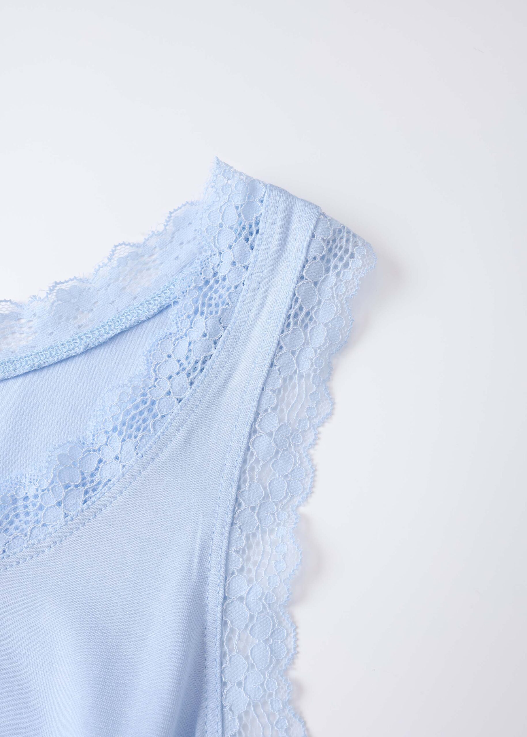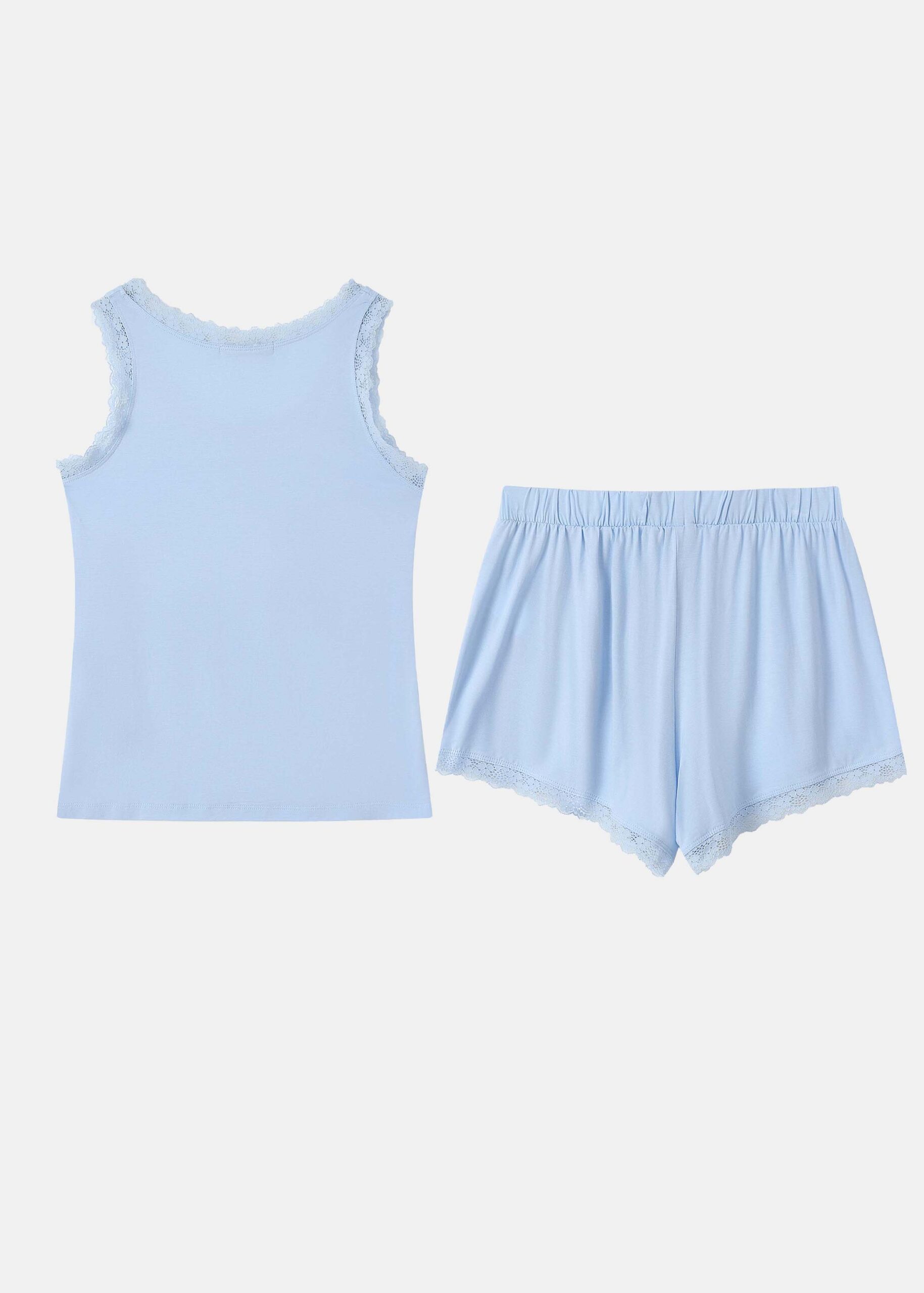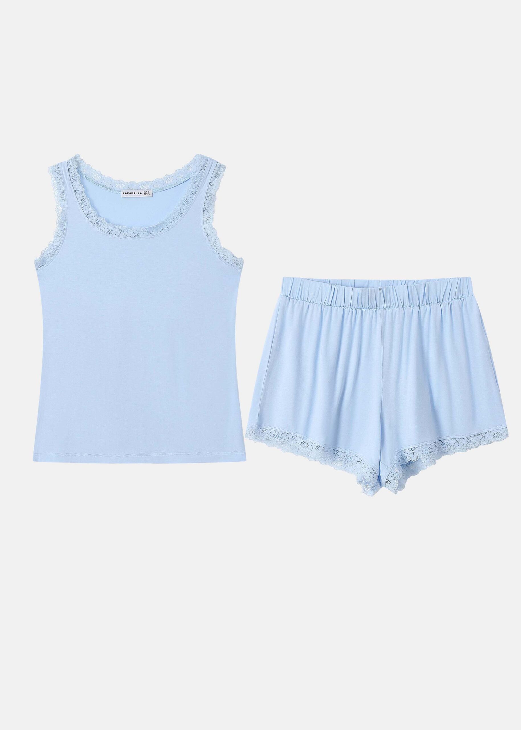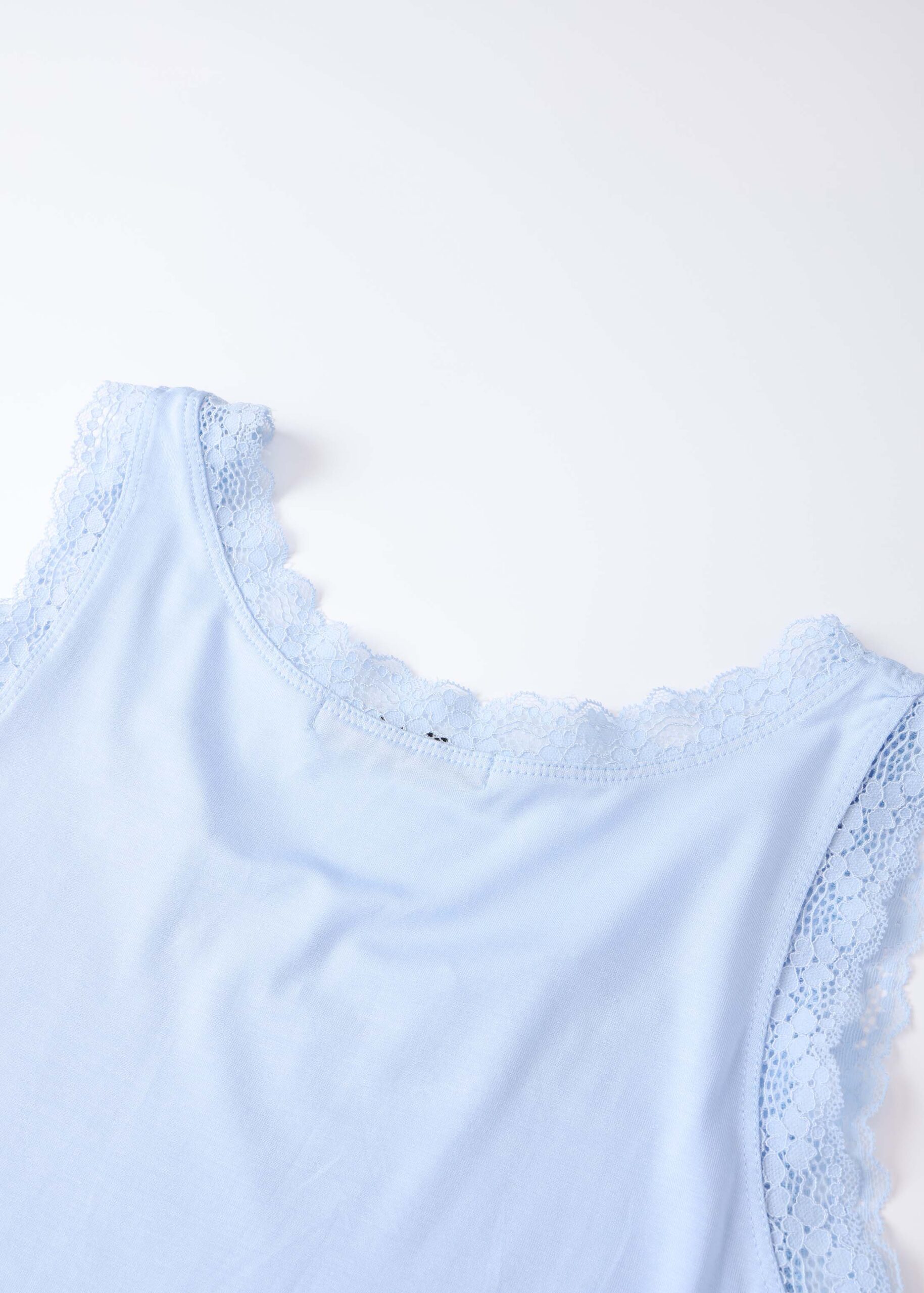 Women pajama, two-pieces, top, sleeveless, round neck, lace-trim detail, short, elastic waist, comfortable and practical