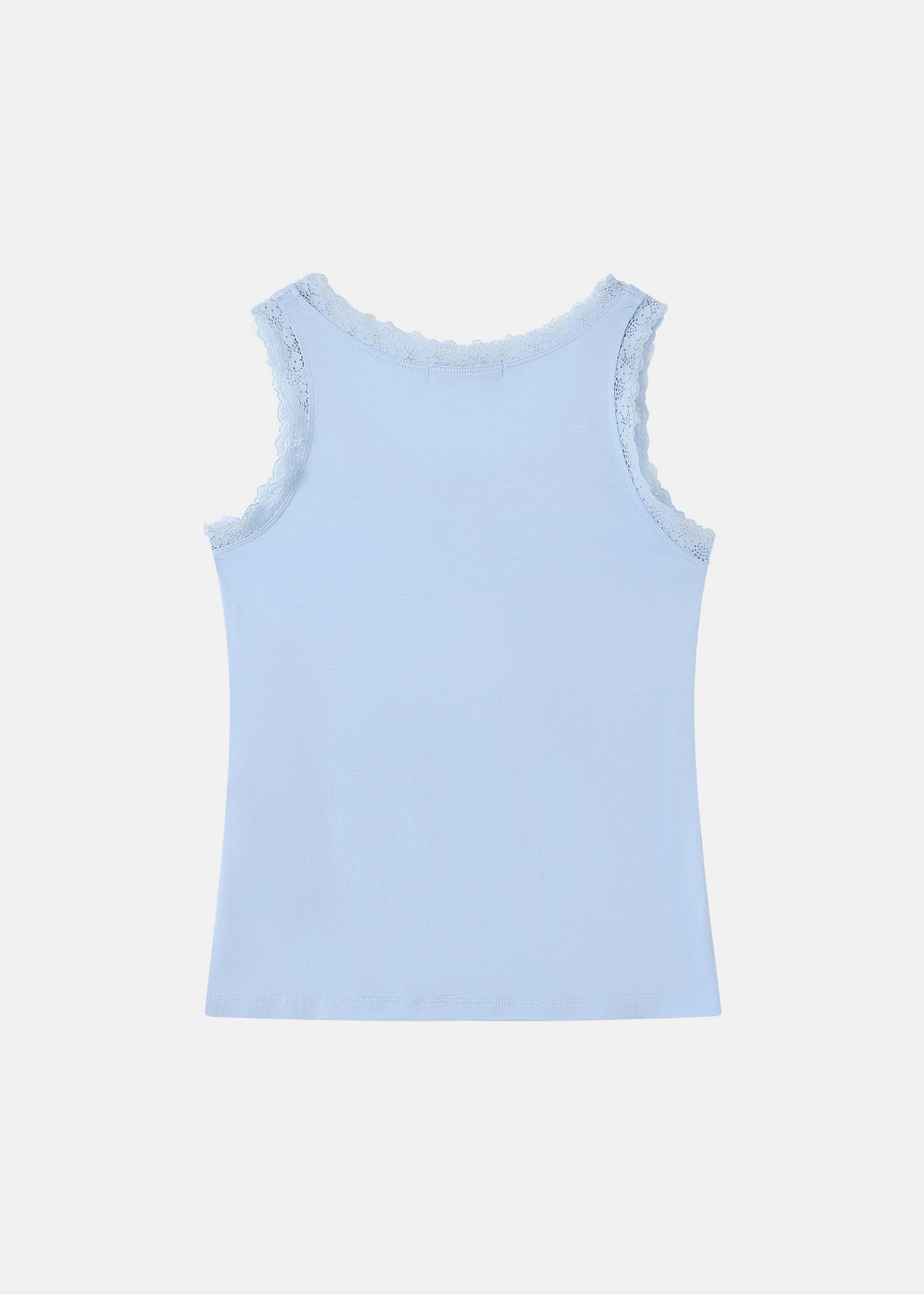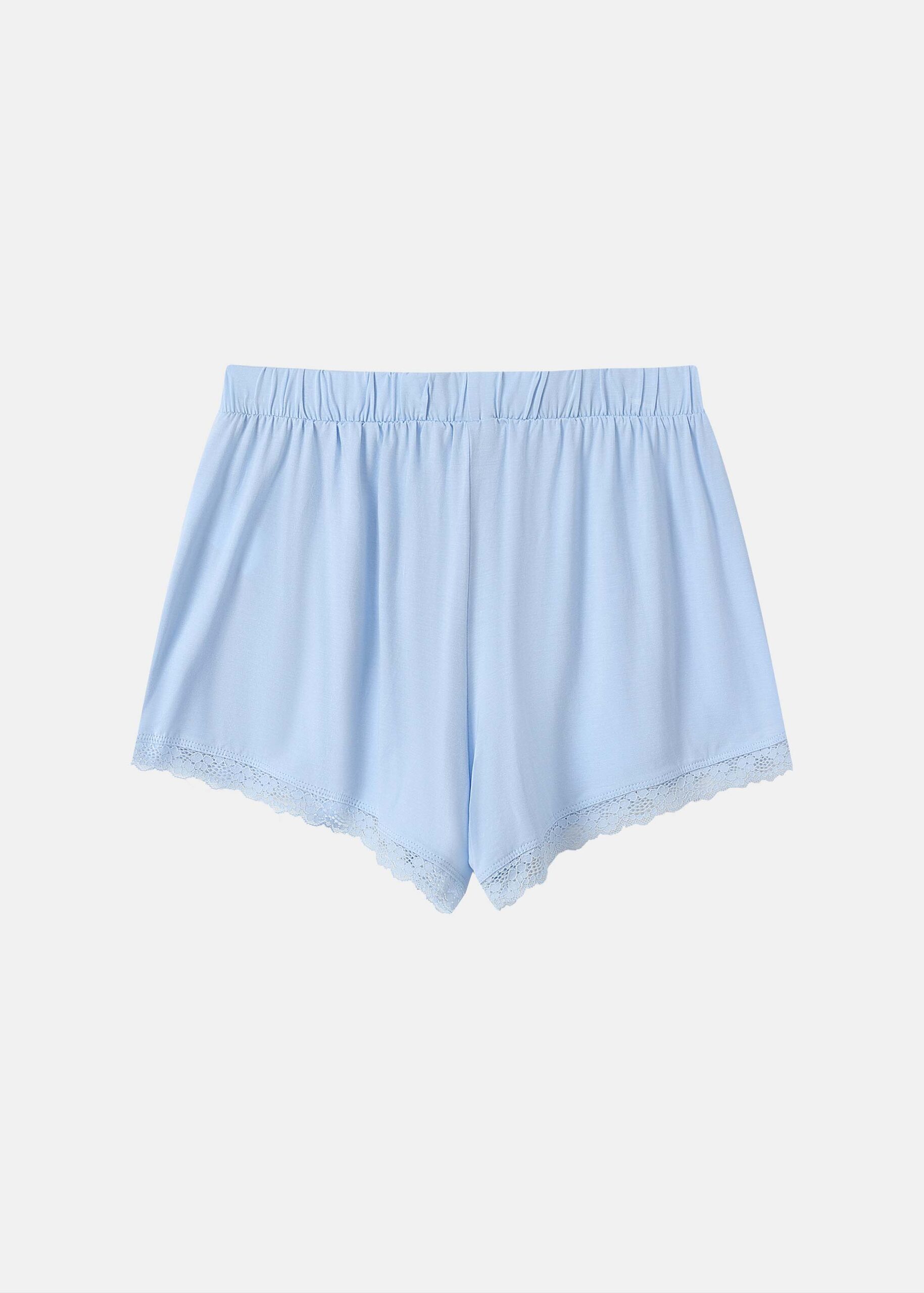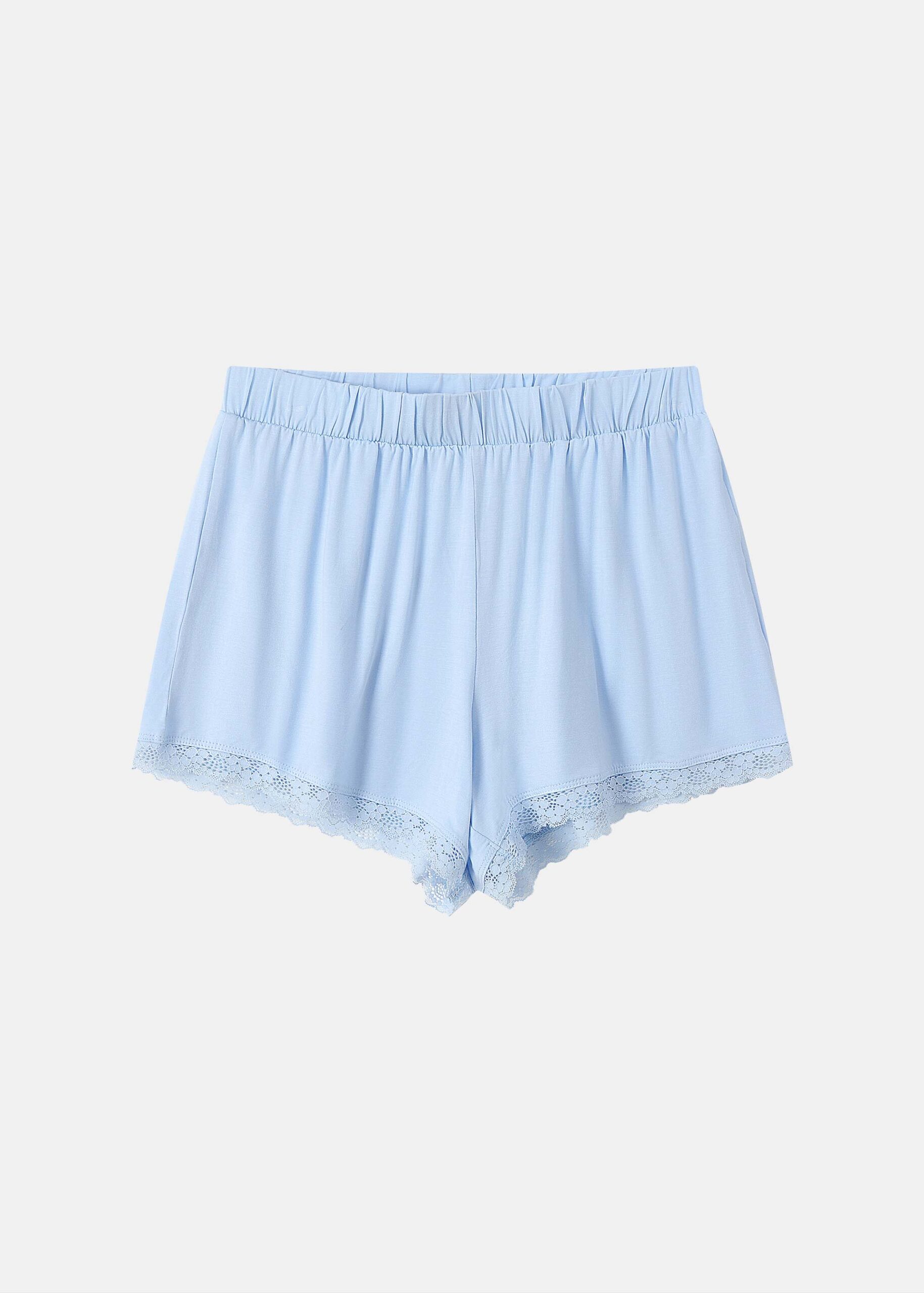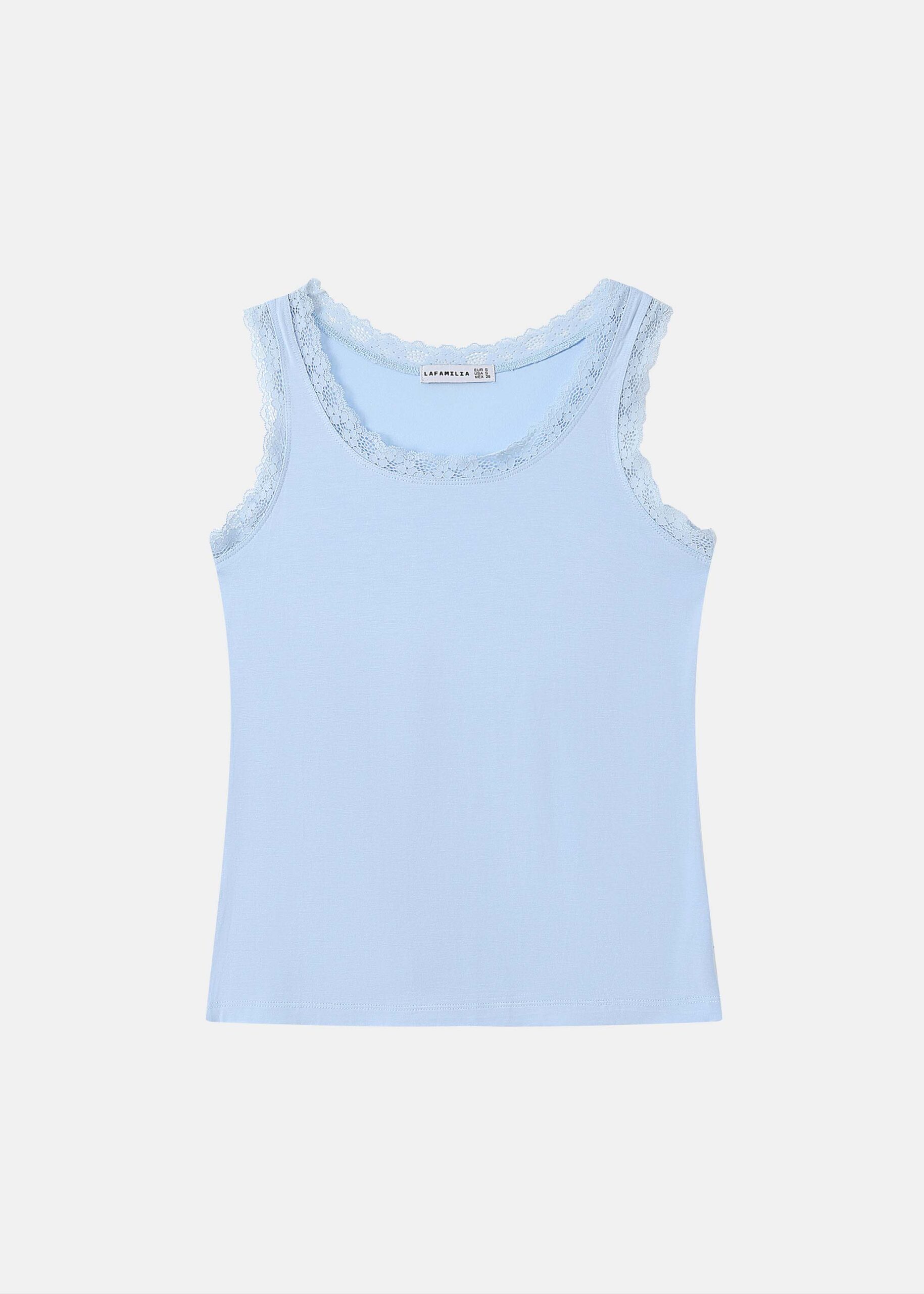 Women pajama, two-pieces, top, sleeveless, round neck, lace-trim detail, short, elastic waist, comfortable and practical