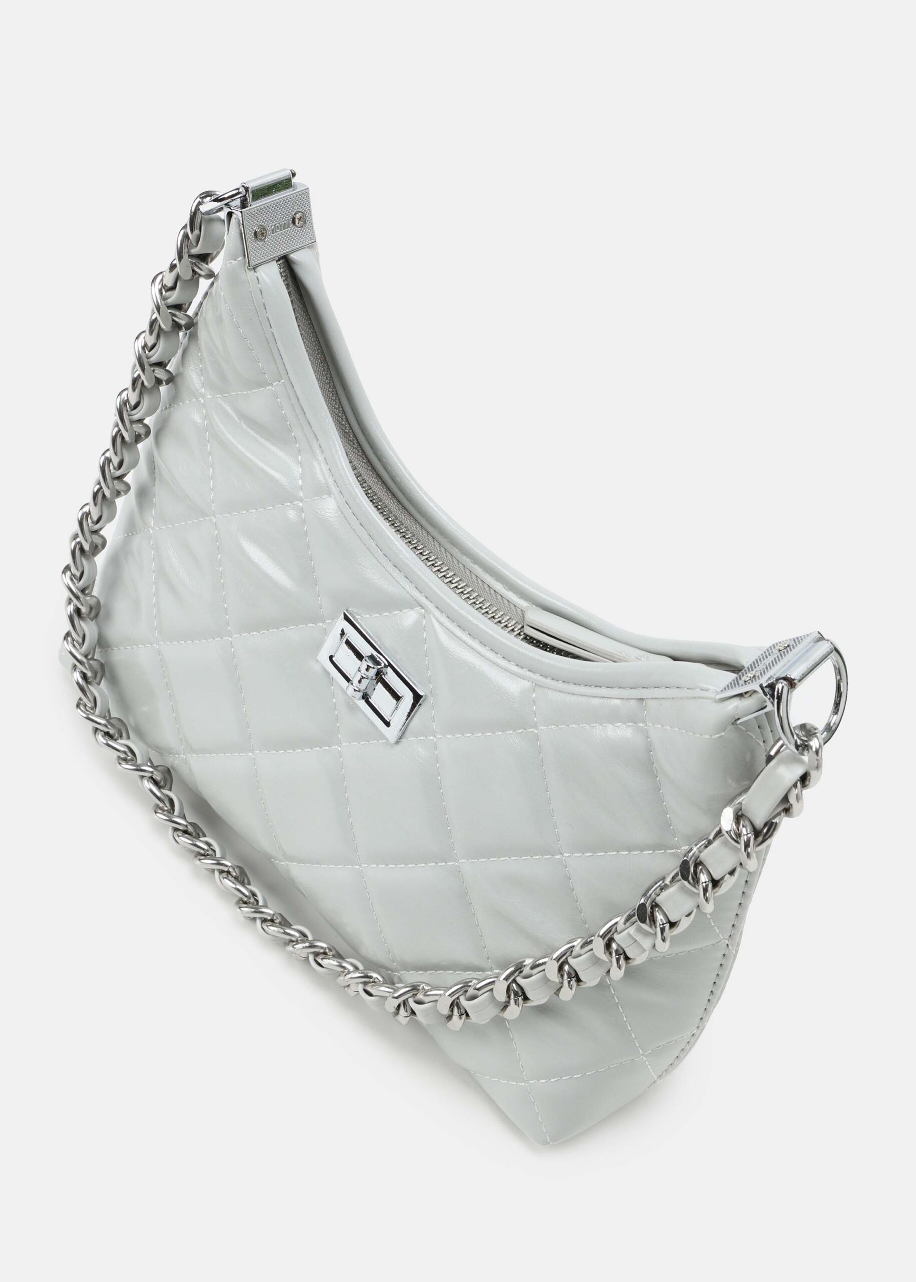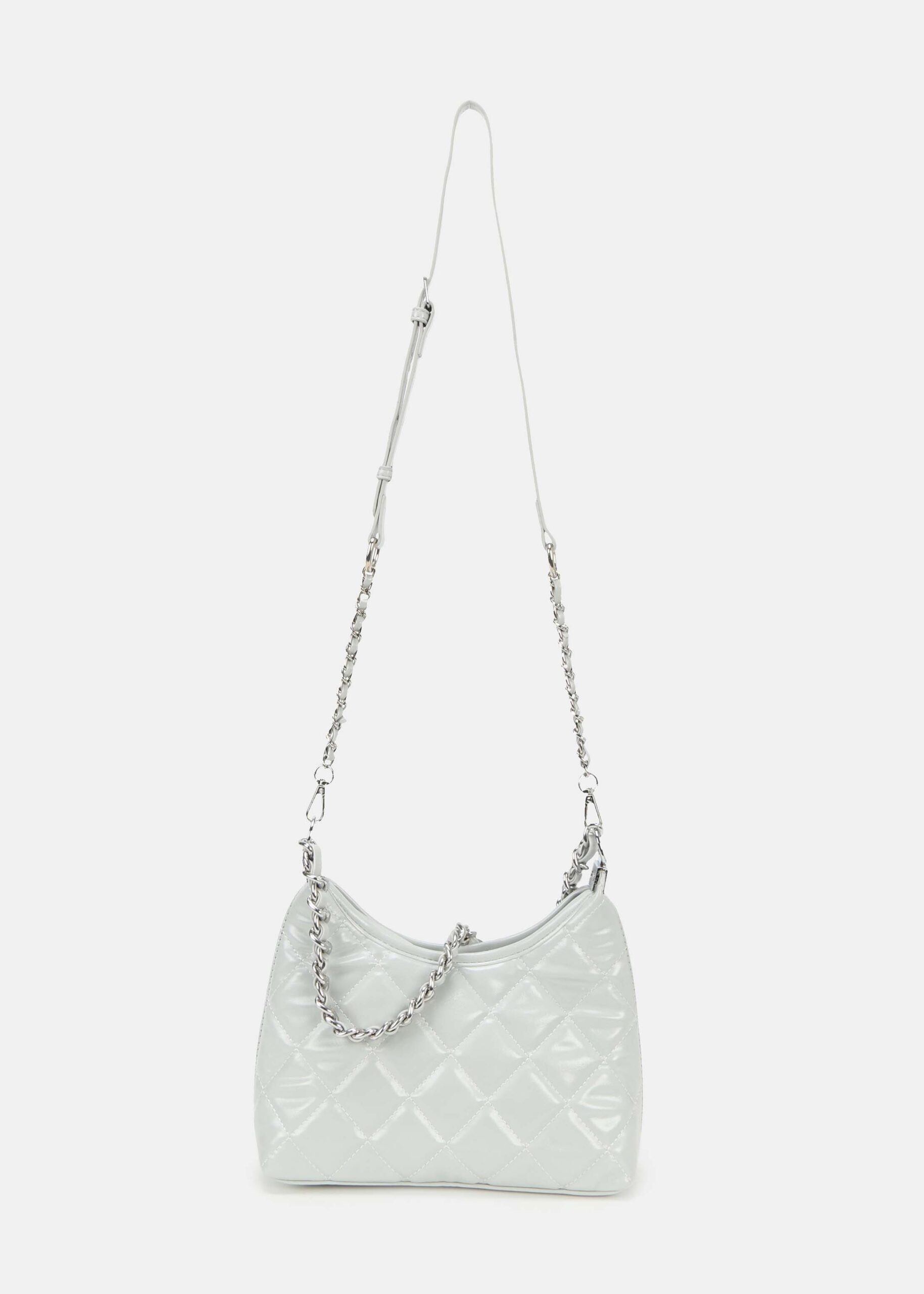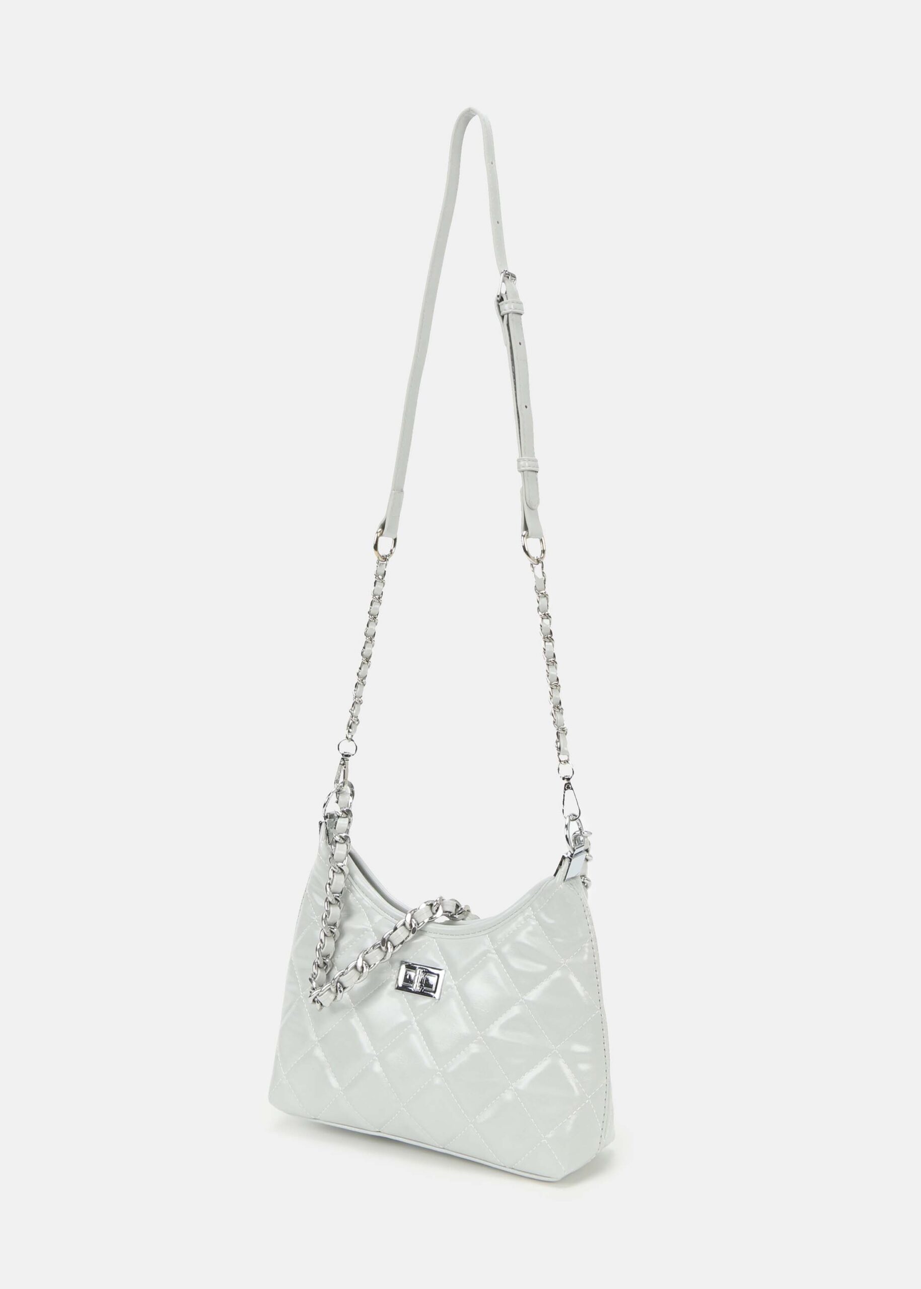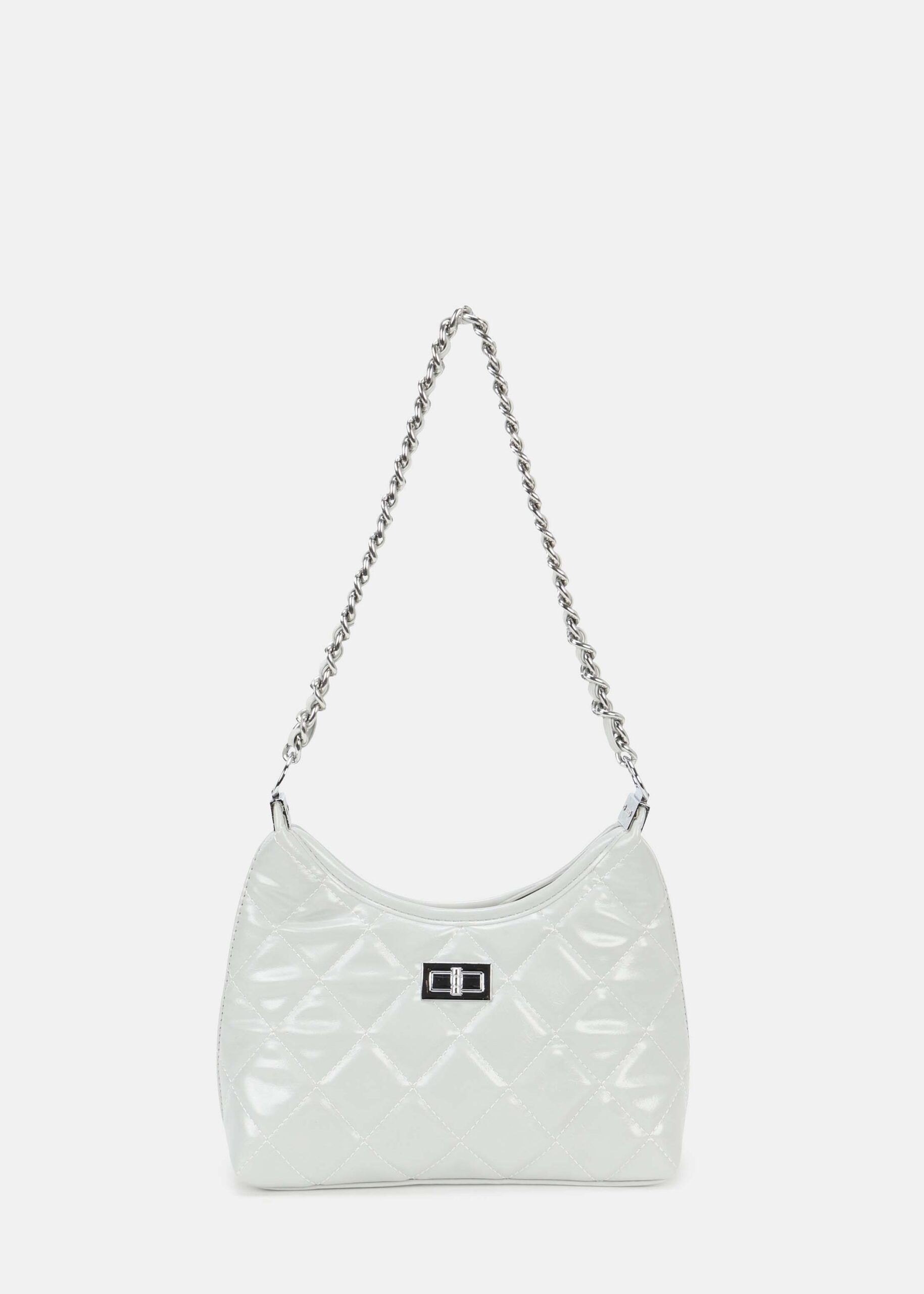 Women bag, patent-leather, quilted, front metal buckle decor, upper zip closure, chain hand strap, adjustable and detachable shoulder strap, unique and modern