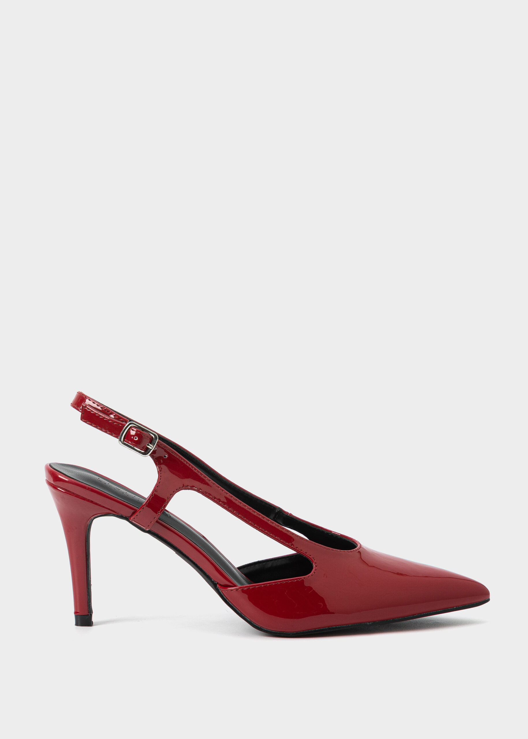 Women sandal, patent leather, point toe, heels, ankle strap with side metal buckle to close, unique and modern