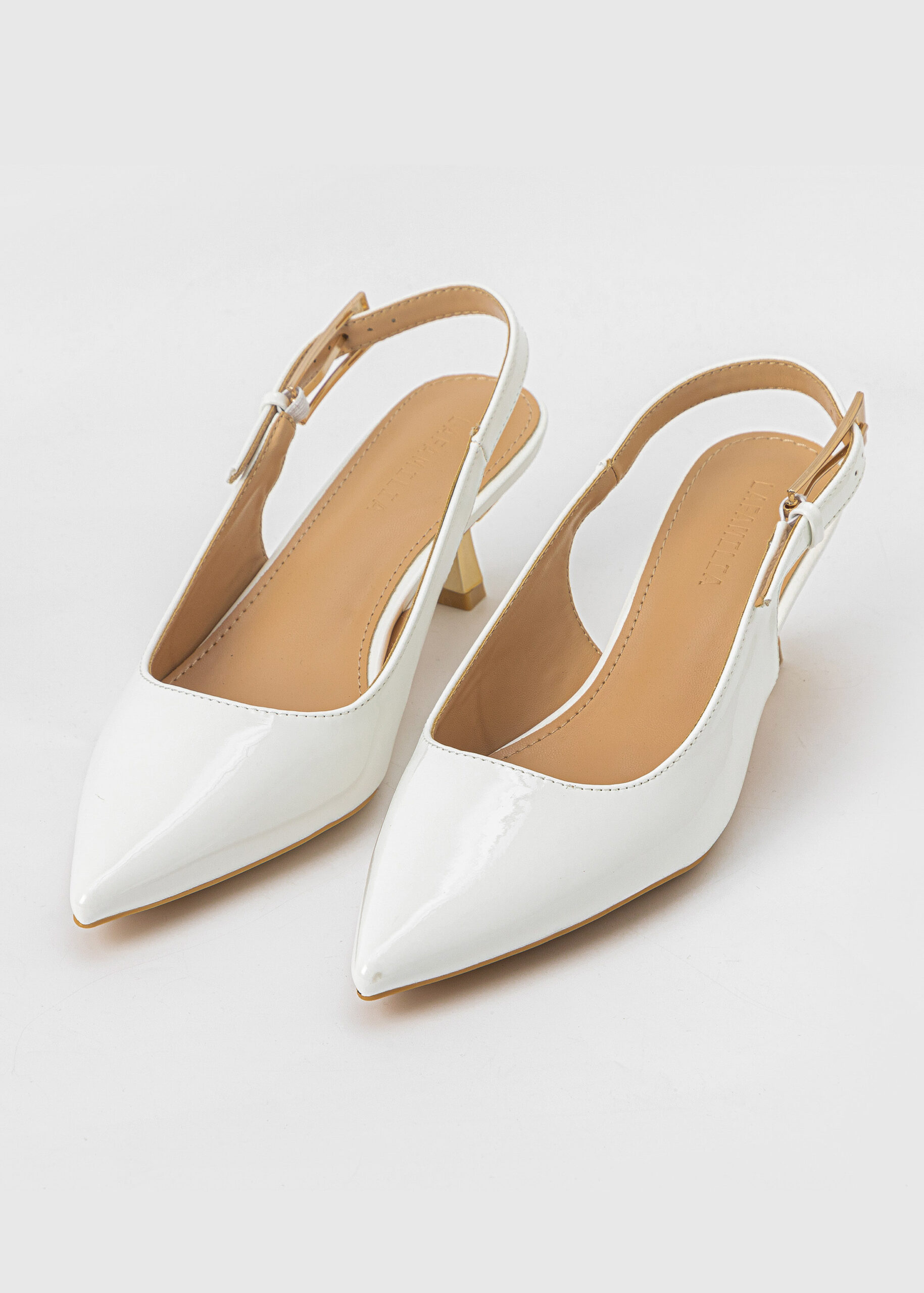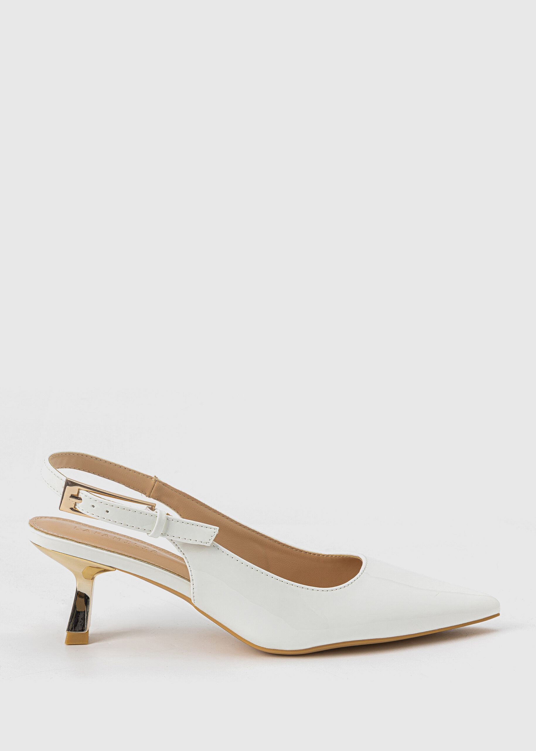 Women sandal, patent leather, heels, point toe, ankle strap with side metal buckle to close, unique and modern
