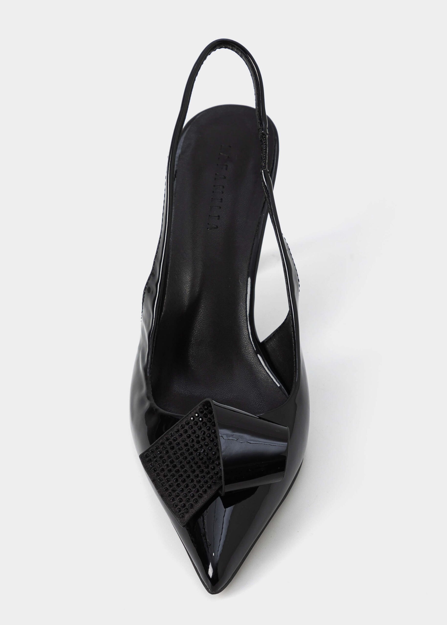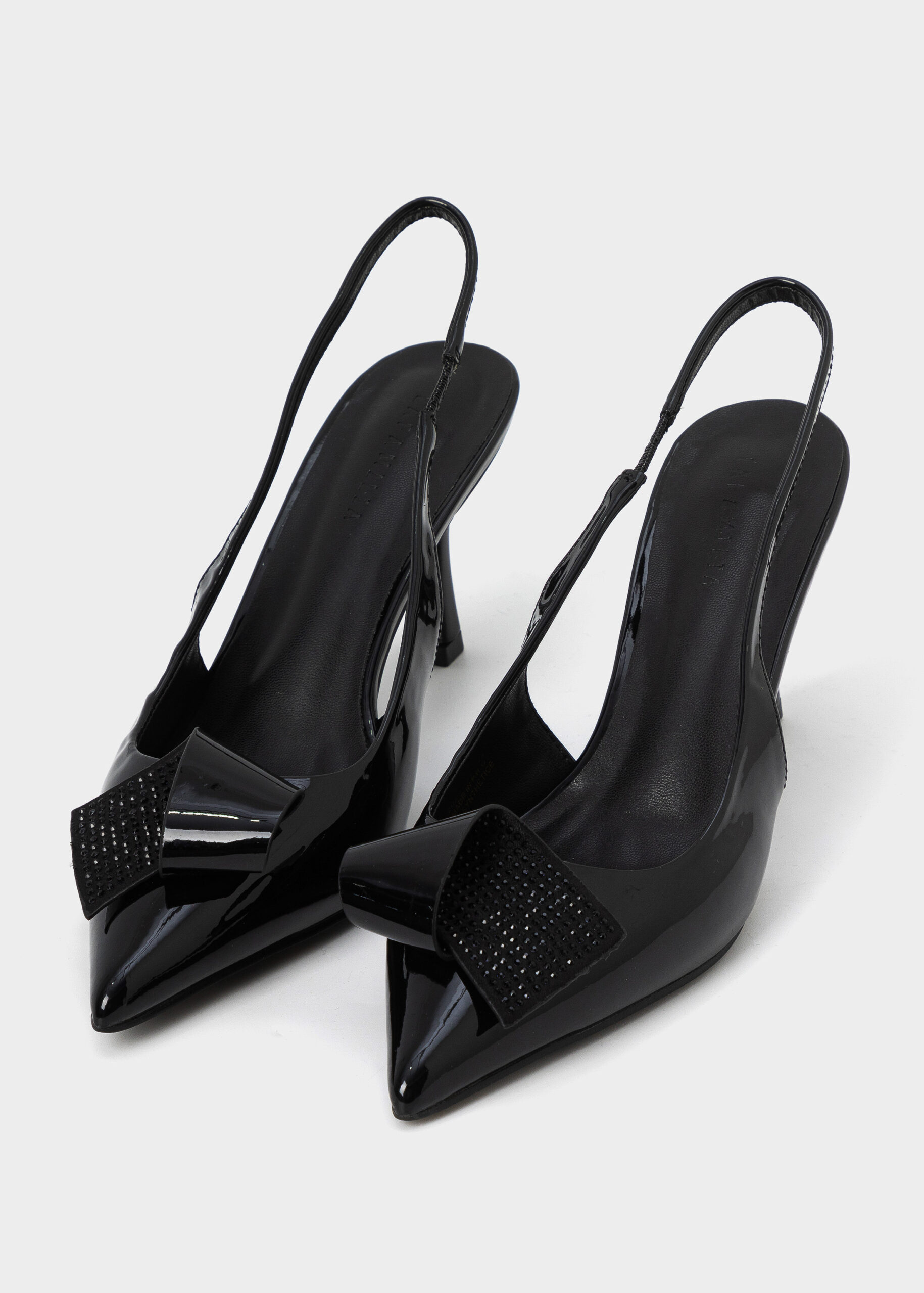 Women sandal, patent leather, point toe, elastic ankle strap, heels, upper strass piece decor, unique and modern