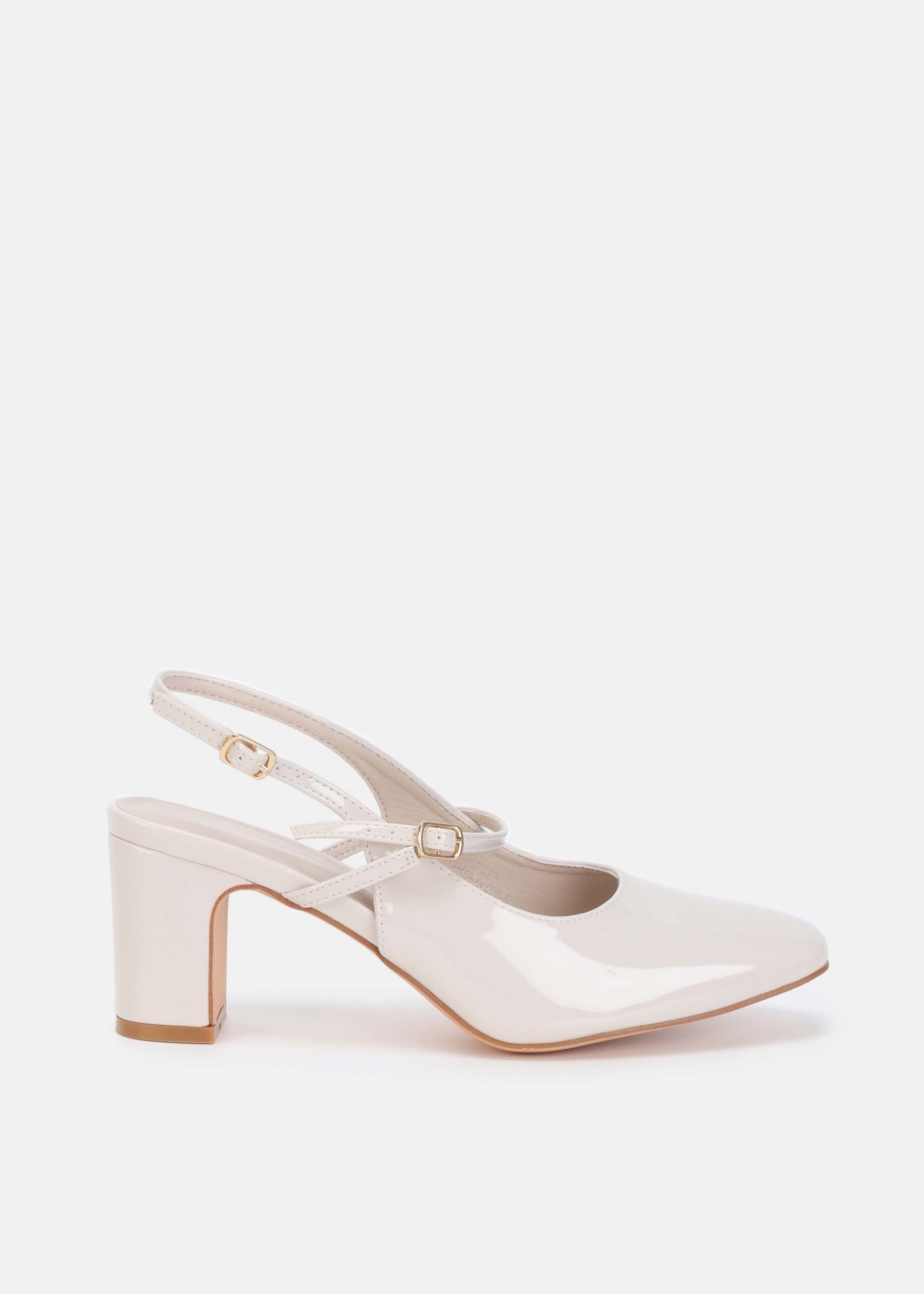 Women sandal, patent-leather, round toe, chunky heels, ankle strap with side buckle, unique and modern