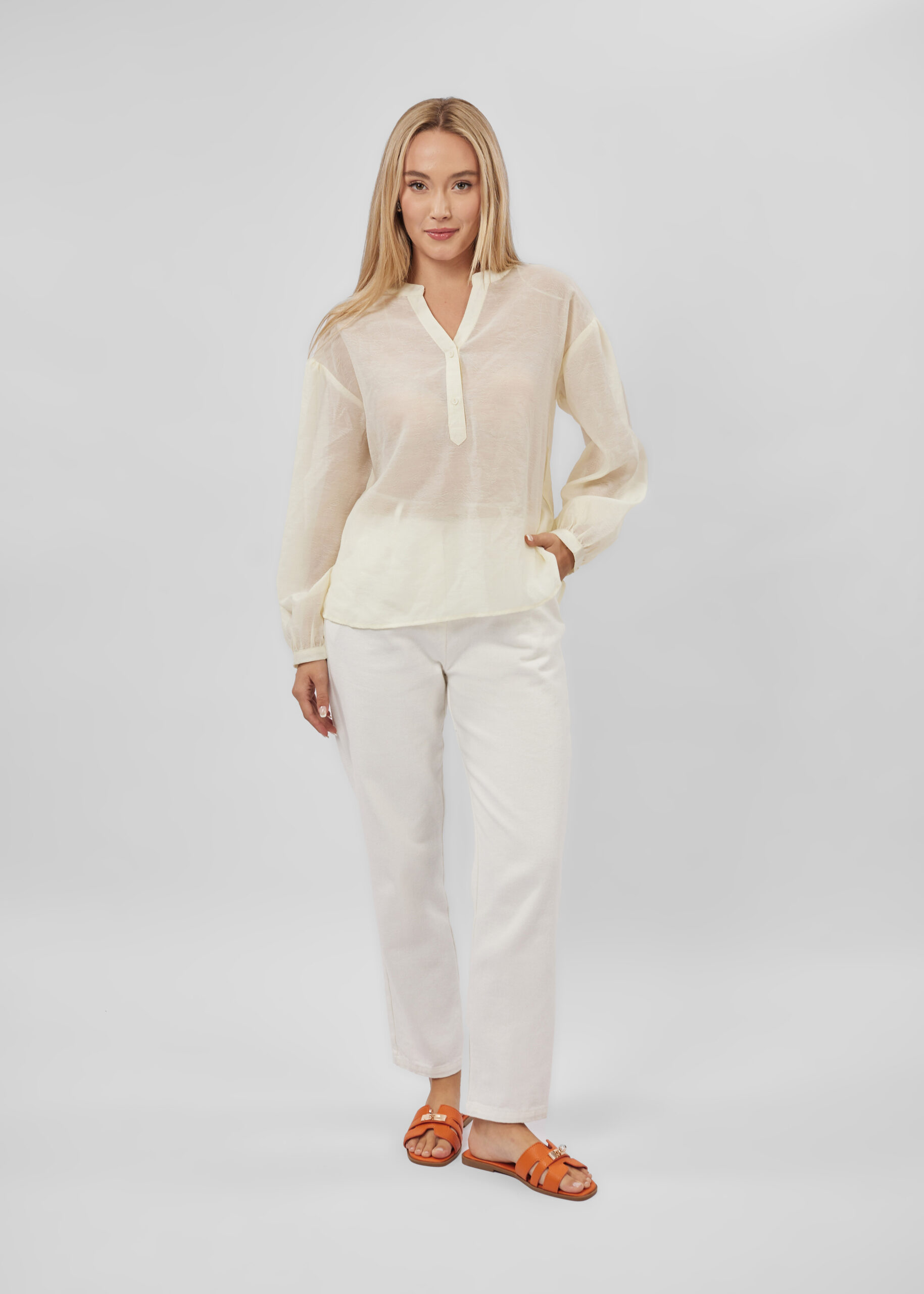 Women blouse, patterned, V neck with front buttons to close, long sleeves with tight cuff, unique and modern