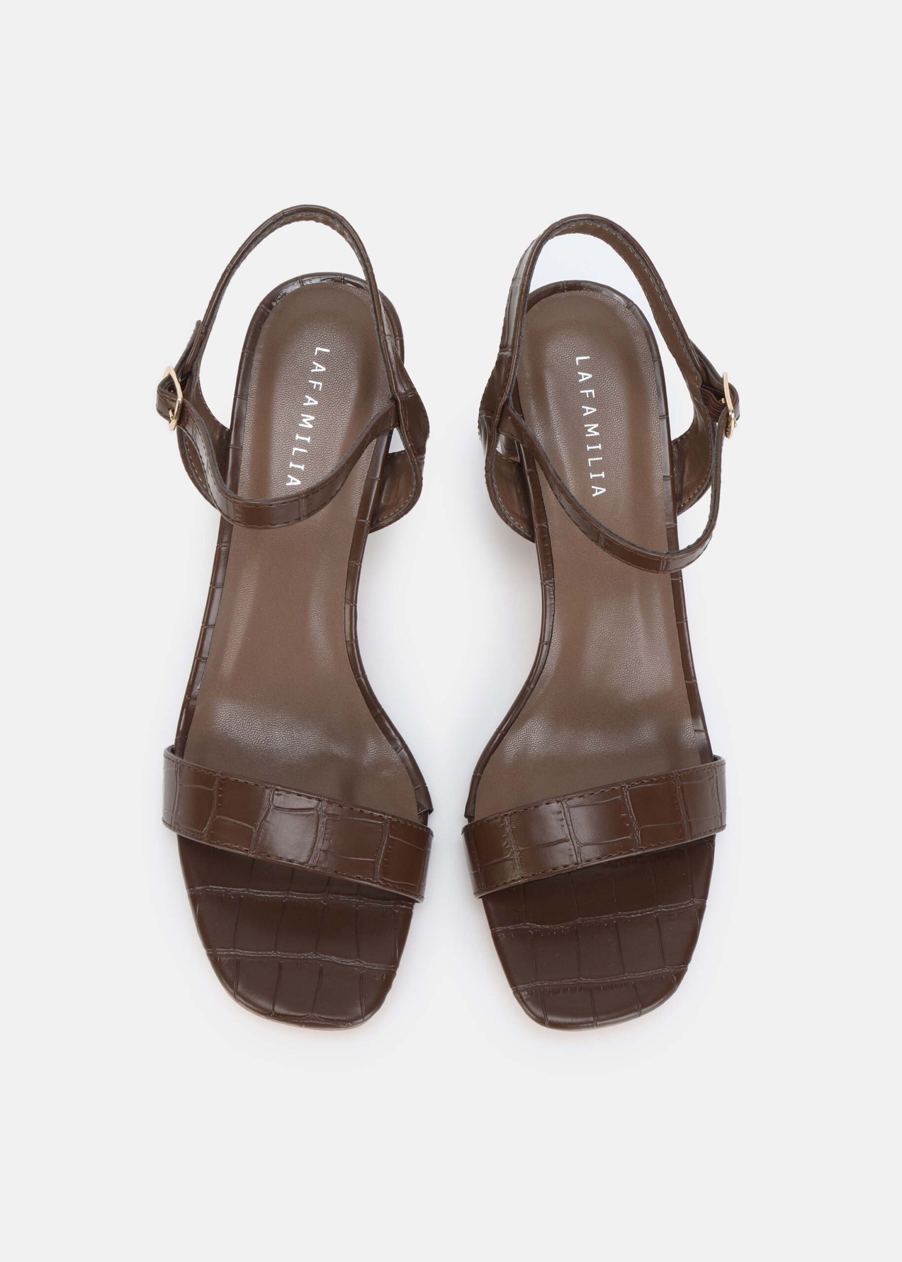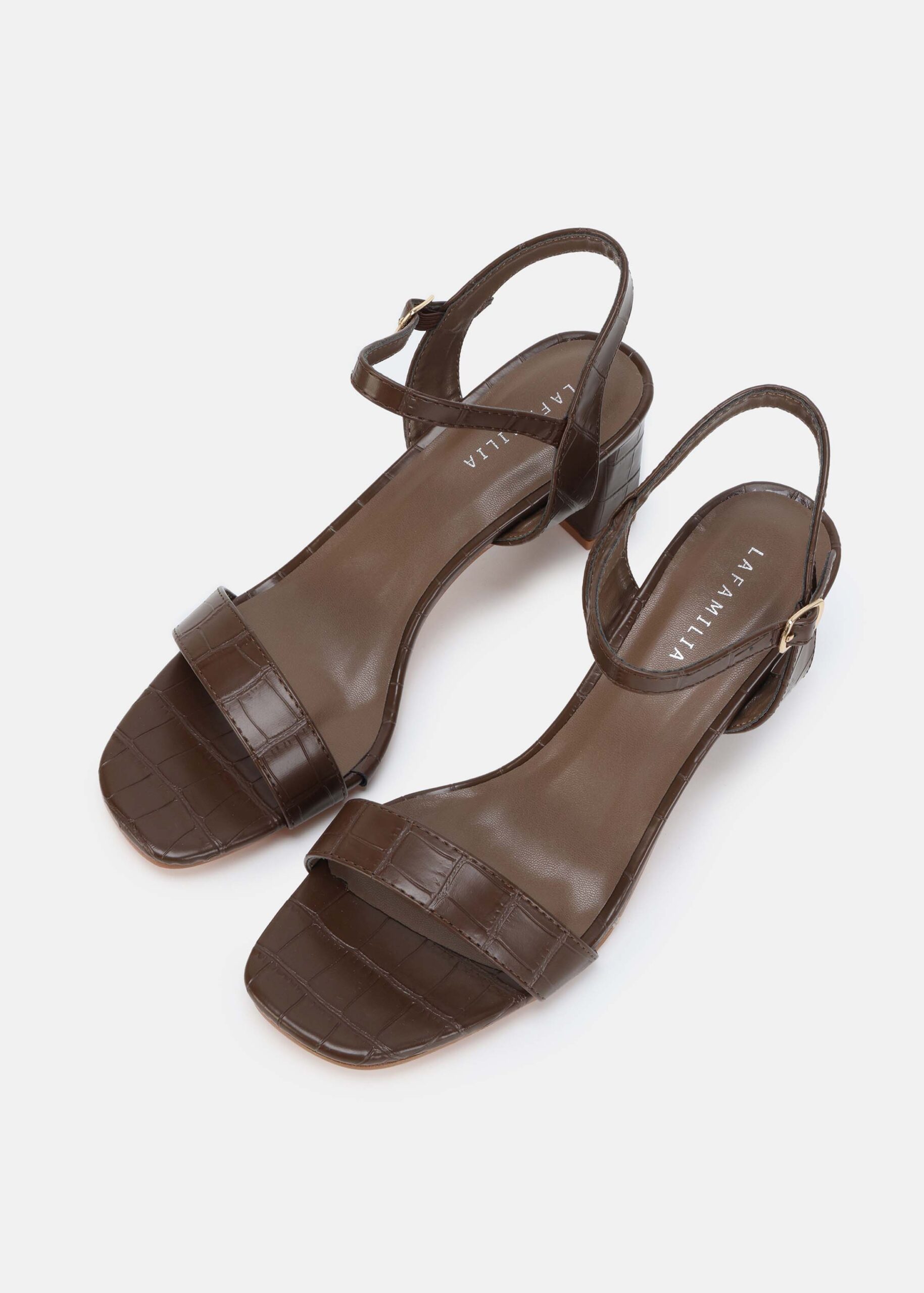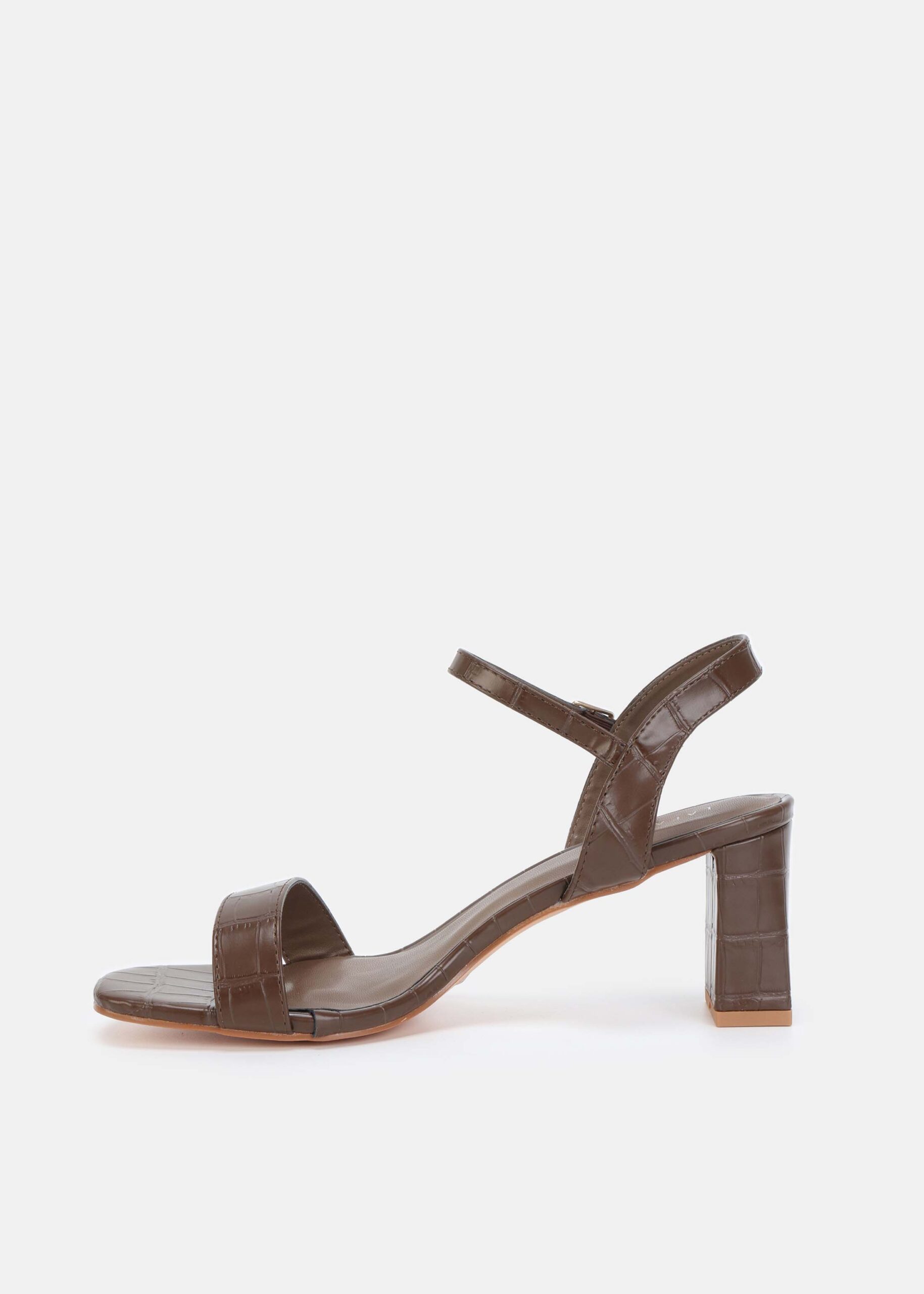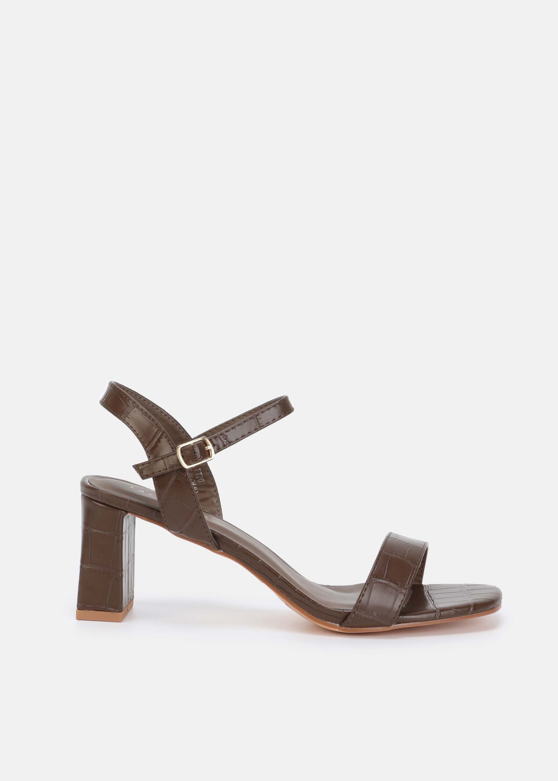 Women sandal, patterned leather, open square toe, heels, ankle strap with side buckle, unique and modern