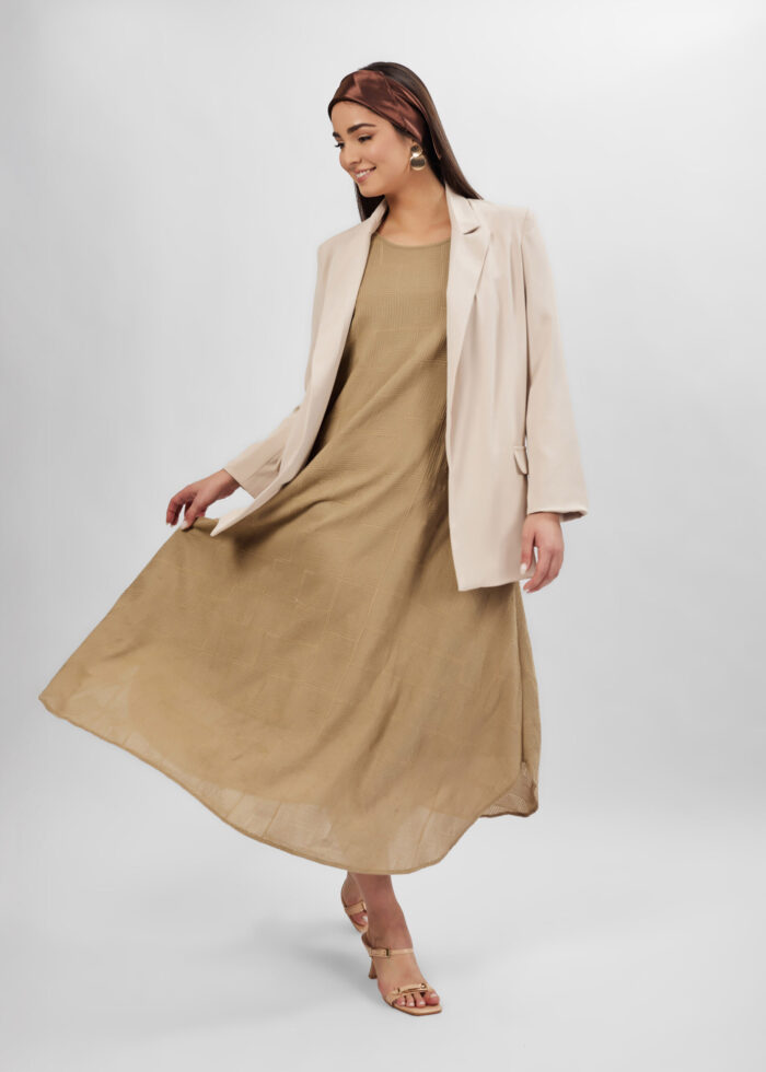 Women dress, patterned, midi length, round neck, back zipper closure, sleeveless, varying length, unique and modern