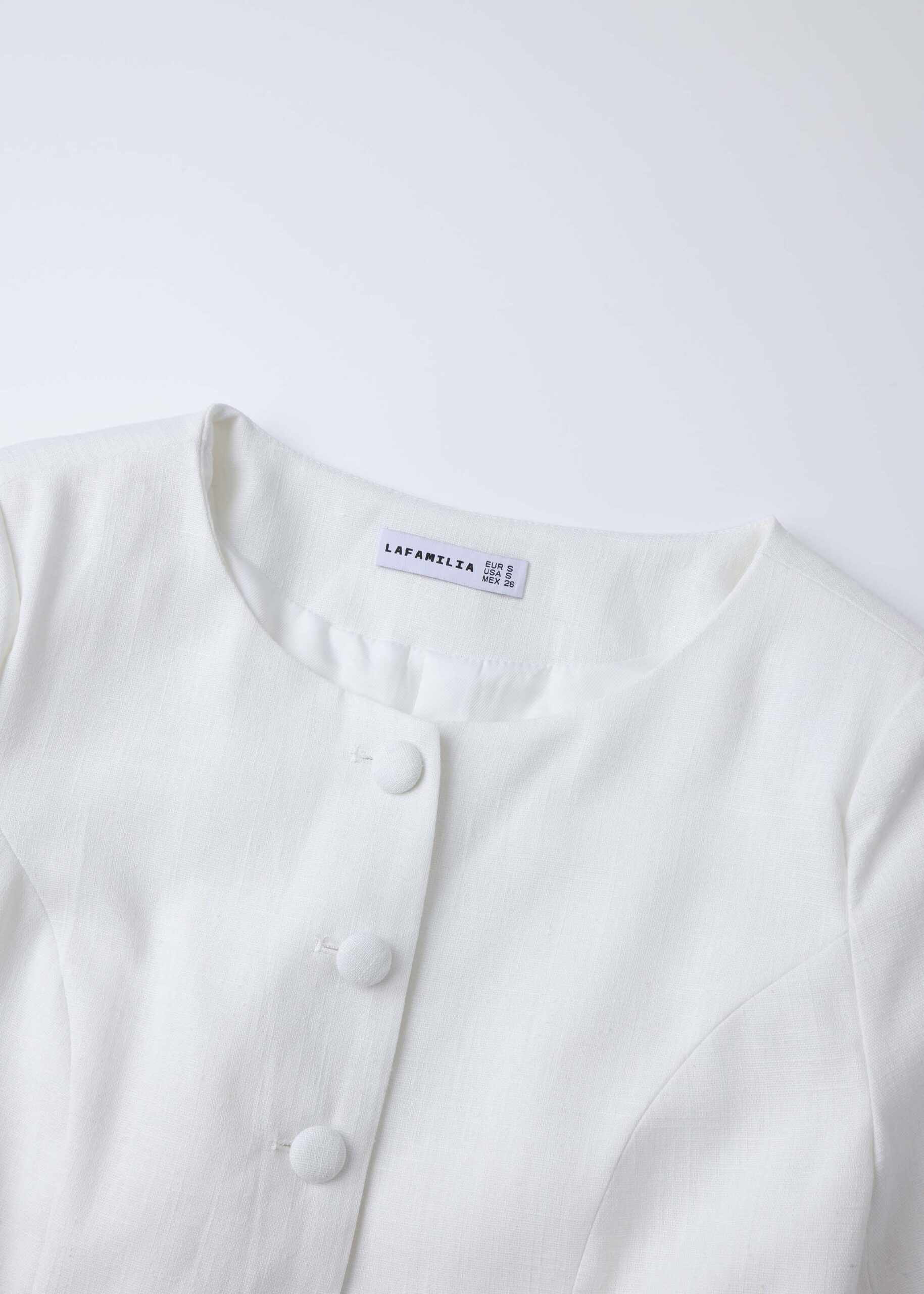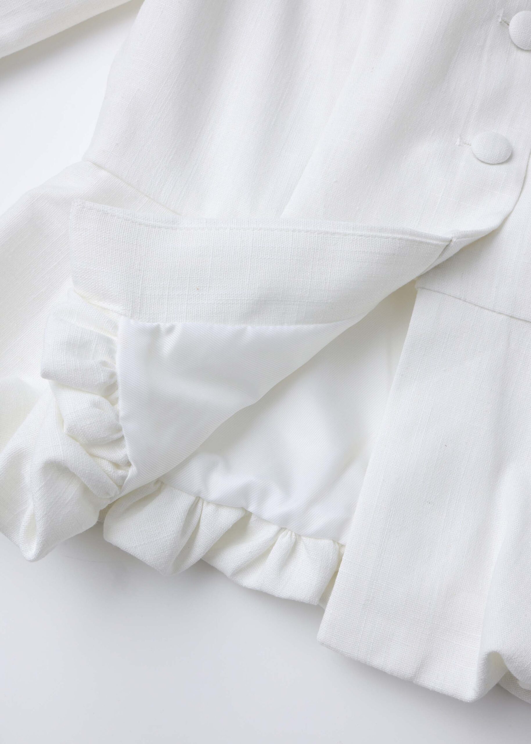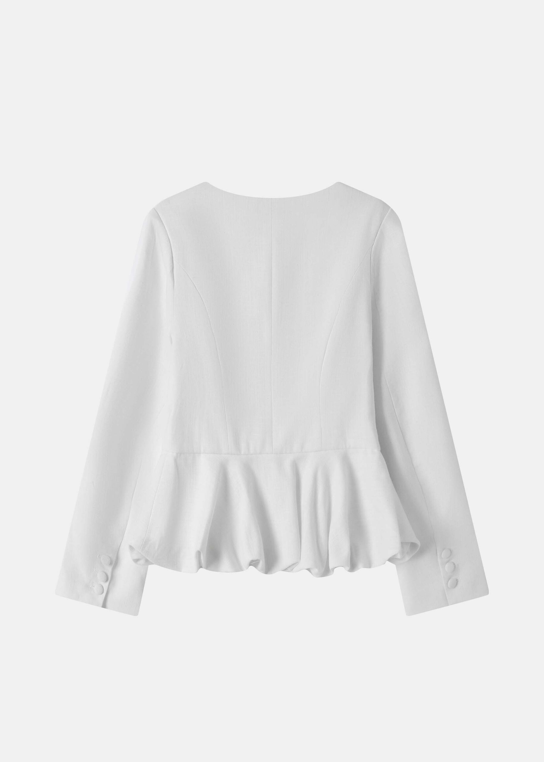Women jacket, peplum style, round neck, front buttons to close, long sleeves with buttons, unique and modern