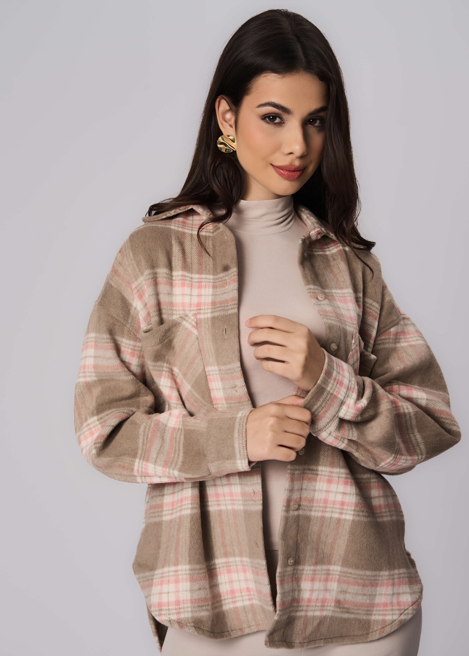 Women shirt, plaid, rolled collar with front button, long sleeves, tight cuff, front buttons to close, front pockets, unique and practical