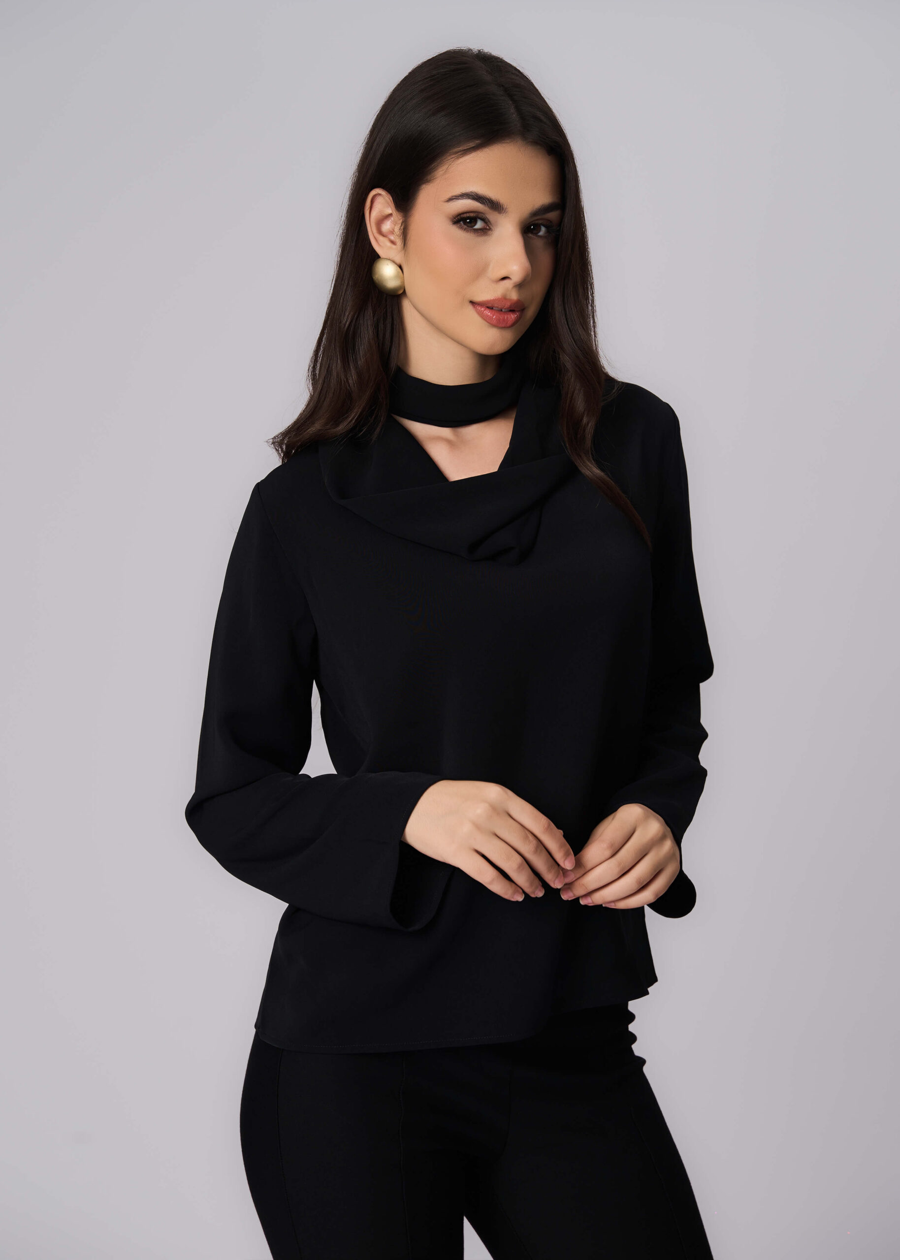 Women blouse, plain, stand collar with back button to close, with front cut out and scarf design, long sleeves, unique and modern
