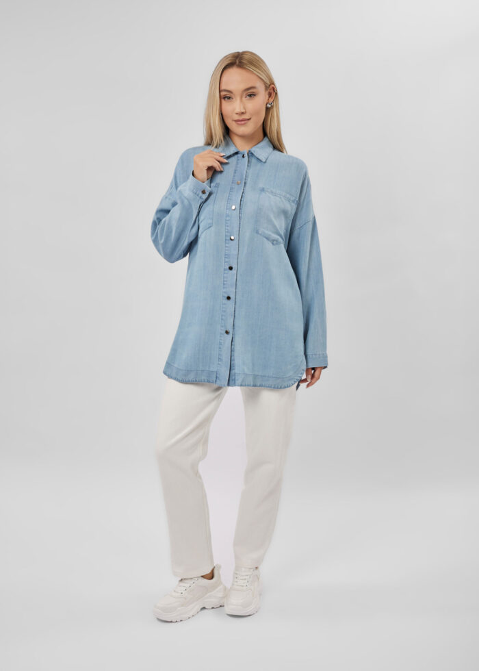 Women shirt, denim, plain, front buttons to close, rolled collar, long sleeves with tight cuff, front pockets, unique and practical